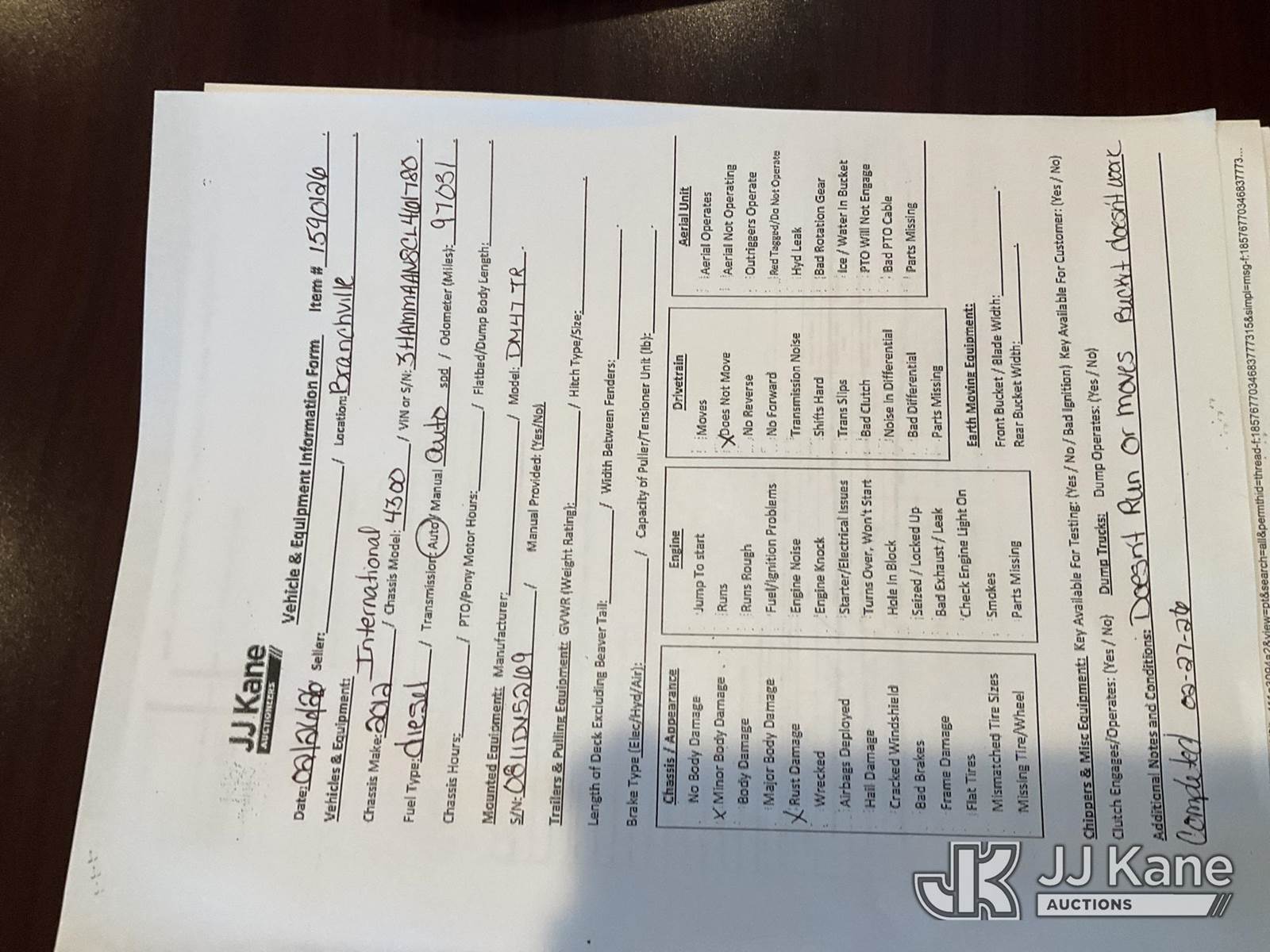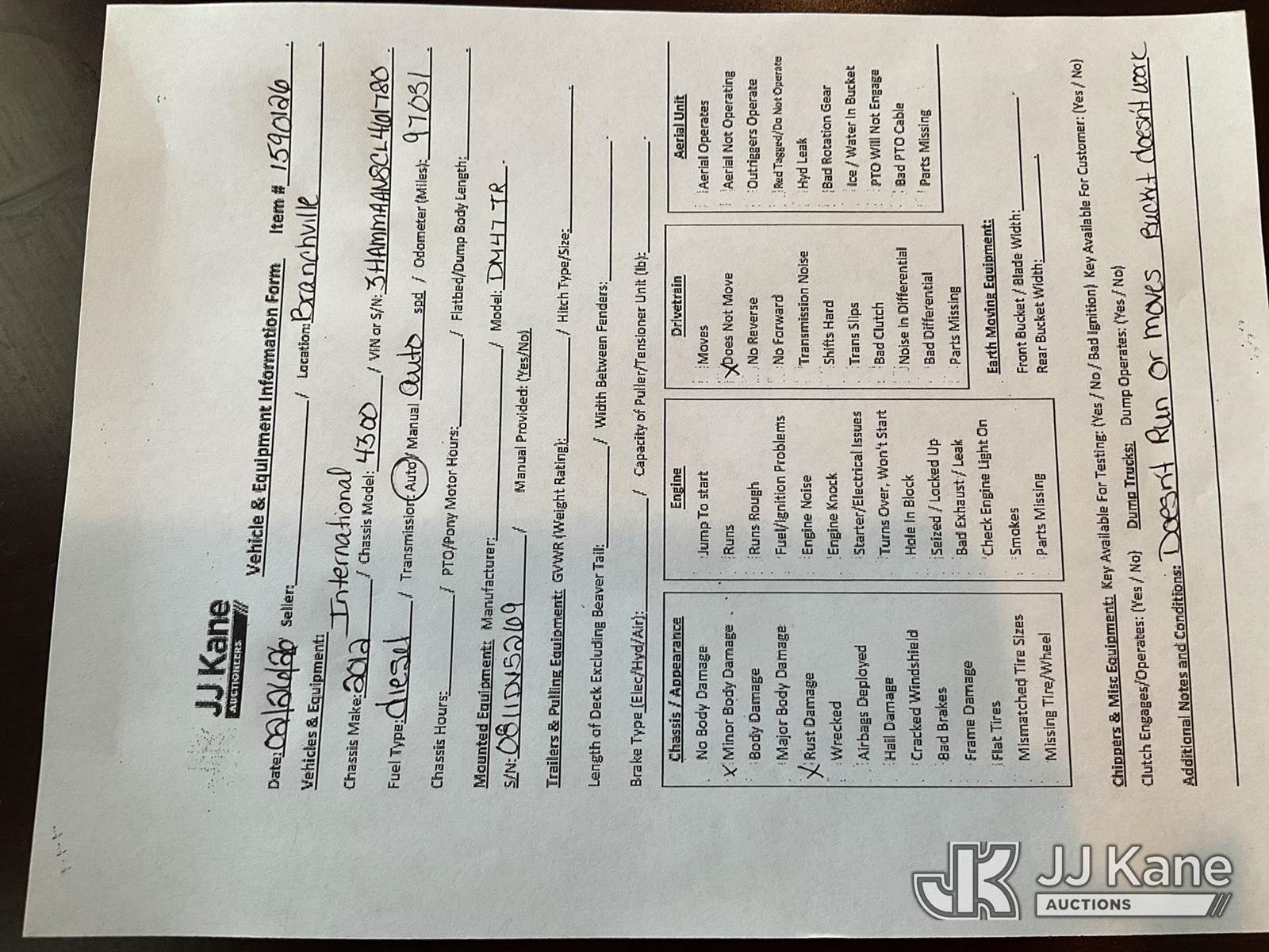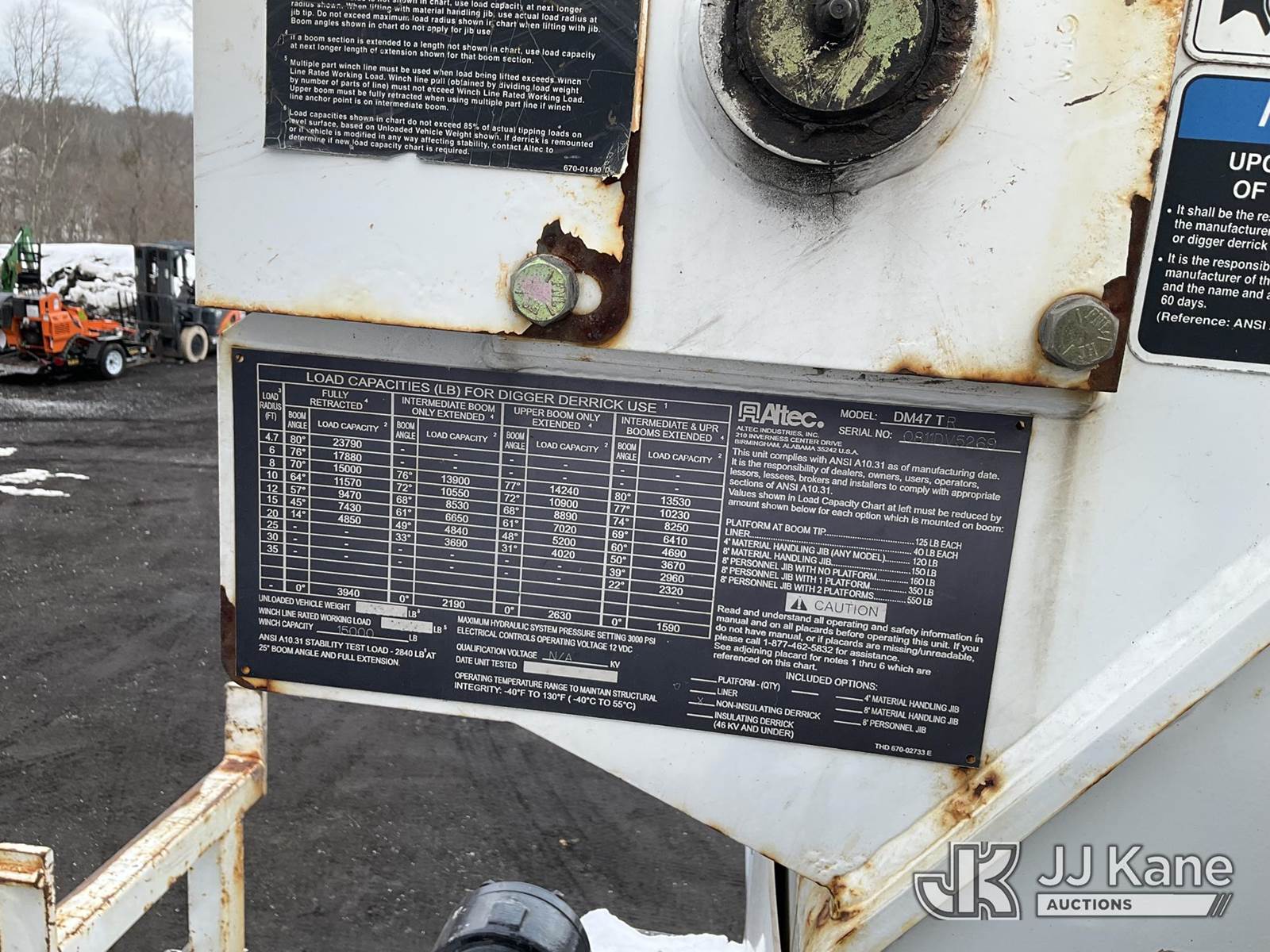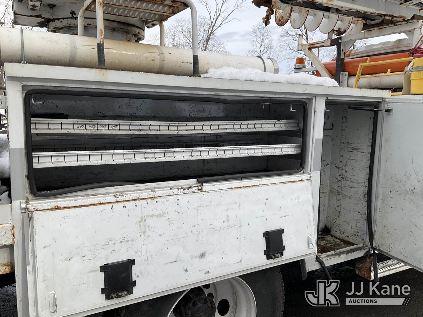 Altec DM47-TR, 23,790 Lb Digger Derrick s/n 0811DV5269, with 47 ft Sheave Height, 3-Section Boom, 2 Spd Digger, Pole Grabs, Heel Winch, Riding Console & 4 Outriggers, rear mounted on 2012 International 4300 Utility Truck, MaxxForce 7.6L diesel, Auto, A/C, (97,031 miles) (Not Running, Condition Unknown, Upper Condition Unknown, Rear Axle Out, Must Tow) (The manufacturer has notified JJ Kane that this equipment is subject to an open recall. CSN 568 Auger Extension Shaft Hub Inspection CSN 713A Reinforcement Plate Installation The equipment should not be operated until this is addressed. Buyer is responsible for reviewing the recall notice and contacting the manufacturer to schedule the recommended corrective actions. Associated costs may be covered by the manufacturer in some cases.) (Removal is by Appointment Only, Buyer MUST make a appointment prior to picking up, Buyer/Transporter Must have PAID IN FULL RELEASE. No onsite assistance available, Please Come prepared.) This is a Titled Item NOTE: This unit is being sold AS IS/WHERE IS via Timed Auction and is located in Branchville, NJ. Inspection & preview days for this unit are by appointment only; please contact us at contact@jjkane.com or 84-Go-JJKane for more details. For pre-sale questions, please contact the on-site office @ (973) 948-2026 or wtrbranchville@gmail.com. (Missing manuals, See Auction Company for Manufacturers Information to obtain manuals) (Buyer is responsible for removal. Assistance by consignor or JJ Kane Auctions is not assured.)