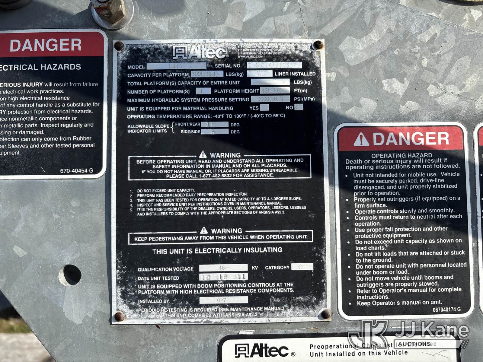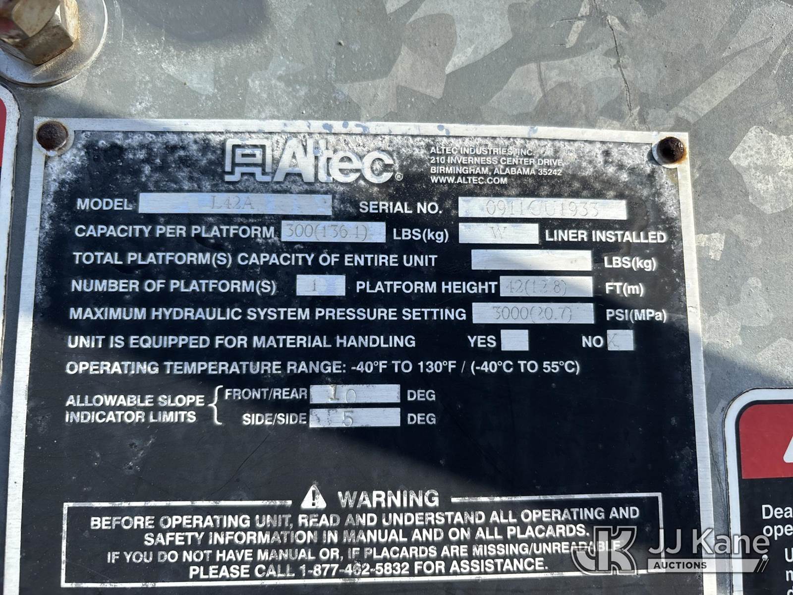 Altec L42A, 47 ft, Over-Center Bucket s/n 0911CU1933, with single-man bucket, galvanized lower boom, rear mounted on 2012 International 7300 Utility Truck, Maxxforce DT 4X2, diesel, Auto, A/C, (191,890 miles) (Runs, Moves, & Operates) (Body & Paint Damage) (FL Residents Purchasing Titled Items - tax, title & registration fees will be collected at the maximum rate of $400.00 under 25,999 and $800.00 for Over 26,000 and $250.00 trailers - Proof of insurance is mandatory; Out of State Residents Purchasing Title Items - tax will be collected based upon your state rate.) This is a Titled Item NOTE: This unit is being sold AS IS/WHERE IS via Timed Auction and is located in Riviera Beach, FL. An inspection day for FPL auction items will be conducted on the Friday before the auction from 8a-3p at 2455 Port West Boulevard, Riviera Beach, FL 33407. Winning Buyer/Hauler must present copy of paid invoice upon arrival to pick up. For load out and pick up information, please reference the release form sent out after purchase. Any more information please call Andy Garcia @ 561-215-0085. (Manuals provided in cab) Sales Tax Collected Based on Residency (Buyer is responsible for removal. Assistance by consignor or JJ Kane Auctions is not assured.)