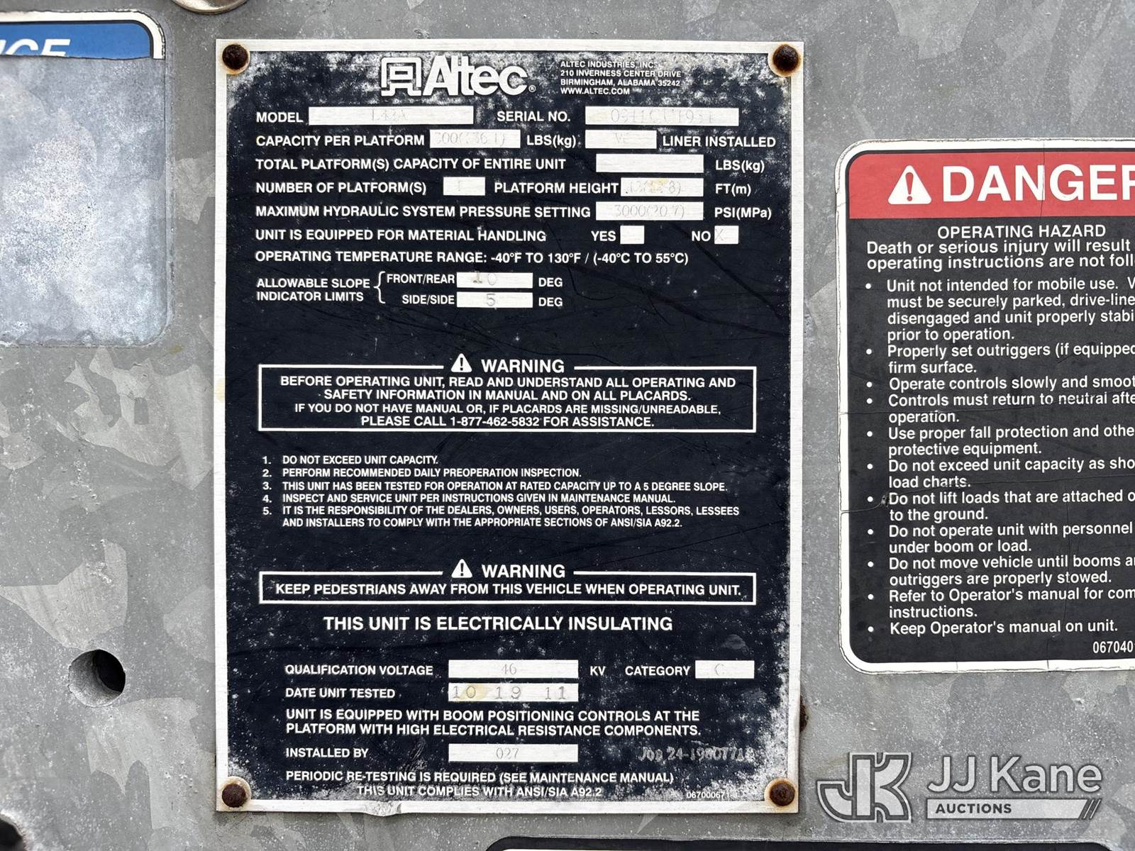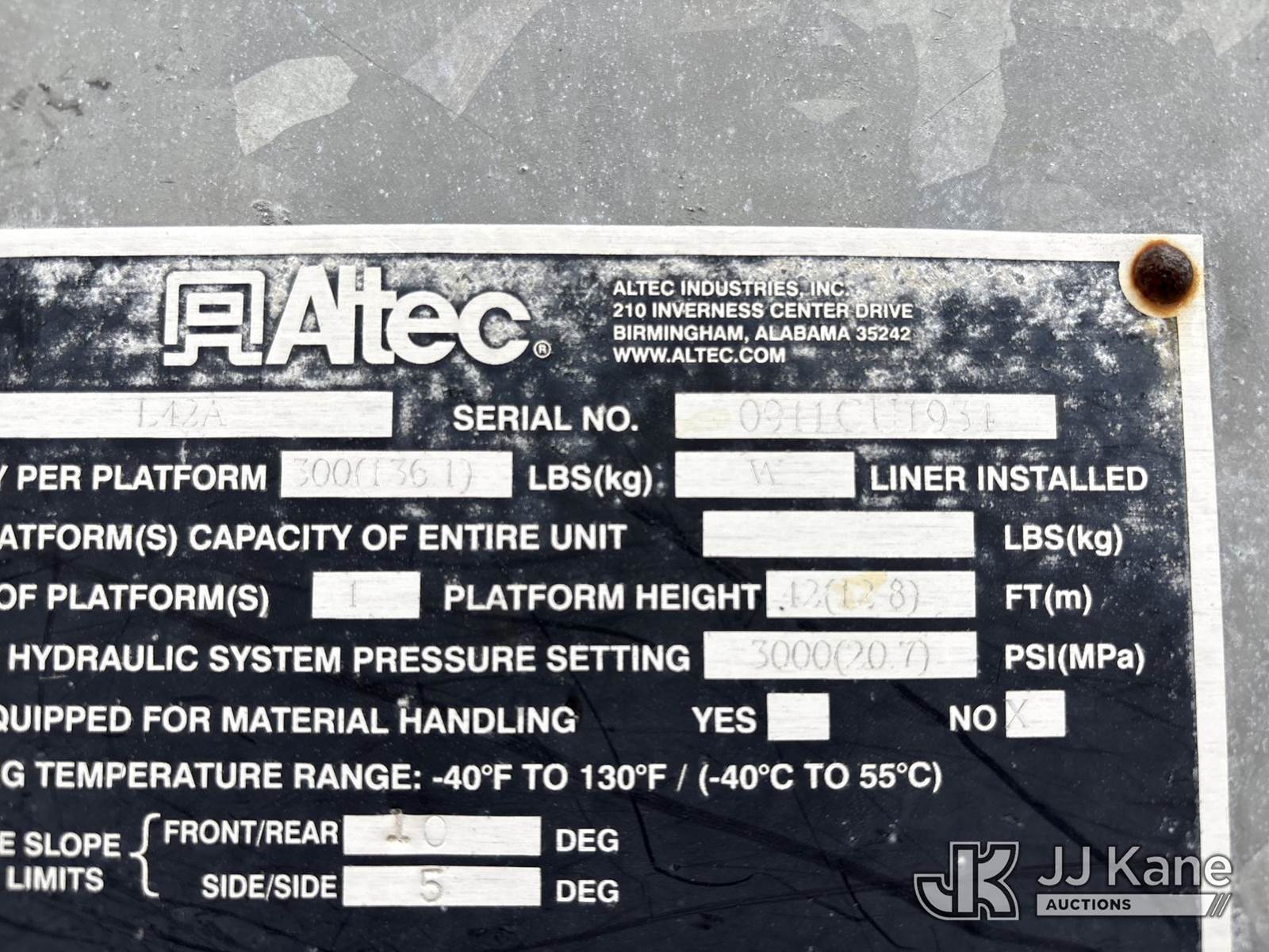 Altec L42A, 47 ft, Over-Center Bucket Truck s/n 0911CU1934, with single-man bucket, center mounted on 2012 International 7300 Utility Truck, 7.6L L6 Diesel, 4X2, Auto, A/C, (67,652 miles) (Not Running, Condition Unknown, Upper Condition Unknown) (Reads 11,316 hours) This is a Titled Item NOTE: This unit is being sold AS IS/WHERE IS via Timed Auction and is located in North Augusta, SC. For more information & removal arrangements please contact JT Thomas @ 762-291-7932. (Missing manuals, See Auction Company for Manufacturers Information to obtain manuals) (Buyer is responsible for removal. Assistance by consignor or JJ Kane Auctions is not assured.)