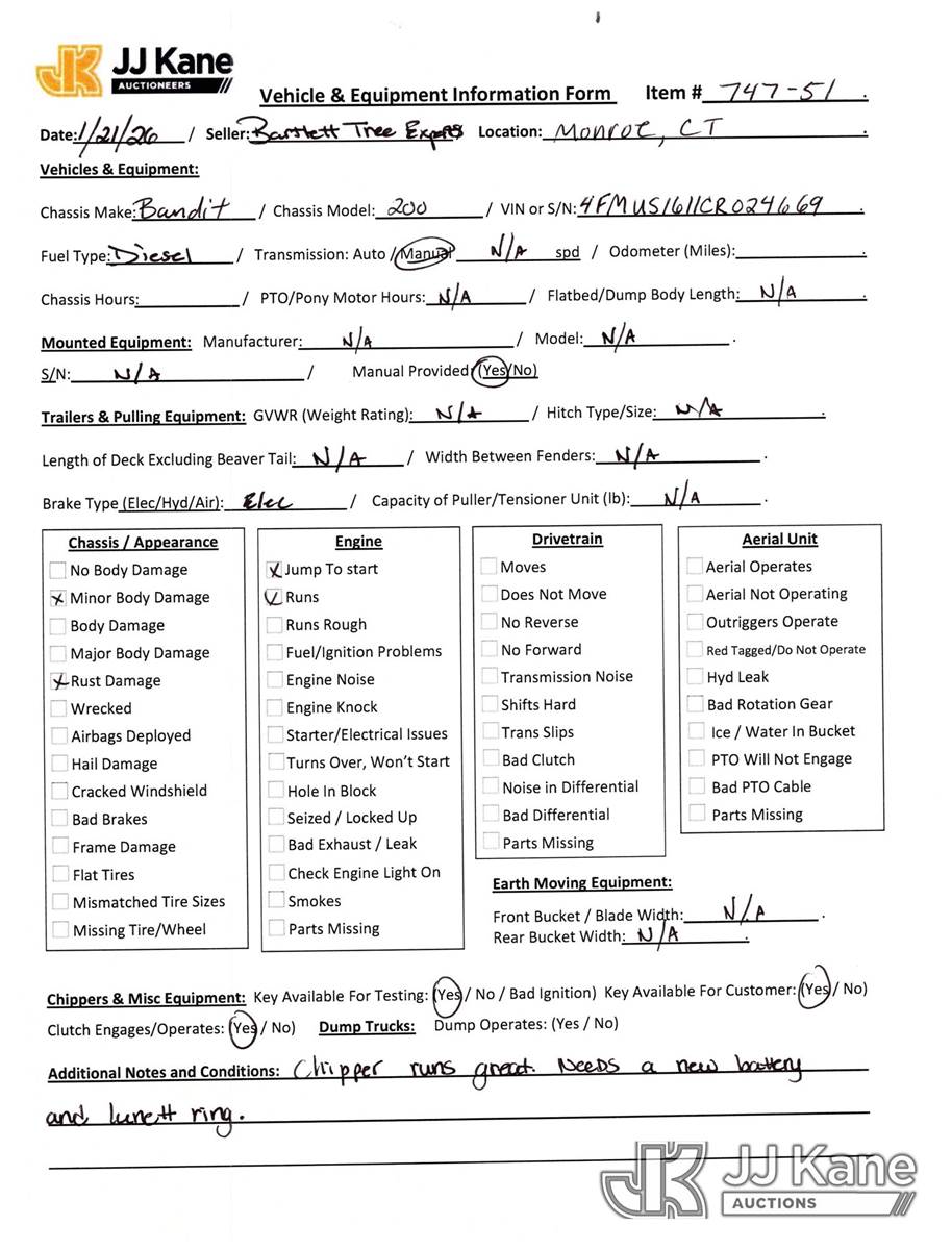 2012 Bandit 200 Chipper (12in Drum), s/n 4FMUS1611CR024669, Cat diesel, trailer mtd. (No Title) (Runs, Jump To Start, Needs New Battery, Body/Rust Damage) NOTE: This unit is being sold AS IS/WHERE IS via Timed Auction and is located in Monroe, CT. Inspection & preview days for this unit are by appointment only; please contact us at contact@jjkane.com or 84-Go-JJKane for more details. (Buyer is responsible for removal. Assistance by consignor or JJ Kane Auctions is not assured.)