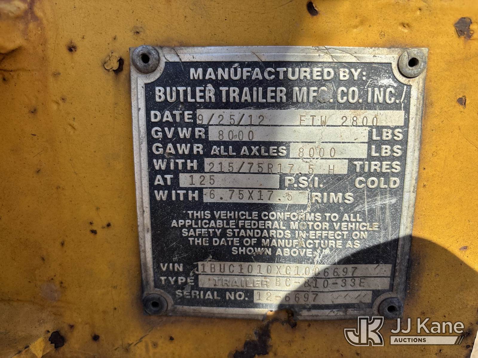 2012 Butler BC-810-33E S/A Tagalong Utility Trailer, with 10 ft. long, (Body & Paint Damage) (FL Residents Purchasing Titled Items – tax, title & registration fees will be collected at the maximum rate of $400.00 under 25,999 and $800.00 for Over 26,000 and $250.00 trailers – Proof of insurance is mandatory; Out of State Residents Purchasing Title Items – tax will be collected based upon your state rate.) This is a Titled Item NOTE: This unit is being sold AS IS/WHERE IS via Timed Auction and is located in Westlake, FL. Inspection & preview days for this unit are the 2 business days prior to the first day of items closing for this auction, item is located at 4003 Seminole Pratt Whitney Rd Westlake, FL 33470 and hours of operations are 8a-4p. For pre-sale questions, please contact: Matt Johnson @ (205) 847-9106. (Buyer is responsible for removal. Assistance by consignor or JJ Kane Auctions is not assured.)