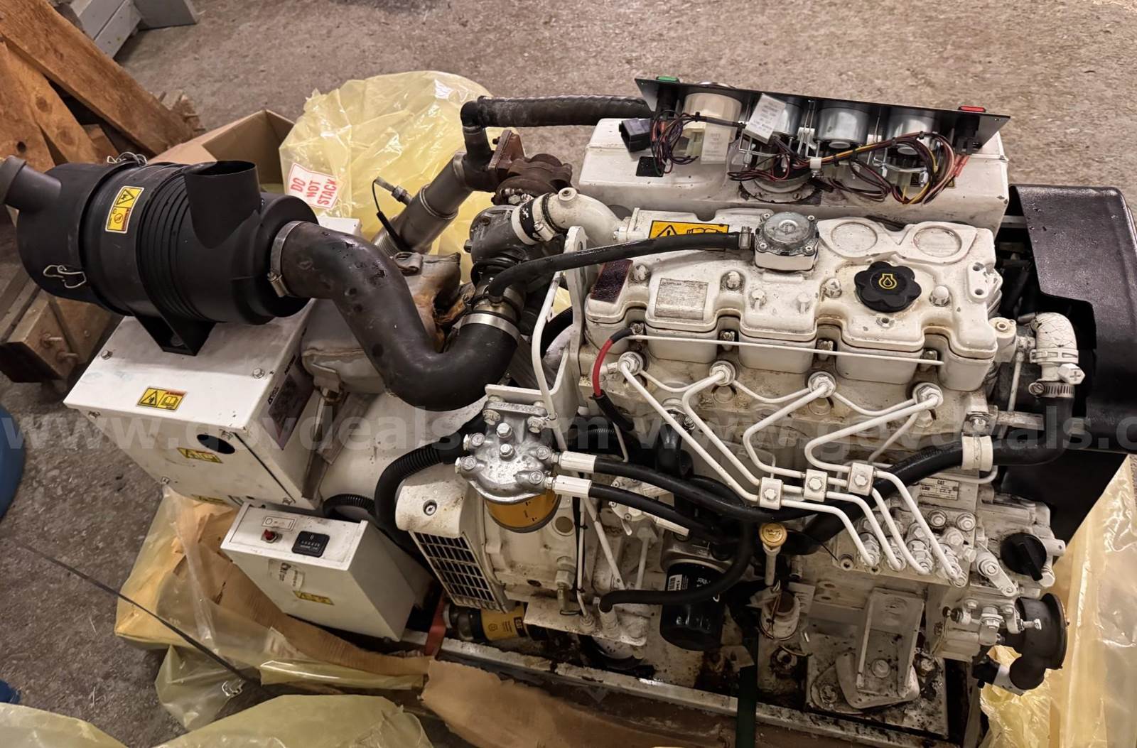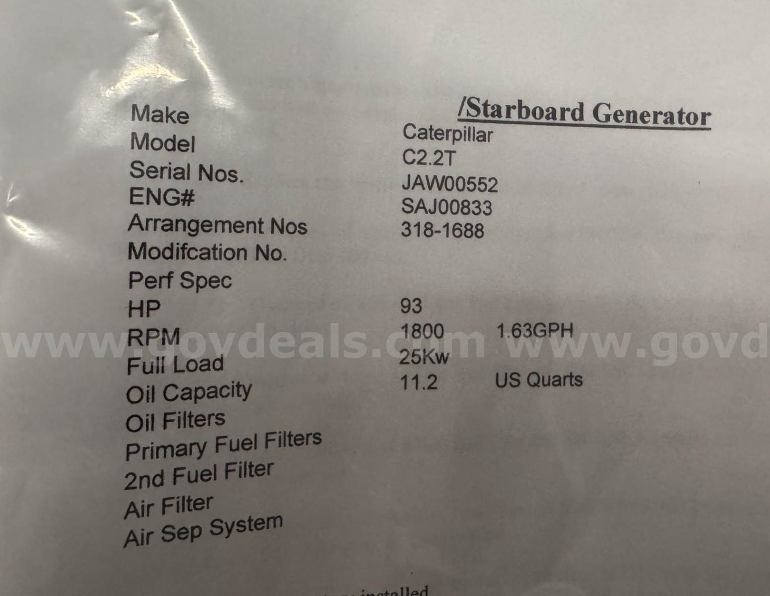 2012 Caterpillar Auxiliary Engine, 2012 Caterpillar C2.2T 25Kw marine generator with 13071 hours. This is a 3 Phase 480Volts 60Hz generator re-strapped to Single Phase 240/120 Volts 60Hz. Wet exhaust, coolant and oil have been drained. Taken out of service for replacement. Runs, but needs maintenance.