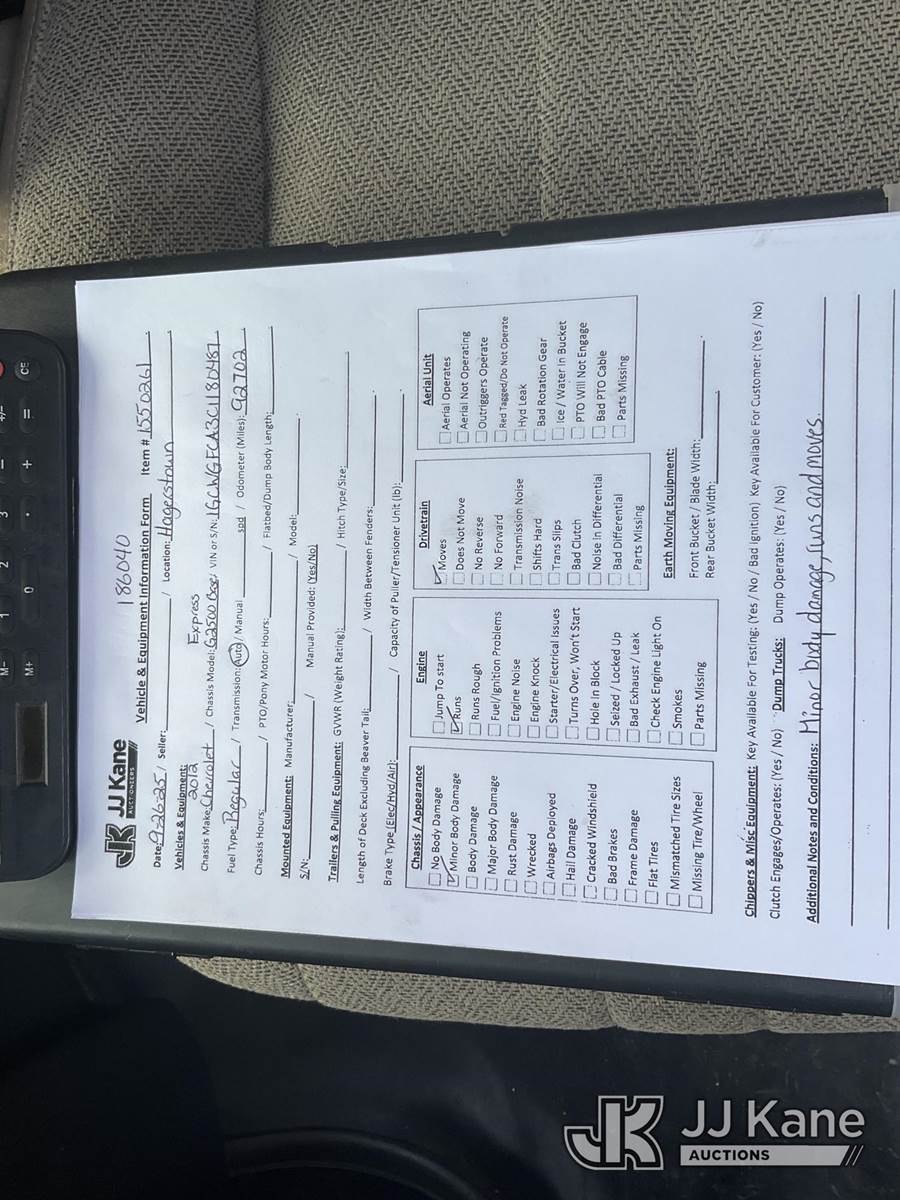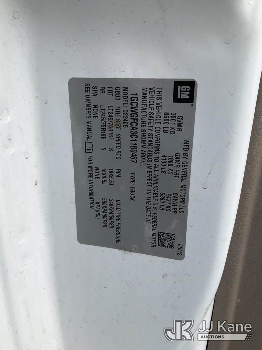 2012 Chevrolet Express 2500 Cargo Van, 8-cyl gas, 6-Speed Automatic, A/C, (92,702 miles) (Runs & Moves) (Check Engine Light On, Body Damage) This is a Titled Item NOTE: This unit is being sold AS IS/WHERE IS via Timed Auction and is located in Hagerstown, MD. Inspection & preview days for this unit are by appointment only; please contact us at contact@jjkane.com or 84-Go-JJKane for more details. For pre-sale questions, please contact the on-site office @ (301) 895-7777 or Kevin.Waggoner@JJKane.com. (Buyer is responsible for removal. Assistance by consignor or JJ Kane Auctioneers is not assured.)