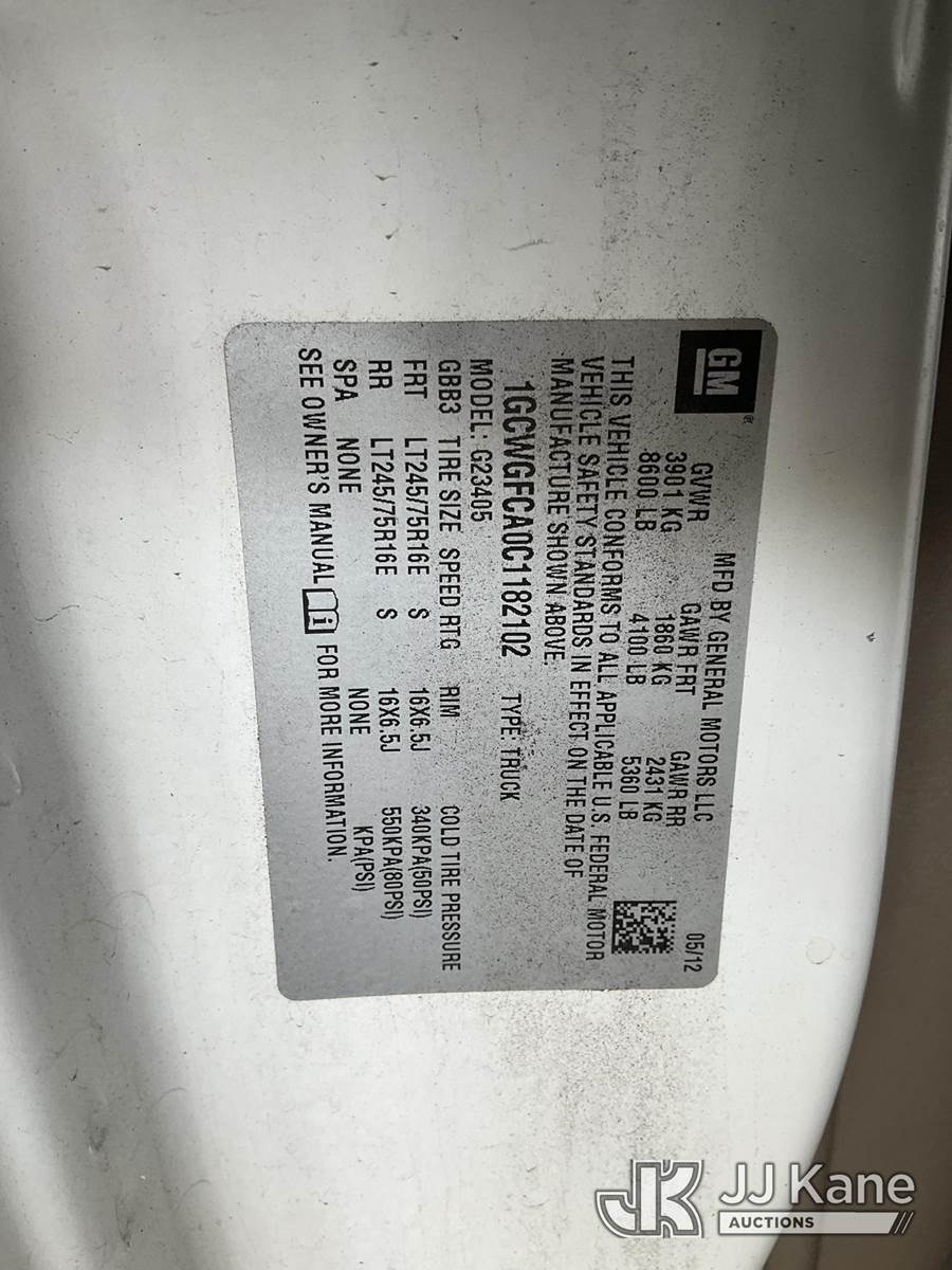 2012 Chevrolet Express 2500 Cargo Van, s/n 1GCWGFCA0C1182102, 4.8L V8 OHV 16V RWD, FFV, 6-Speed Automatic, A/C, with Ladder rack, (160,611 miles) (Runs & Moves, Engine Light On) (Bidding Restricted to Licensed Vehicle Dealers Only), This is a Titled Item NOTE: This unit is being sold AS IS/WHERE IS via Timed Auction and is located in Jurupa Valley, CA. Inspection & preview days for this unit are the 2 business days prior to the first day of items closing for this auction, item is located at 4510 Muth Way Jurupa Valley, CA 92509 and hours of operations are 8a-4p. For pre-sale questions, please contact please contact Office Staff @ (310) 353-7140. Dealer License Number 45696. (Buyer is responsible for removal. Assistance by consignor or JJ Kane Auctions is not assured.)