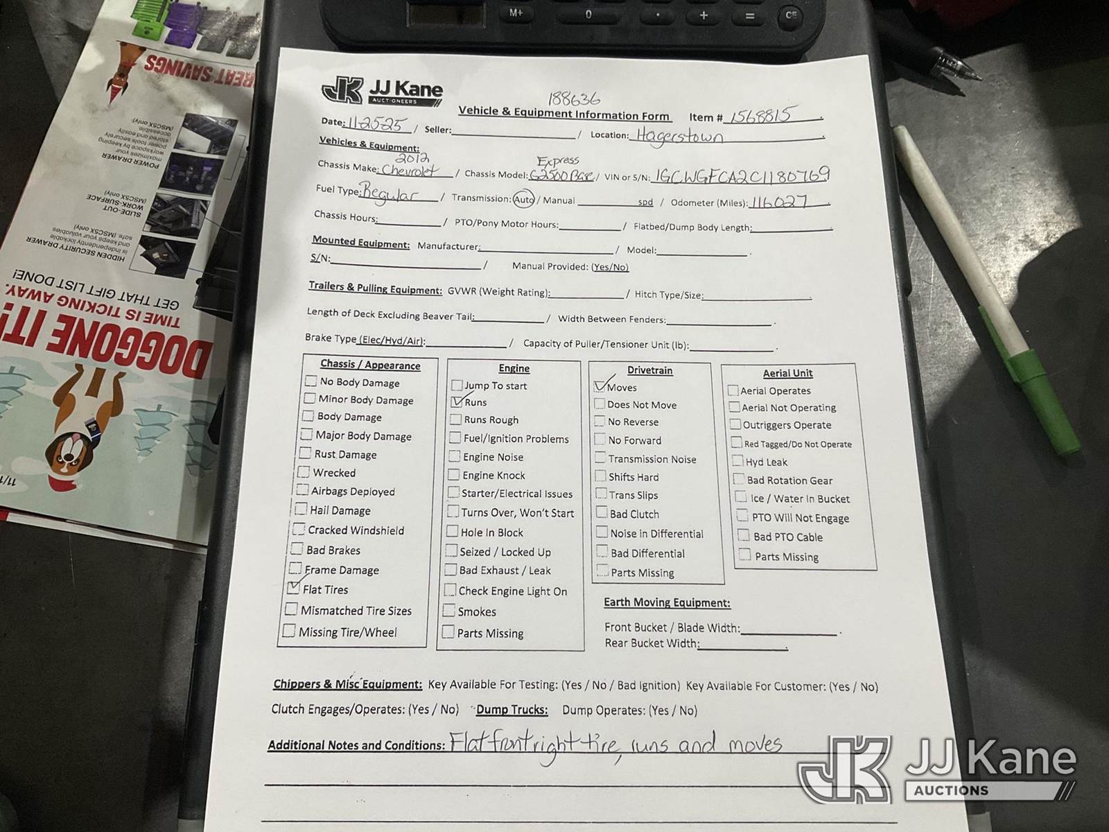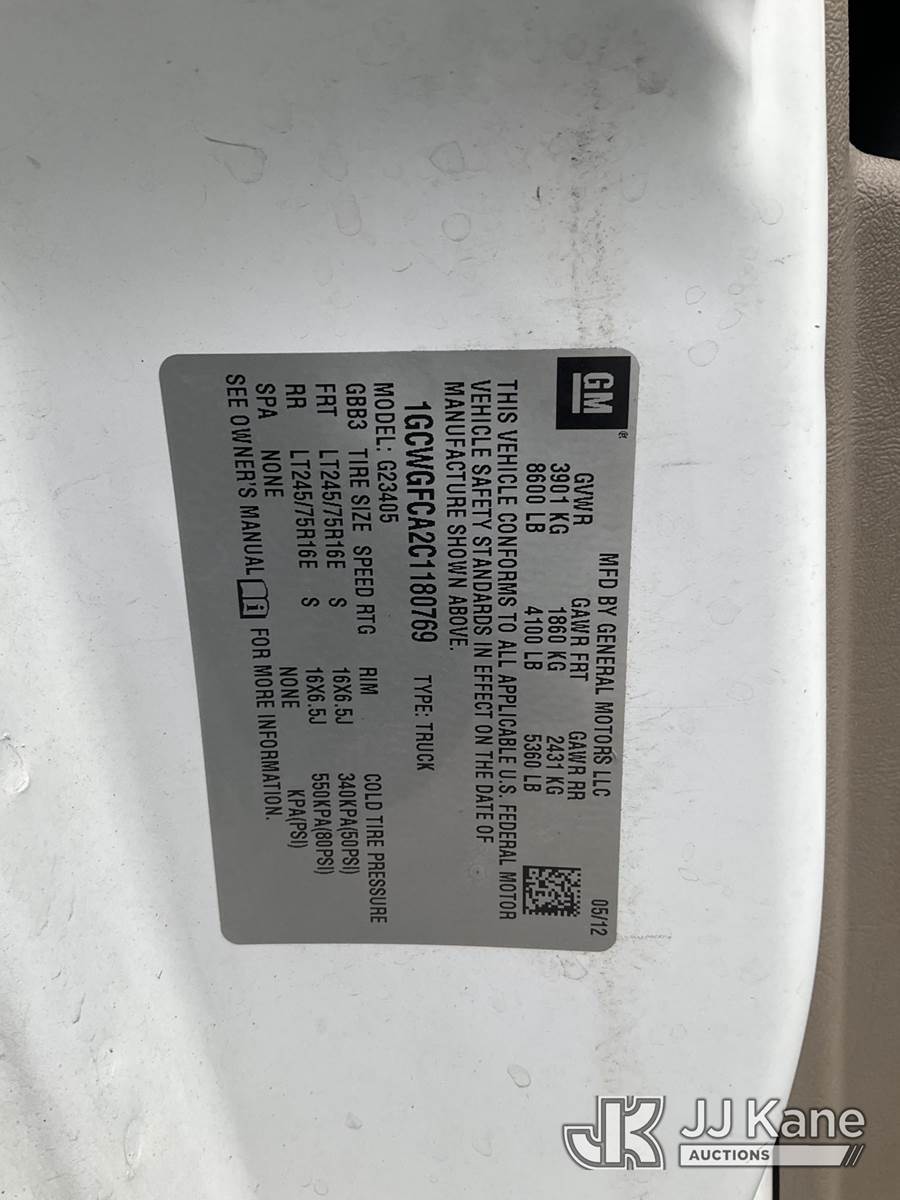 2012 Chevrolet Express G2500 Cargo Van, 4.8L V8 FFV, Auto, RWD, A/C, (116,027 miles) (Runs & Moves, Flat Tire, Check Engine Light On) This is a Titled Item NOTE: This unit is being sold AS IS/WHERE IS via Timed Auction and is located in Hagerstown, MD. Inspection & preview days for this unit are by appointment only; please contact us at contact@jjkane.com or 84-Go-JJKane for more details. For pre-sale questions, please contact the on-site office @ (301) 895-7777 or Kevin.Waggoner@JJKane.com. (Buyer is responsible for removal. Assistance by consignor or JJ Kane Auctioneers is not assured.)