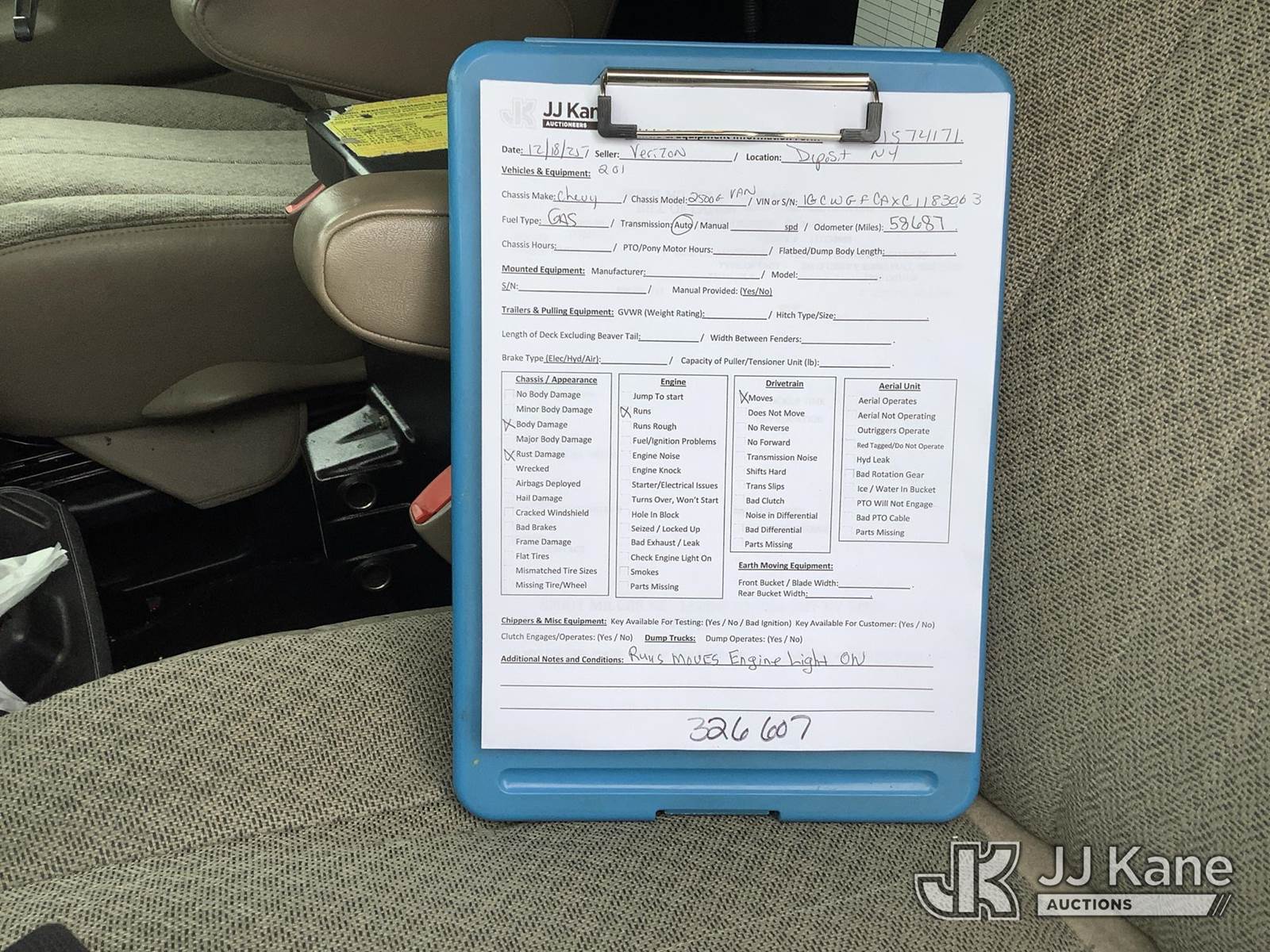 2012 Chevrolet Express G2500 Cargo Van, 8-cyl gas, Auto, A/C, (58,687 miles) (Runs & Moves) (Check Engine Light On, Body/Rust Damage) (Removal is by Appointment Only, Buyer MUST make a appointment prior to picking up, Buyer/Transporter Must have PAID IN FULL RELEASE. No onsite assistance available, Please Come prepared.) This is a Titled Item NOTE: This unit is being sold AS IS/WHERE IS via Timed Auction and is located in Deposit, NY. Inspection & preview days for this unit are by appointment only; please contact us at contact@jjkane.com or 84-Go-JJKane for more details. (Buyer is responsible for removal. Assistance by consignor or JJ Kane Auctions is not assured.)