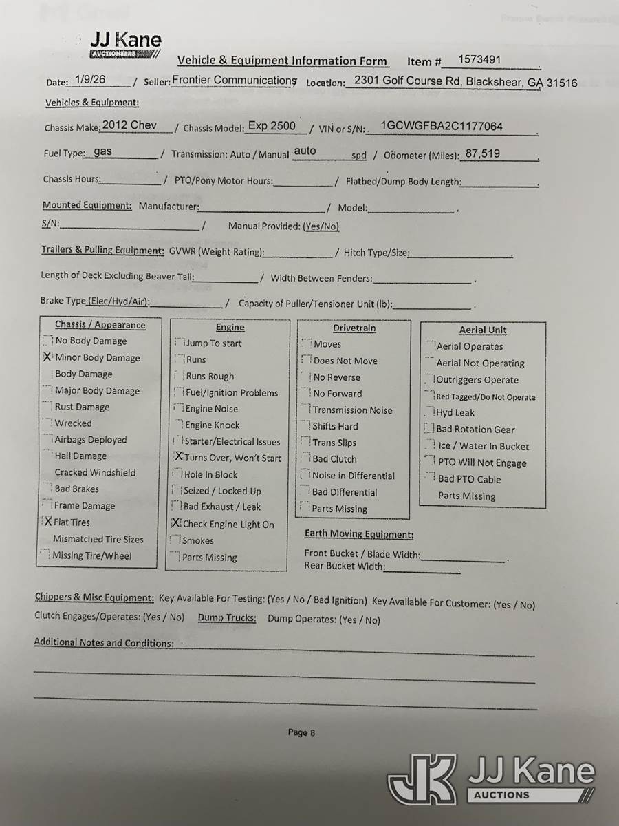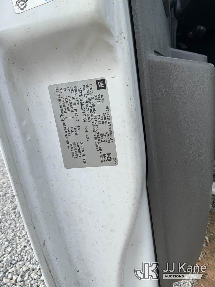 2012 Chevrolet Express G2500 Cargo Van, 4.8L V8 OHV 16V FFV gas, 6-Speed Automatic, RWD, A/C, (87,519 miles) (Not Running, Condition Unknown) (Turns Over But Won't Start, Flat Tires, Body/Paint Damage) This is a Titled Item NOTE: This unit is being sold AS IS/WHERE IS via Timed Auction and is located in Blackshear, GA. Inspection & preview days for this unit are by appointment only; please contact us at contact@jjkane.com or 84-Go-JJKane for more details. (Buyer is responsible for removal. Assistance by consignor or JJ Kane Auctions is not assured.)