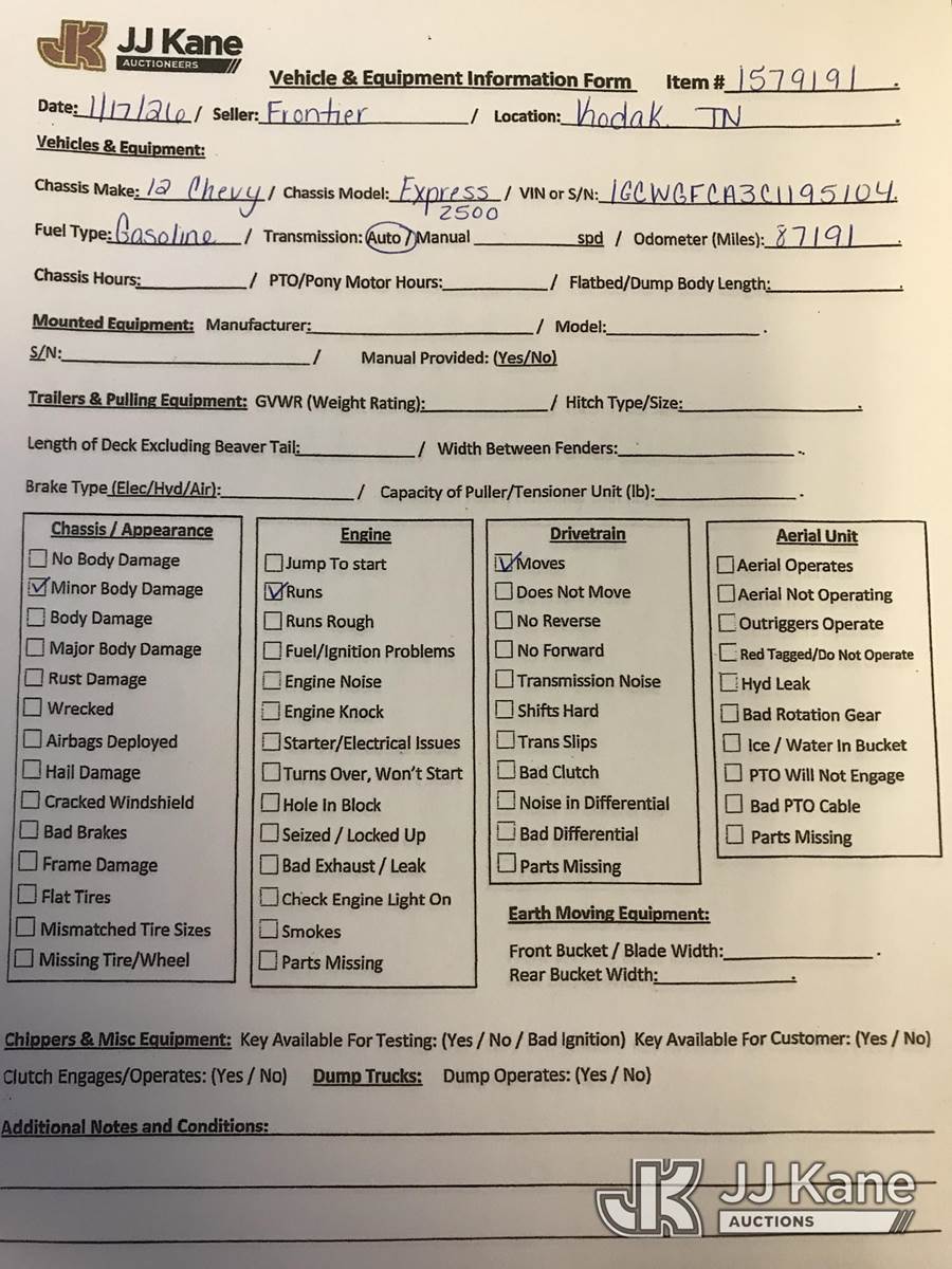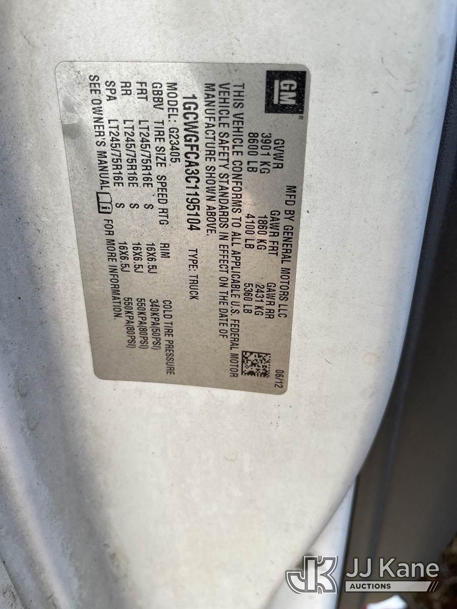 2012 Chevrolet Express G2500 Cargo Van, 4.8L V8 OHV 16V FFV gas, 6-Speed Automatic, RWD, A/C, (87,191 miles) (Runs & Moves) (Body Damage) This is a Titled Item NOTE: This unit is being sold AS IS/WHERE IS via Timed Auction and is located in Kodak, TN. For more information & removal arrangements please contact Allen Patrick @ allen.patrick@jjkane.com (Buyer is responsible for removal. Assistance by consignor or JJ Kane Auctions is not assured.)