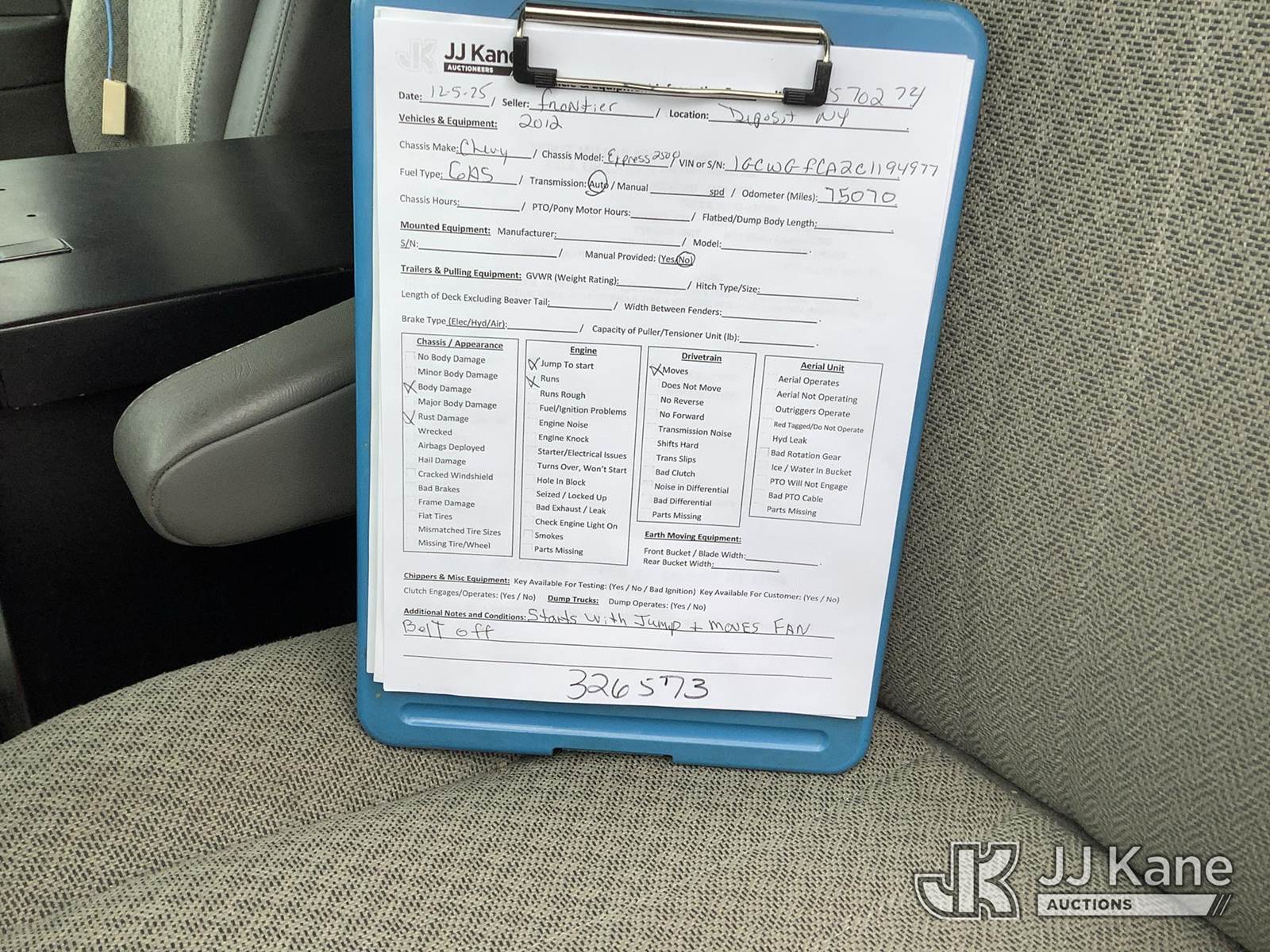 2012 Chevrolet Express G2500 Cargo Van, 8-cyl gas, Auto, A/C, (75,070 miles) (Runs & Moves) (Jump To Start, Fan Belt Off Of Engine, Body/Paint/Rust Damage) (Removal is by Appointment Only, Buyer MUST make a appointment prior to picking up, Buyer/Transporter Must have PAID IN FULL RELEASE. No onsite assistance available, Please Come prepared.) This is a Titled Item NOTE: This unit is being sold AS IS/WHERE IS via Timed Auction and is located in Deposit, NY. Inspection & preview days for this unit are by appointment only; please contact us at contact@jjkane.com or 84-Go-JJKane for more details. (Buyer is responsible for removal. Assistance by consignor or JJ Kane Auctions is not assured.)