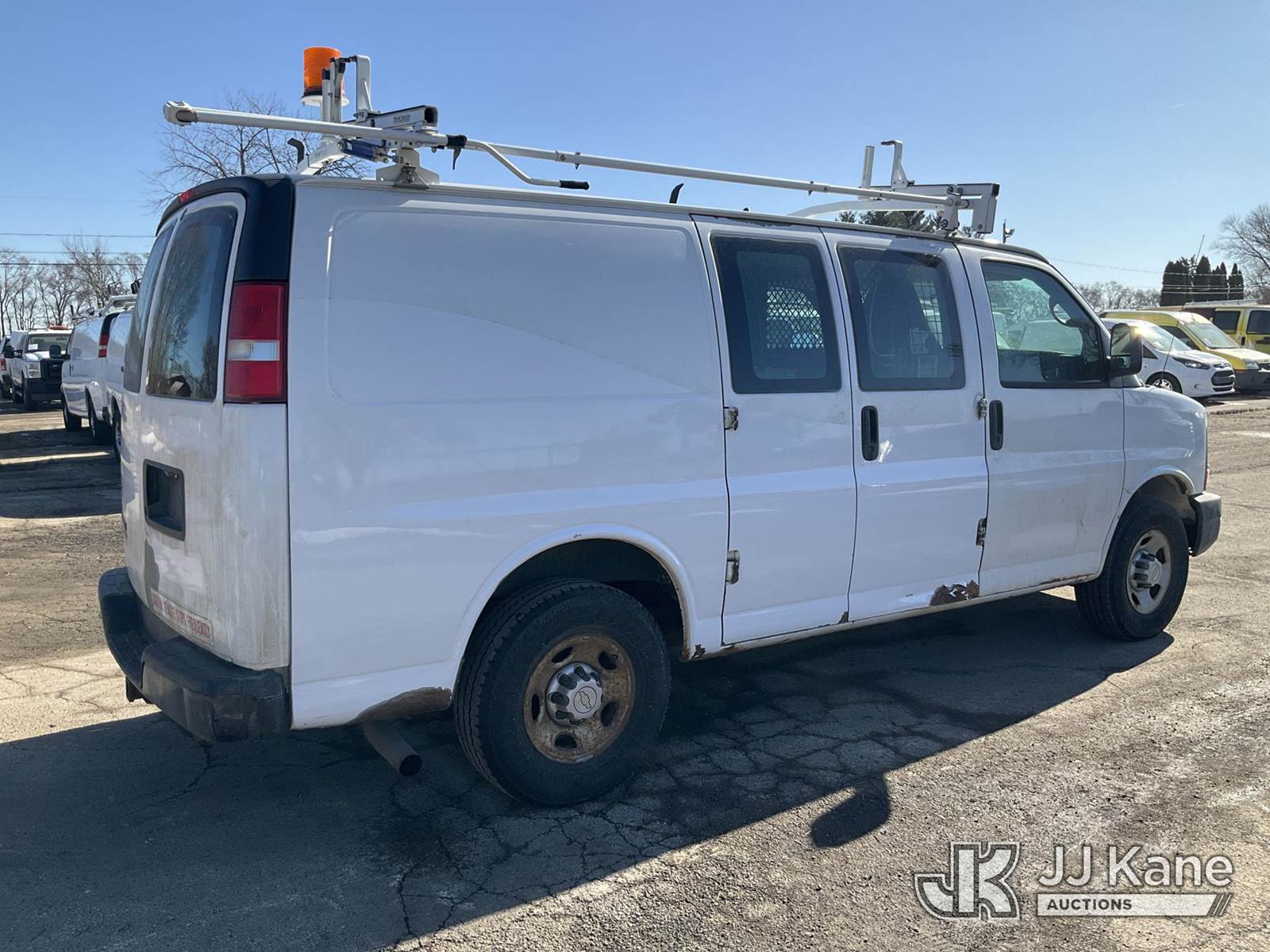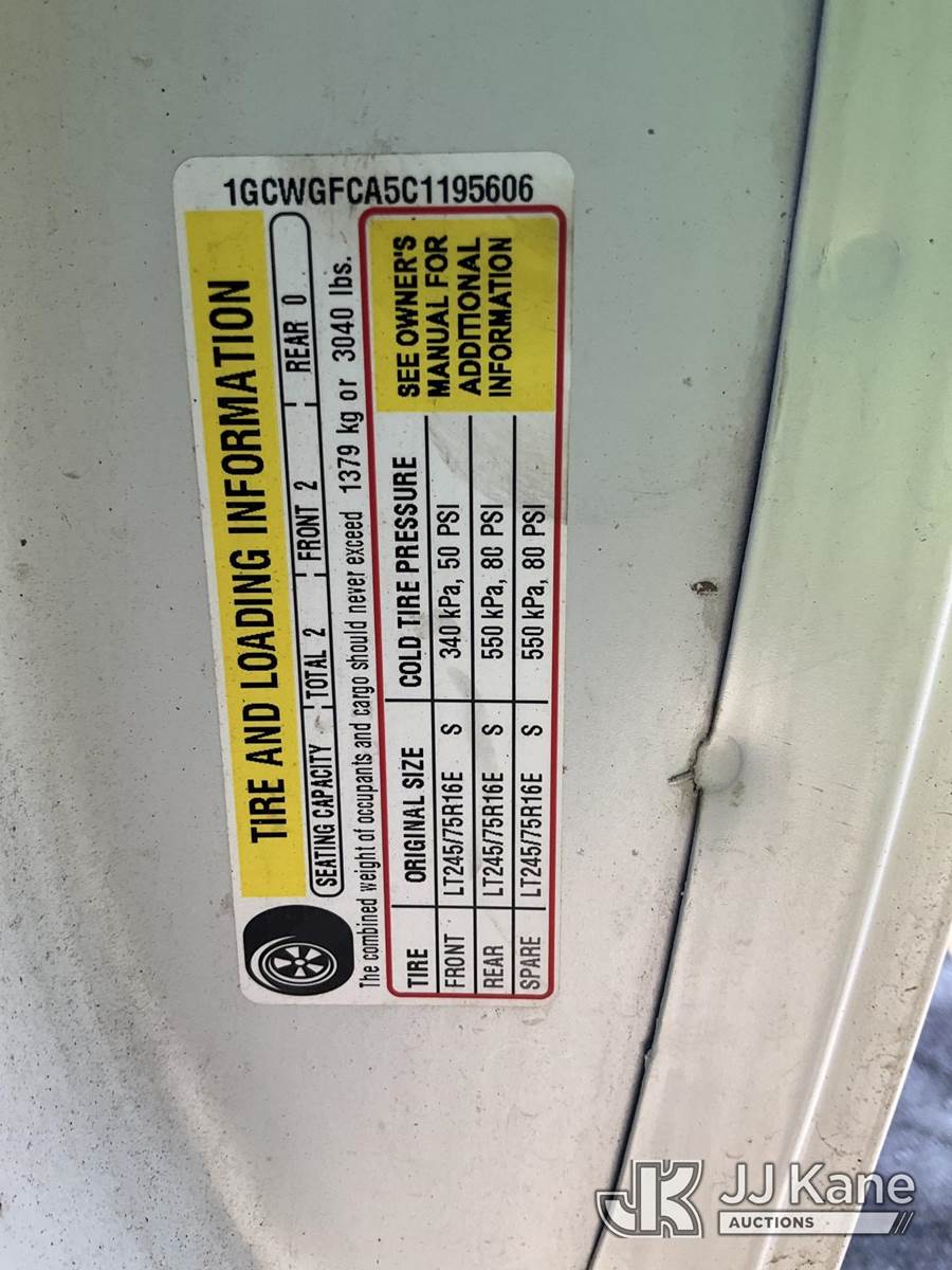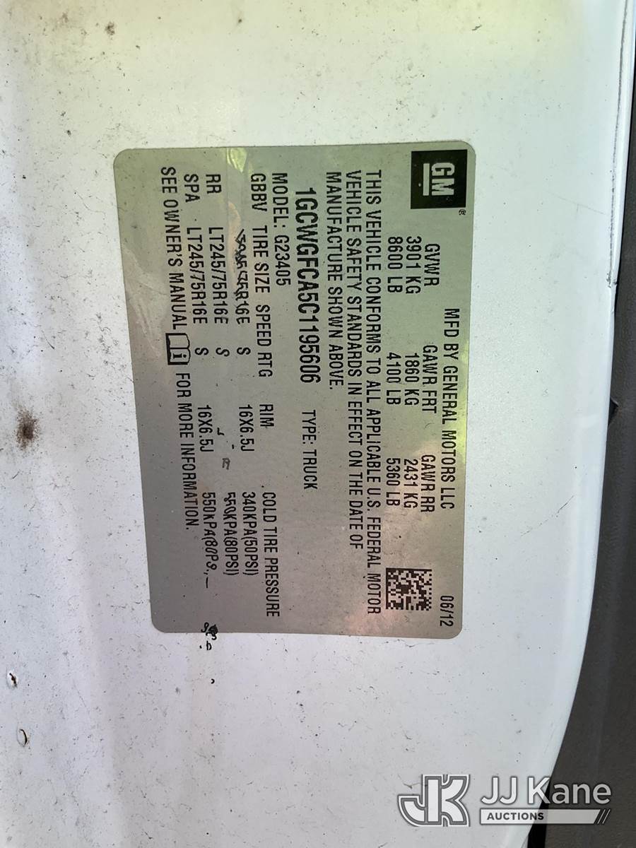 2012 Chevrolet Express G2500 Cargo Van, 4.8L V8 OHV 16V FFV gas, RWD, 6-Speed Automatic, A/C, with ladder rack, (123,454 miles) (Runs & Moves) (Check Engine Light On, Paint/Rust Damage) (Reads 5,302 hours) This is a Titled Item NOTE: This unit is being sold AS IS/WHERE IS via Timed Auction and is located in South Beloit, IL. Inspection & preview days for this unit are the 2 business days prior to the first day of items closing for this auction, item is located at 14354 Dearborn Ave South Beloit, IL and hours of operations are 8a-4p. For pre-sale questions, please contact Derek Eklund at (608) 904-0618 or (derek.eklund@jjkane.com). (Buyer is responsible for removal. Assistance by consignor or JJ Kane Auctions is not assured.)