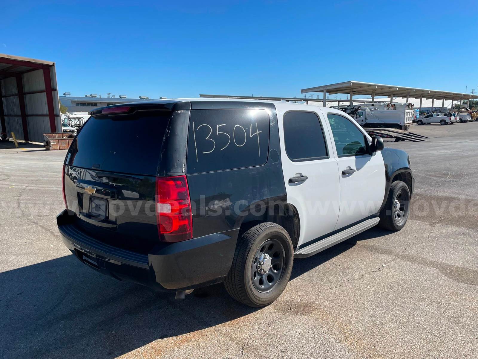 2012 Chevrolet Tahoe SPORT UTILITY 4-DR, 5.3L V8 OHV 16V FFV. Removed from service 6/23/2025. Vehicle was used as a police pursuit vehicle. This vehicle starts and runs/is driveable. ENGINE - 5.3 L gas. No known repairs are needed. Maintained every 6,000 miles. Vehicle has 10,513 hours. TRANSMISSION - Automatic with no known repairs needed. DRIVETRAIN - 2 wheel drive. EXTERIOR - Black/White with scratches and dents. Decals have been removed. Emergency equipment has been removed leaving holes in the exterior. Tires are in poor condition. Left rear tire is low. Windows do not have cracked glass. INTERIOR - Gray cloth and black vinyl with no known damage to seats, dash or floor. AC runs cold. Has stock AM/FM radio, dual side air bags, cruise control, power steering, tilt steering, power windows, and power door locks.