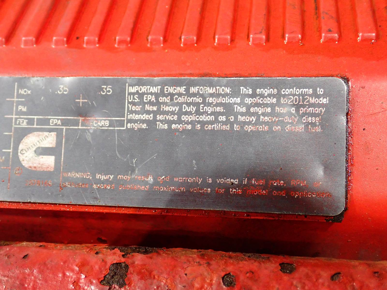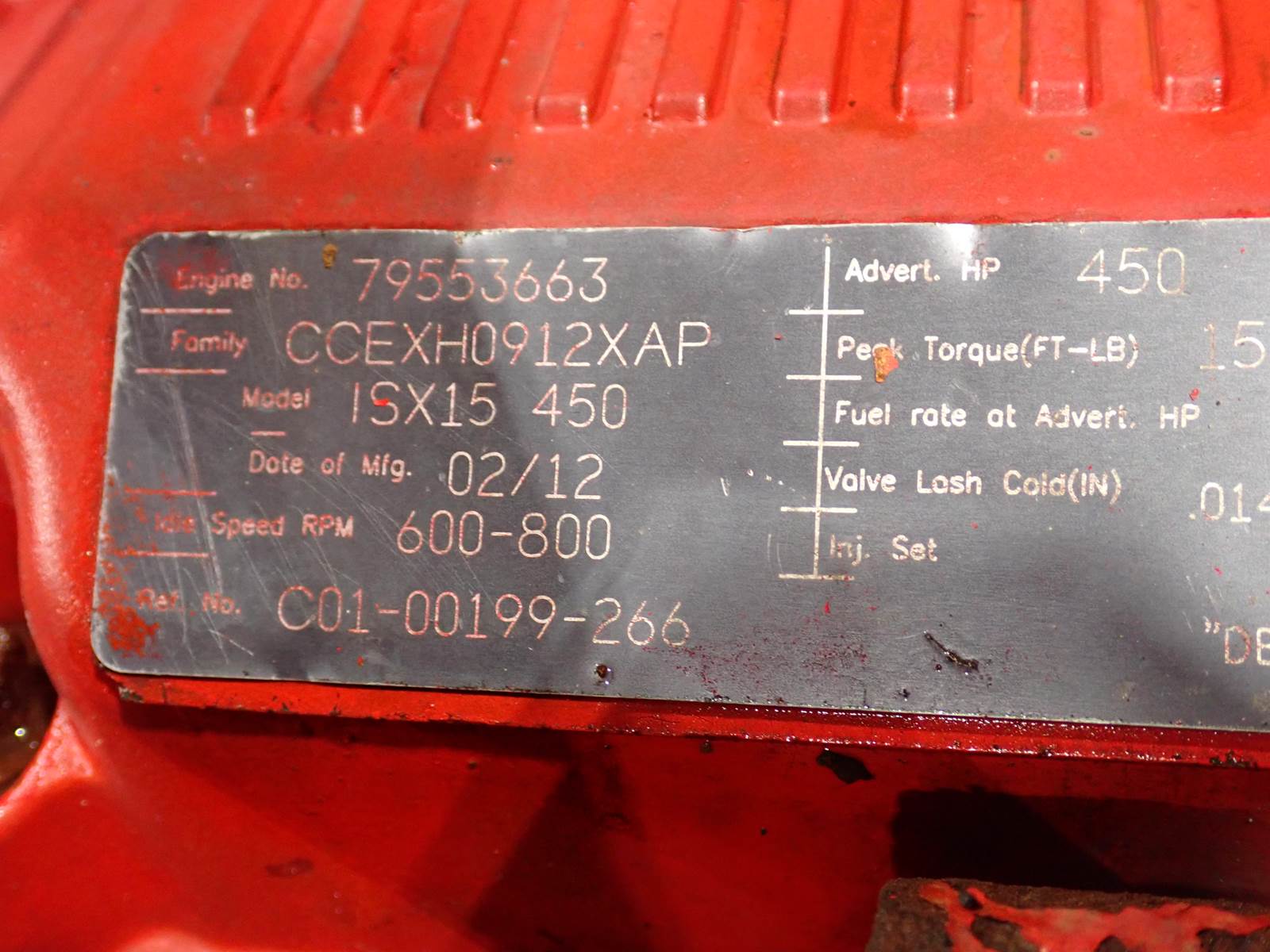 2012 Cummins ISX 450 truck engine, 450 HP, CM2250, CPL 3719, turbocharged, air to air intercooled, EPA family # CCEXH0912XAP. EXCELLENT RUNNING ENGINE, COMPLETE AS PICTURED. ECM SHOWS JUST 64,374 MILES, UNKNOWN IF ACCURATE. TEST RAN CLEAN, NO SMOKE OR BLOWBY OBSERVED, SEE VIDEO.