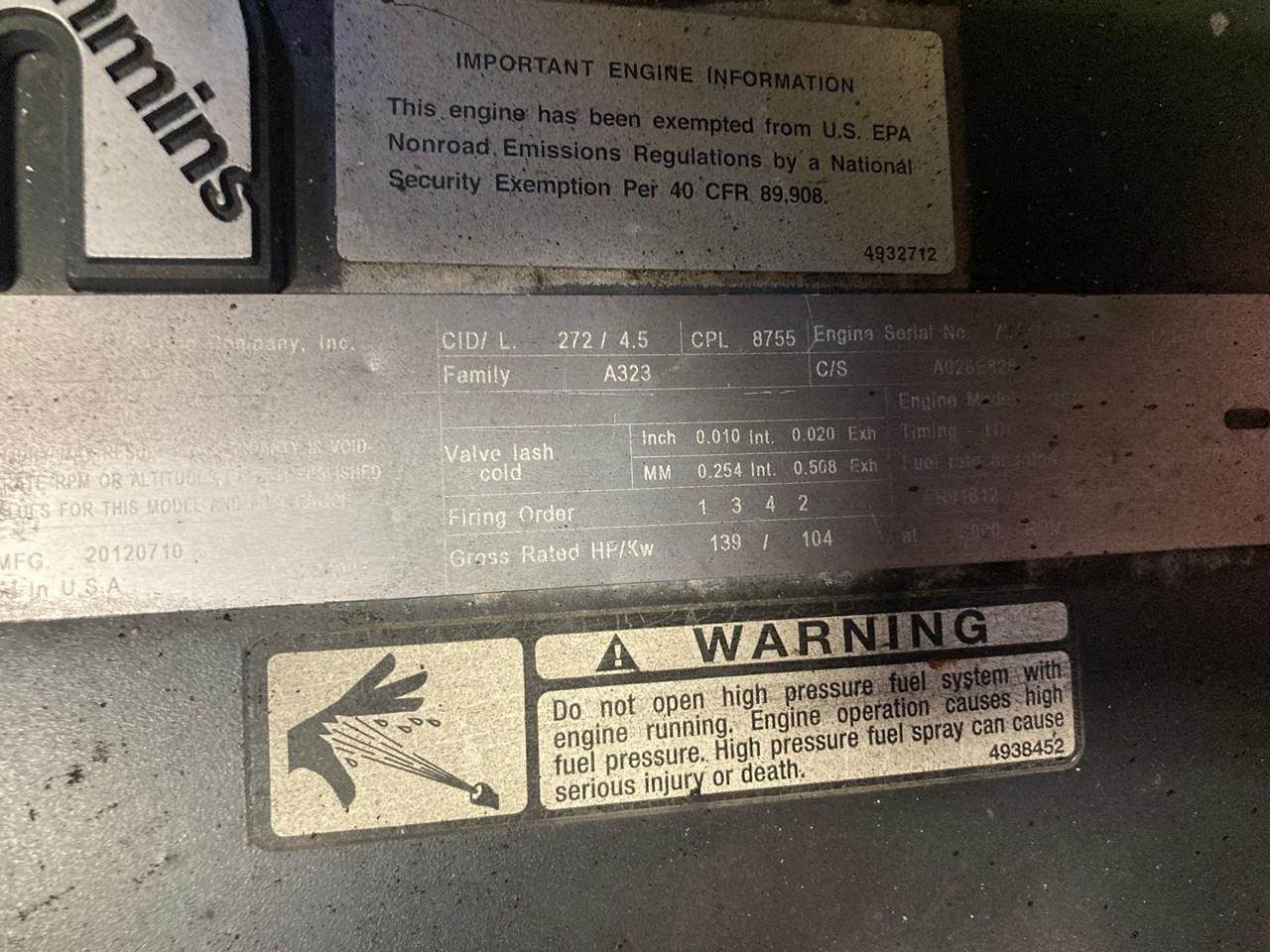 GOOD USED 2012 CUMMINS QSB4.5 DIESEL TAKEOUT ENGINE FOR SALE at ADELMAN’S TRUCK PARTS in CANTON, OHIO. 4,103 HOURS SHOWING ON ECM, RUN TESTED and COMPLETE with ECM, FLYWHEEL, STARTER, and ALTERNATOR, 139 HP @ 2000 RPM, TIER 3 EMISSIONS, CPL # 8755, CM850 FUEL SYSTEM, and 70+ LBS OIL PRESSURE.