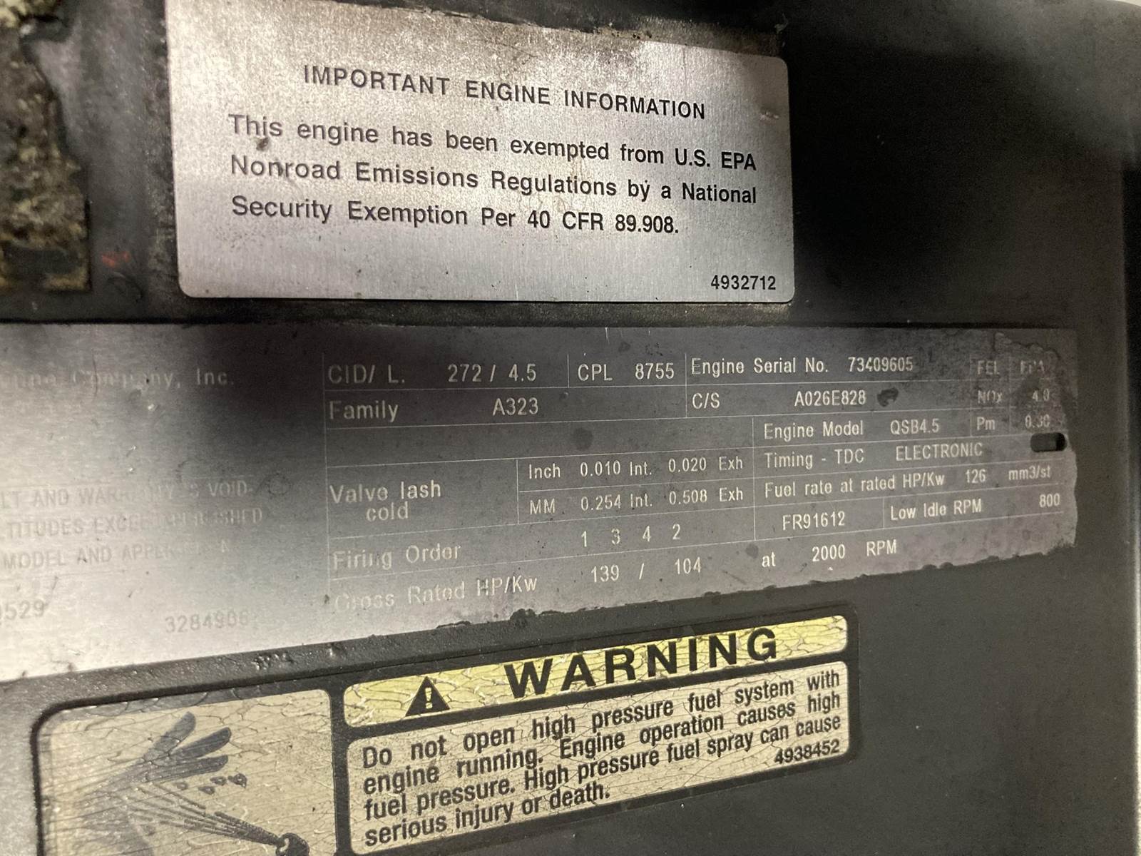 GOOD USED, 2012 CUMMINS QSB4.5 DIESEL TAKEOUT ENGINE FOR SALE at ADELMAN’S TRUCK PARTS in CANTON, OHIO. 1,971 HOURS SHOWING ON ECM, RUN TESTED and COMPLETE with ECM, FLYWHEEL, STARTER, and ALTERNATOR, 139 HP @ 2000 RPM, TIER 3 EMISSIONS, CPL # 8755, CM850 FUEL SYSTEM, and 70+ LBS OIL PRESSURE.