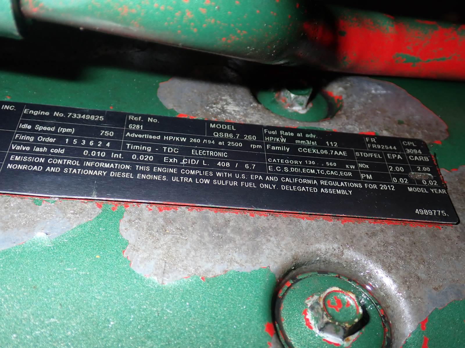 2012 Cummins QSB 6.7 diesel engine, turbocharged, air to air aftercooled, complete power unit w/ enclosure, cooling package, aftertreatment & accessories as pictured, CM2250, CPL 3094, 260 HP at 2500 RPM rating, EPA family # CCEXL06.7AAE, 3883 work hours on ECM. TEST RAN CLEAN, SEE VIDEO. HOLDS GOOD OIL PRESSURE AND NO SMOKE OR BLOWBY OBSERVED DURING COLD TEST RUN. VERY DIFFICULT TO FIND CM2250 SETUP HERE -- DON'T MISS IT !!