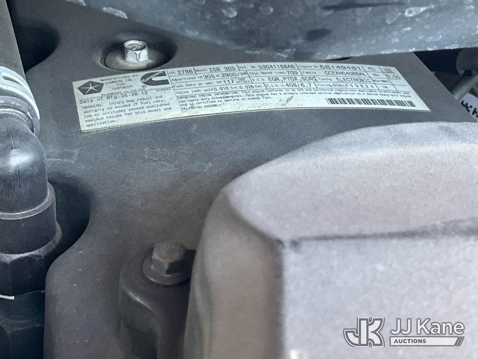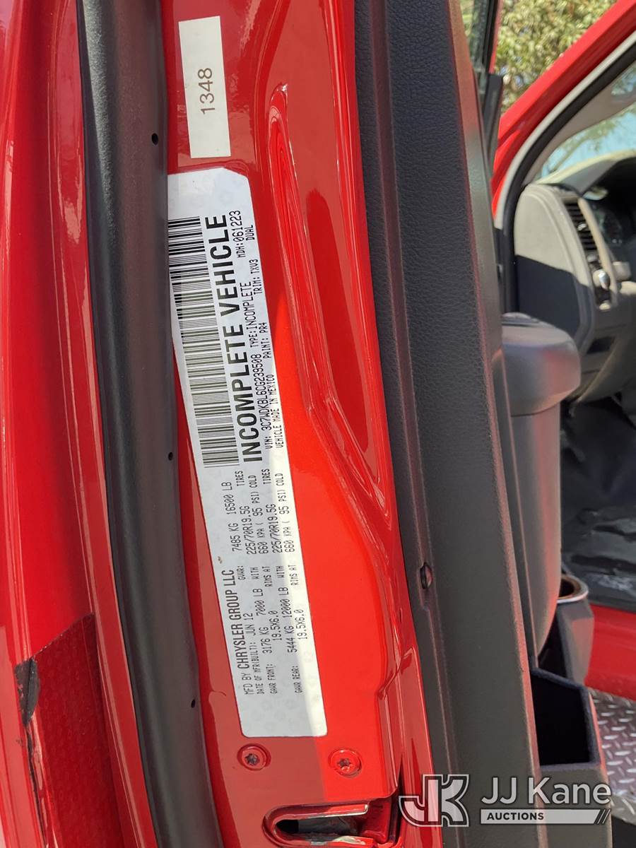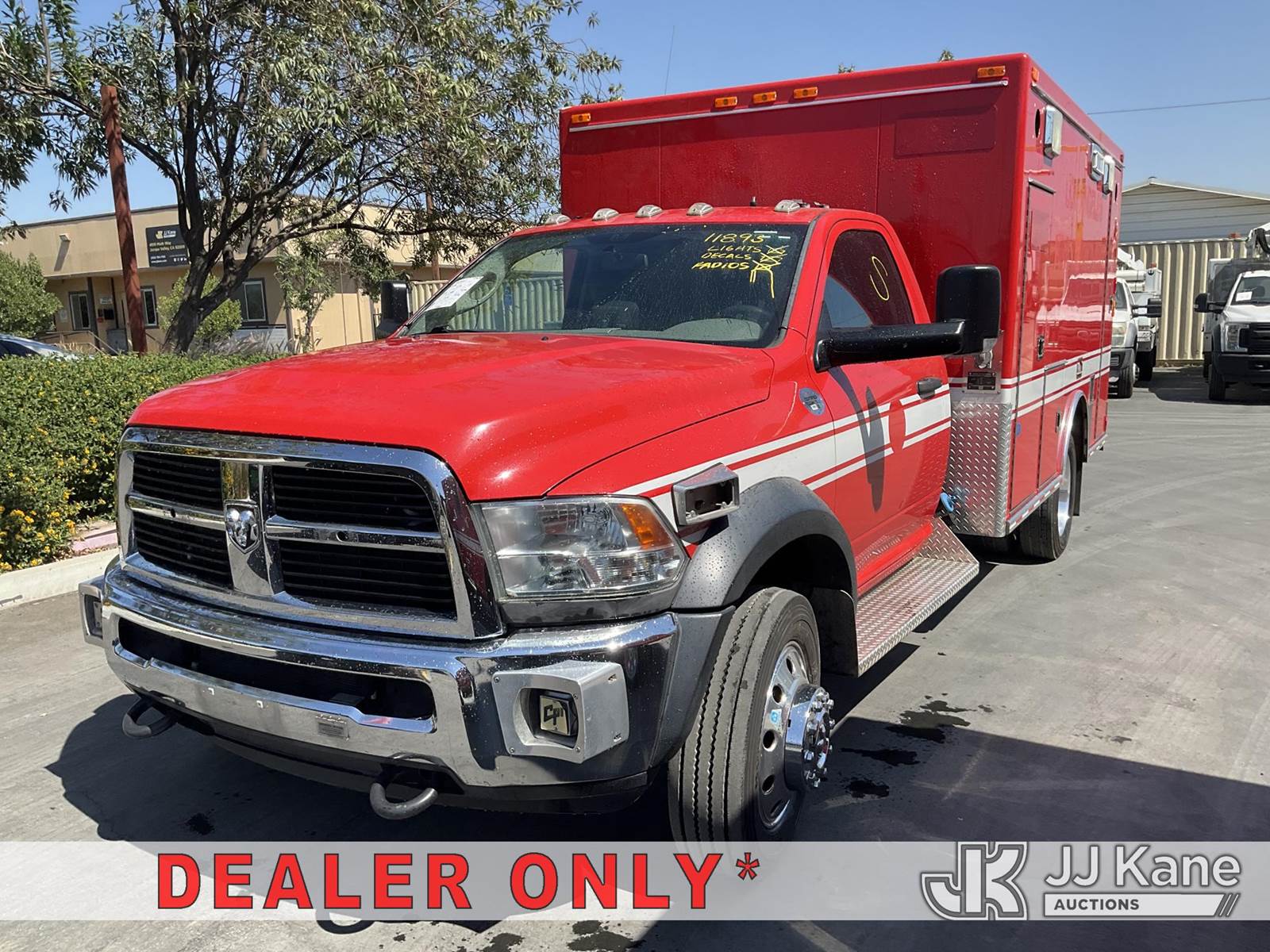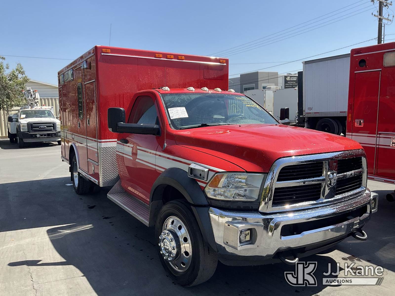 2012 Dodge Ram 4500 Regular Cab 2WD Ambulance, s/n 3C7WDKBL6CG239508, 6.7L L6 OHV 24V TURBO DIESEL Auto, diesel, A/C, with Aluminum Rims & Aluminum Side Steps, (77,044 miles) (Runs & Moves) (Engine Light On) (Bidding Restricted to Licensed Vehicle Dealers Only), May be subject to ARB Regulations This is a Titled Item NOTE: This unit is being sold AS IS/WHERE IS via Timed Auction and is located in Jurupa Valley, CA. Inspection & preview days for this unit are the 2 business days prior to the first day of items closing for this auction, item is located at 4510 Muth Way Jurupa Valley, CA 92509 and hours of operations are 8a-4p. For pre-sale questions, please contact please contact Office Staff @ (310) 353-7140. Dealer License Number 45696. (Buyer is responsible for removal. Assistance by consignor or JJ Kane Auctioneers is not assured.)