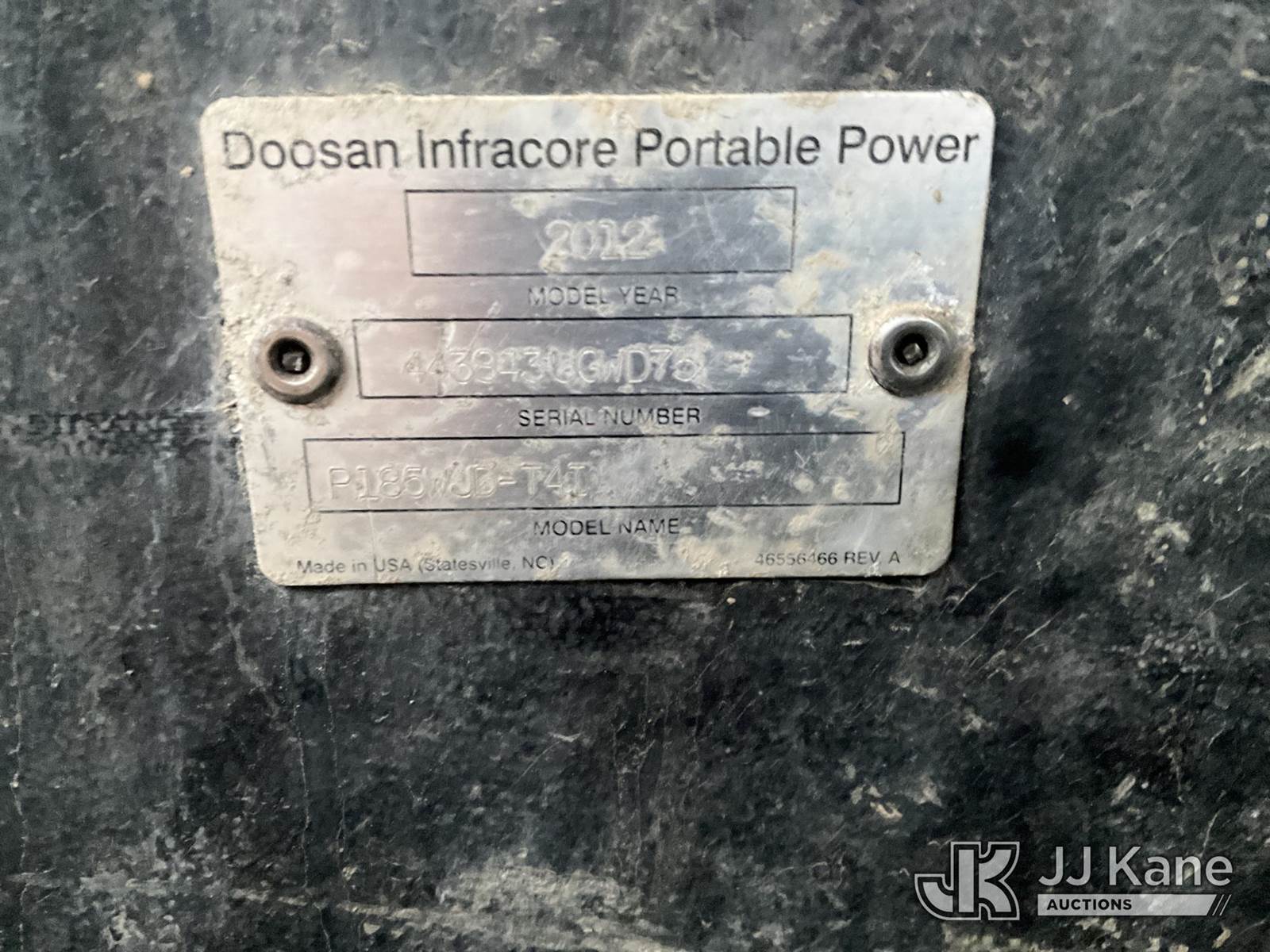 2012 Doosan/Ingersoll Rand P185WJD 185 cfm Portable Air Compressor, s/n 4FVCABAA9CU443843, J.D. diesel, (Danella Unit) (No Title) (Jump To Start, Runs, ignition issues) (Reads 301 hours) NOTE: This unit is being sold AS IS/WHERE IS via Timed Auction and is located in Plymouth Meeting, PA. Inspection & preview days for this unit are the 2 business days prior to the first day of items closing for this auction, item is located at 1402 Conshohocken Rd Plymouth Meeting, PA 19462 and hours of operations are 8a-4p. For pre-sale questions, please contact Bruce Thomas @ (267) 887-0392 or bruce.thomas.jr@jjkane.com. (Buyer is responsible for removal. Assistance by consignor or JJ Kane Auctions is not assured.)