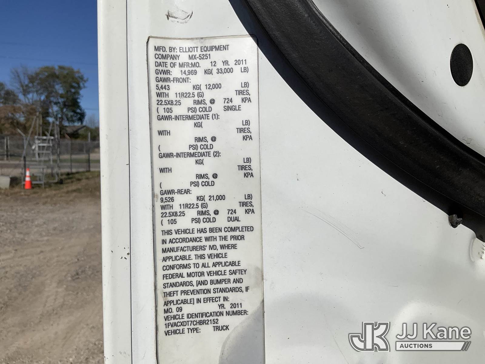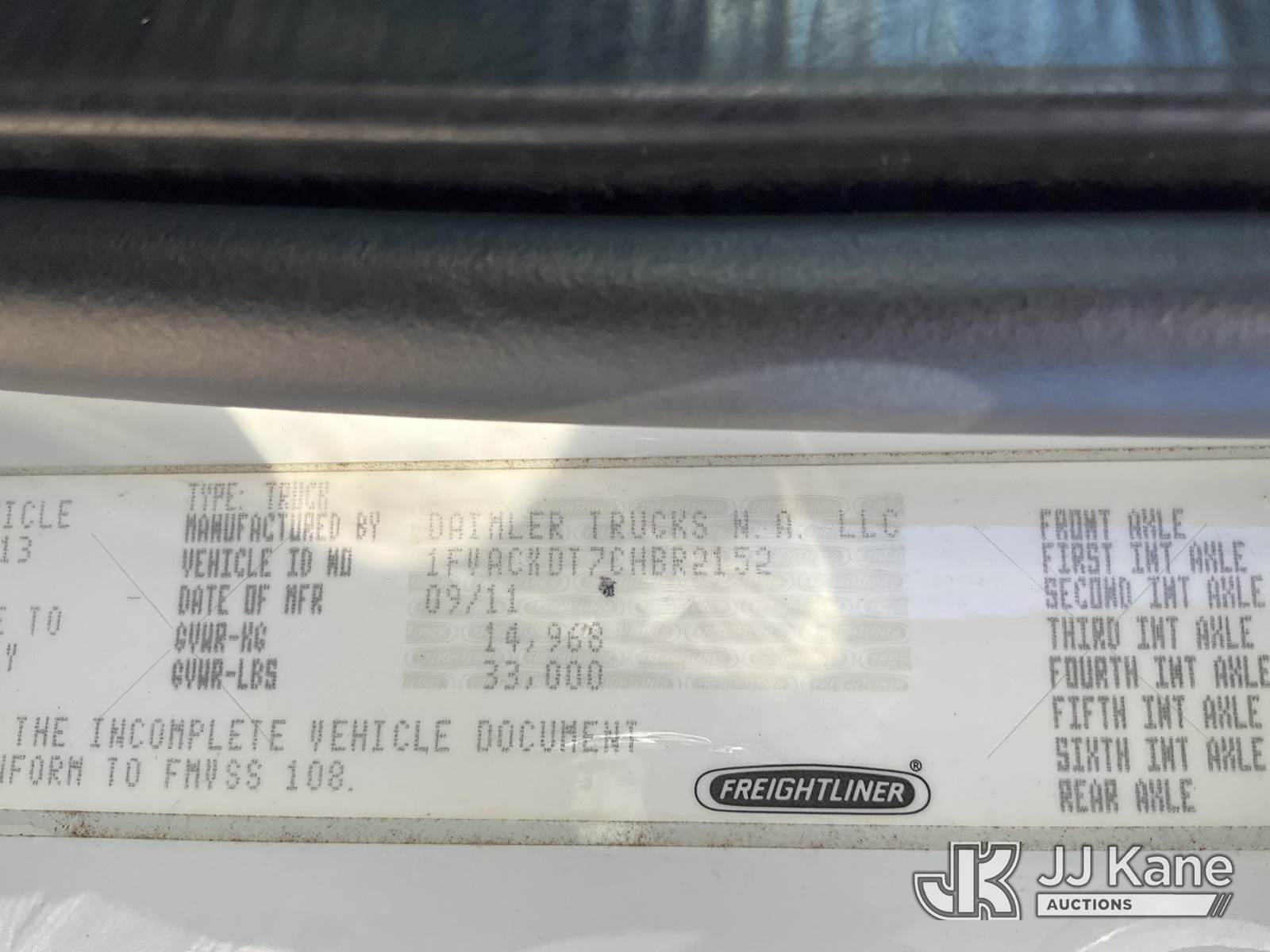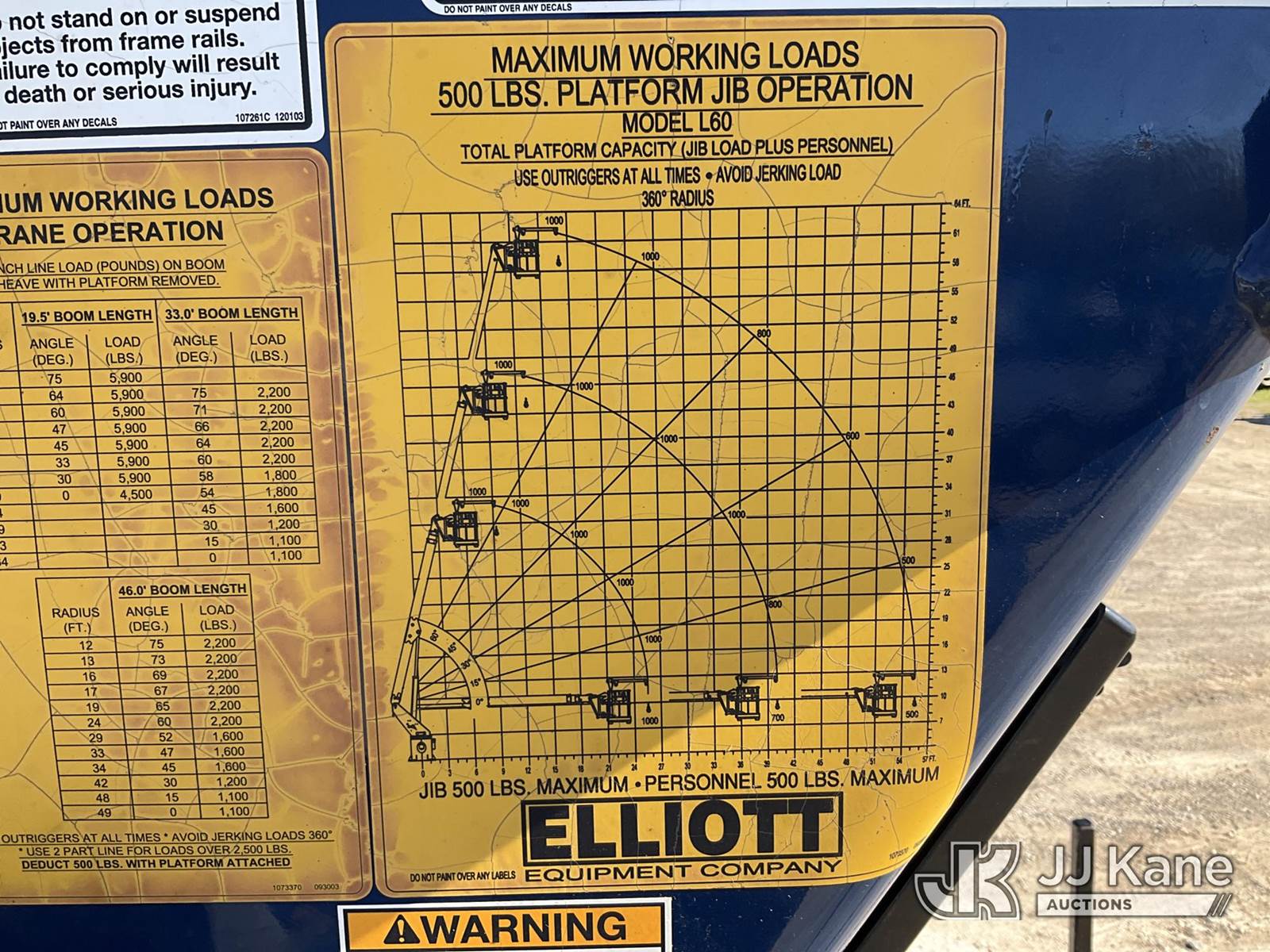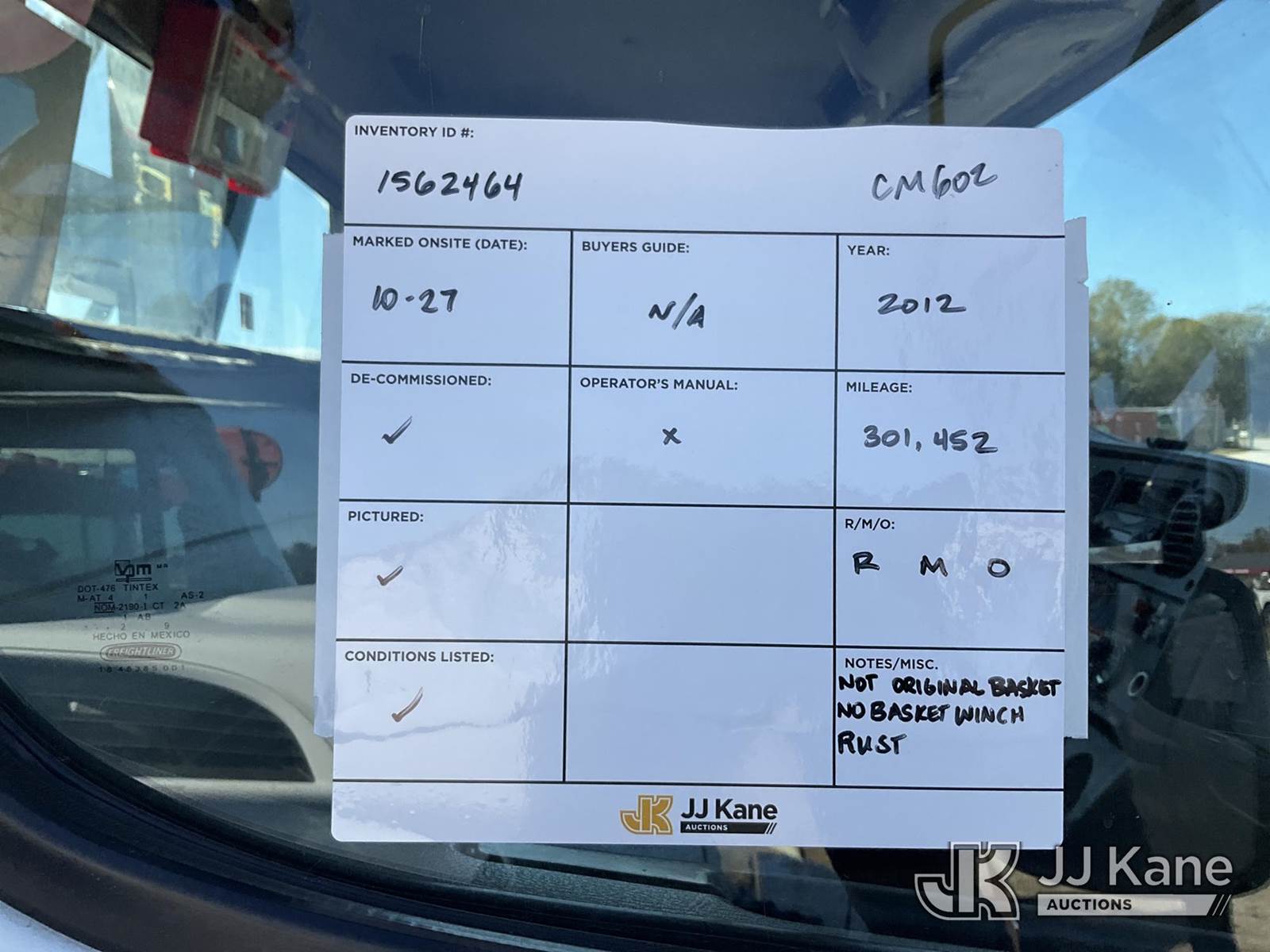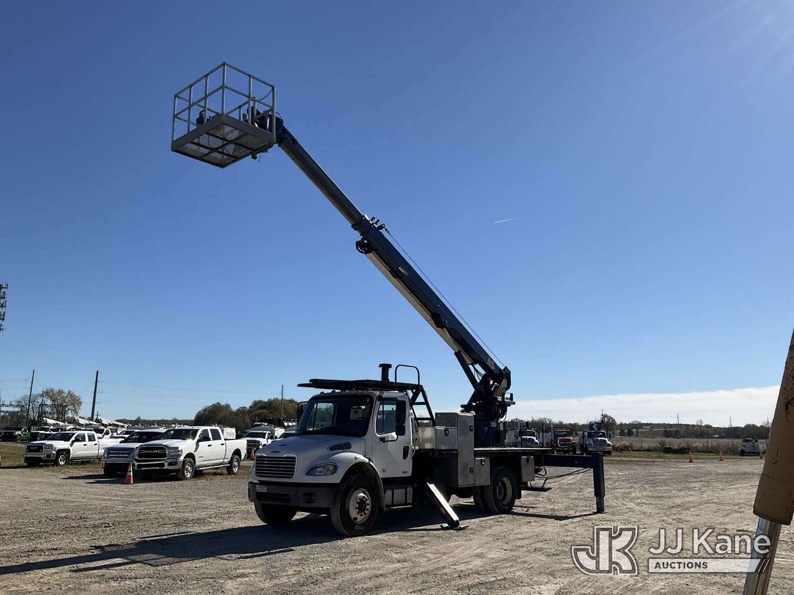 Elliott L60, 5,900 Lb Hydraulic Crane s/n MX5251, with 61 ft. max sheave height, 46 ft. 3-section hydraulic boom, heel winch, headache ball, removeable basket, rear mounted on 2012 Freightliner M2 106 T/A Flatbed/Utility Truck, 6.7L L6 DIESEL Auto, 4X2, DIESEL, A/C, (301,452 miles) (Runs, Moves, & Operates) (Not Original Basket, No Basket Jib, Rust) (Reads 22,156 hours) This is a Titled Item NOTE: This unit is being sold AS IS/WHERE IS via Timed Auction and is located in Charlotte, MI. Inspection & preview days for this unit are the 2 business days prior to the first day of items closing for this auction, item is located at 750 Island Hwy Charlotte, MI 48813 and hours of operations are 8a-4p. For pre-sale questions, please contact Corey Cook at (517) 983-0796 or corey.cook@jjkane.com (Missing manuals, See Auction Company for Manufacturers Information to obtain manuals) (Buyer is responsible for removal. Assistance by consignor or JJ Kane Auctioneers is not assured.)
