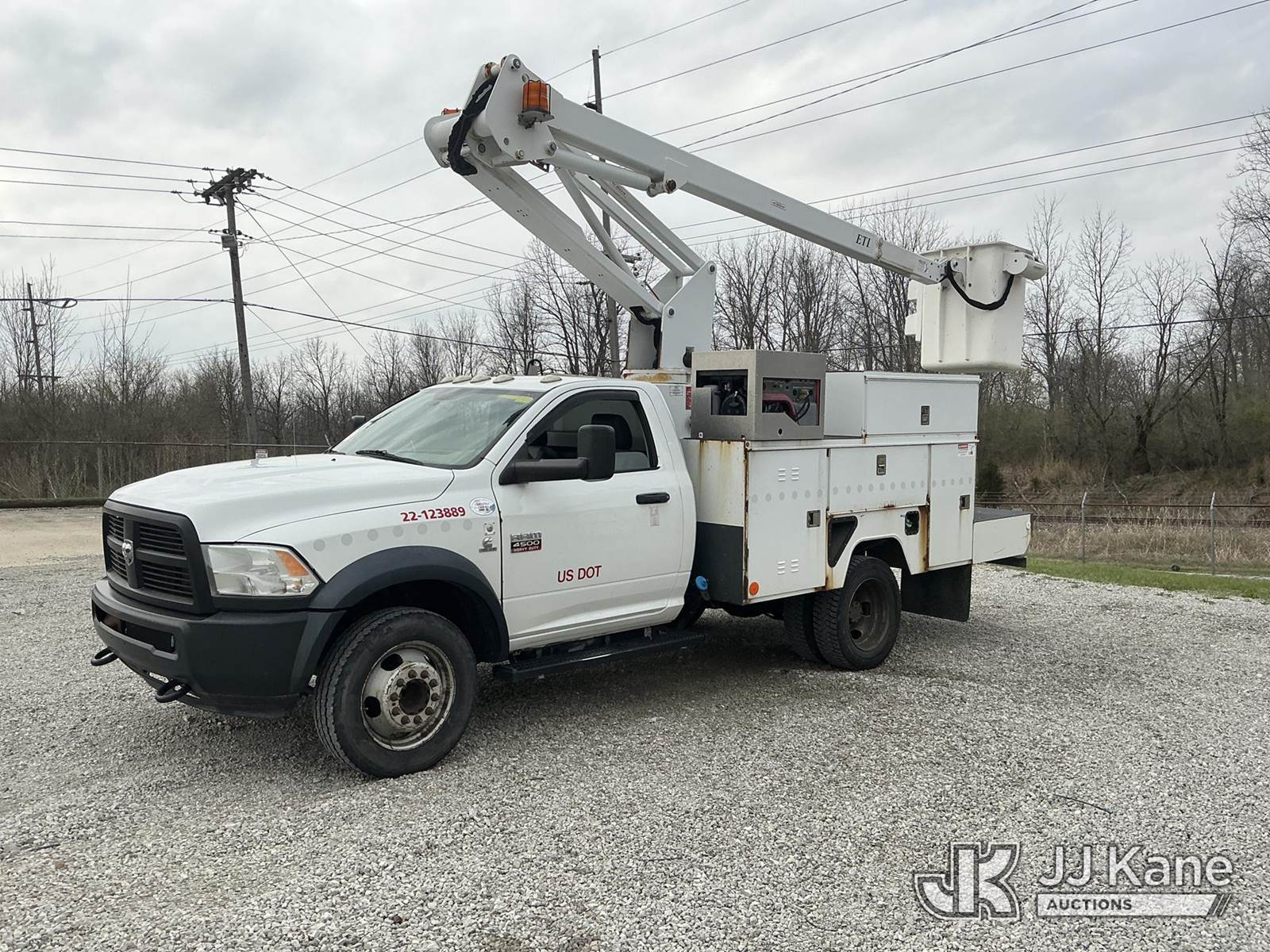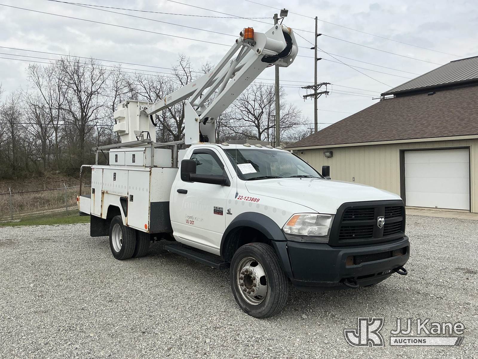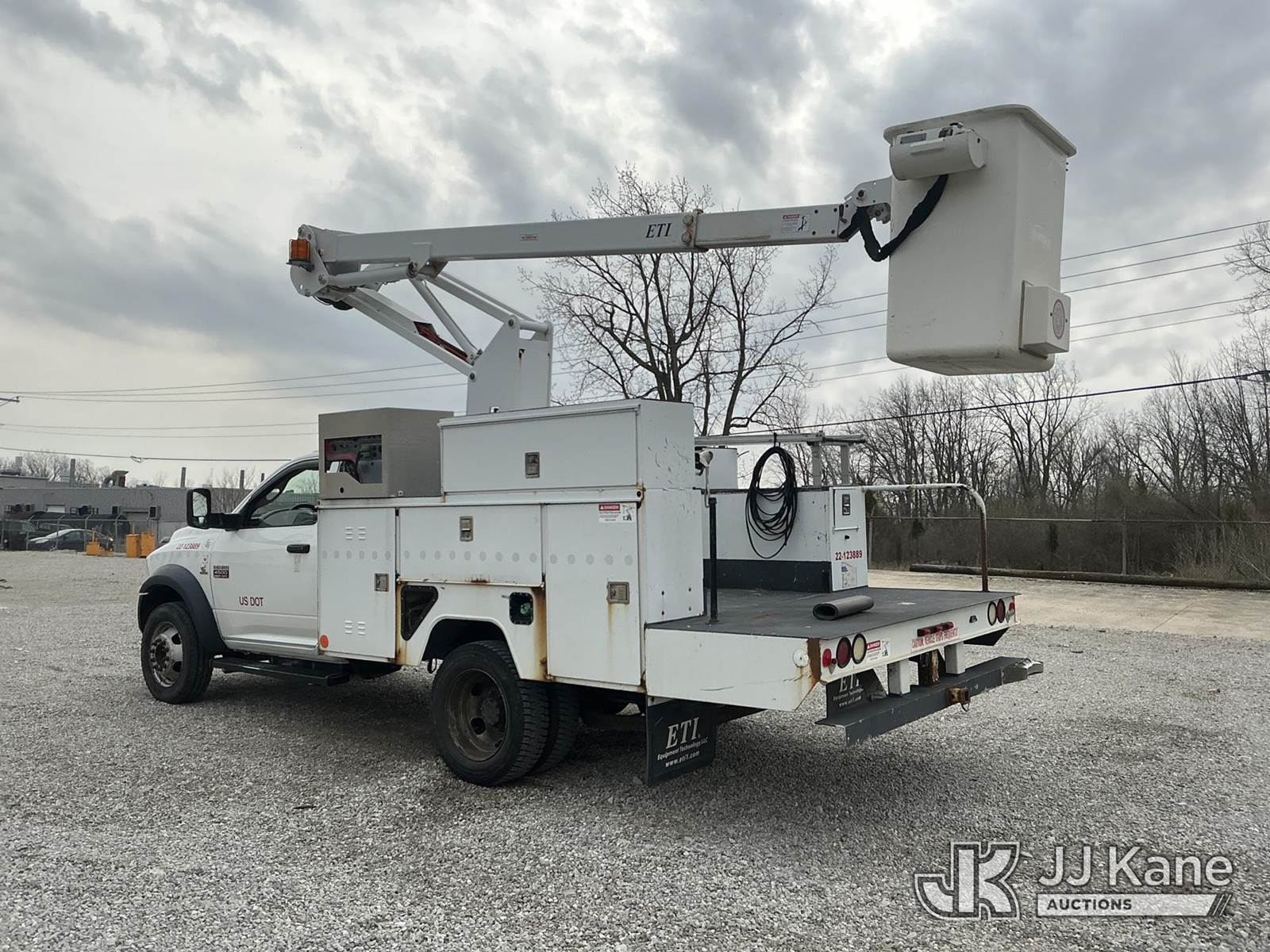 ETI ETC35S-NT, 40 ft, Articulating & Telescopic Bucket Truck s/n 0113C59909, with single-man bucket, mounted behind cab on 2012 Dodge Ram 4500 Service Truck, 6.7L diesel, Auto, with inverter & generator, (142,038 miles) (Runs, Moves & Upper Operates) (Check Engine Light On, Body/Rust & Paint Damage) (Reads 14,393 hours) This is a Titled Item NOTE: This unit is being sold AS IS/WHERE IS via Timed Auction and is located in Fort Wayne, IN. Inspection & preview days for this unit are the 2 business days prior to the first day of items closing for this auction, item is located at 3020 Commercial Rd Fort Wayne, IN 46809 and hours of operations are 8a-4p. For pre-sale questions, please contact Eric Mcintosh @ (260) 205-2483 (Missing manuals, See Auction Company for Manufacturers Information to obtain manuals) (Buyer is responsible for removal. Assistance by consignor or JJ Kane Auctions is not assured.)