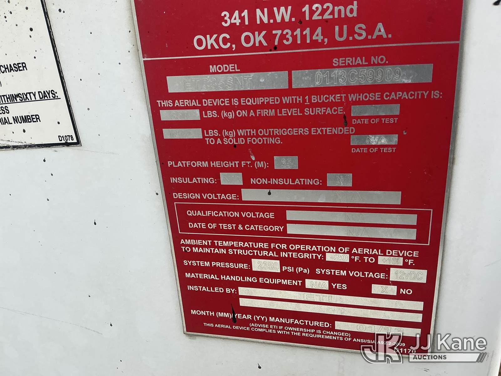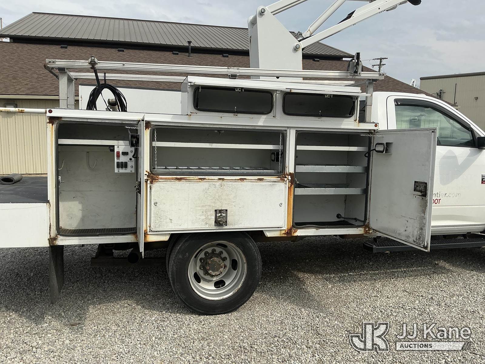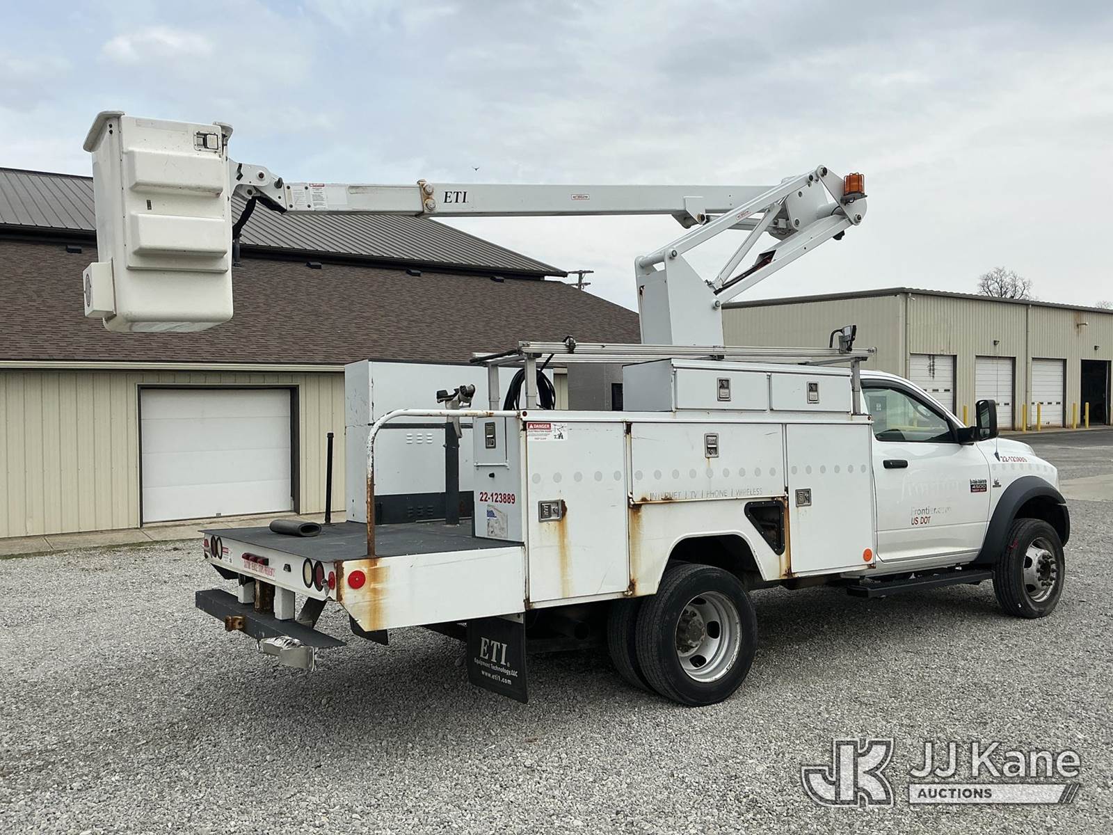 ETI ETC35S-NT, 40 ft, Articulating & Telescopic Bucket Truck s/n 0113C59909, with single-man bucket, mounted behind cab on 2012 Dodge Ram 4500 Service Truck, 6.7L diesel, Auto, with inverter & generator, (142,038 miles) (Runs, Moves & Upper Operates) (Check Engine Light On, Body/Rust & Paint Damage) (Reads 14,393 hours) This is a Titled Item NOTE: This unit is being sold AS IS/WHERE IS via Timed Auction and is located in Fort Wayne, IN. Inspection & preview days for this unit are the 2 business days prior to the first day of items closing for this auction, item is located at 3020 Commercial Rd Fort Wayne, IN 46809 and hours of operations are 8a-4p. For pre-sale questions, please contact Eric Mcintosh @ (260) 205-2483 (Missing manuals, See Auction Company for Manufacturers Information to obtain manuals) (Buyer is responsible for removal. Assistance by consignor or JJ Kane Auctions is not assured.)