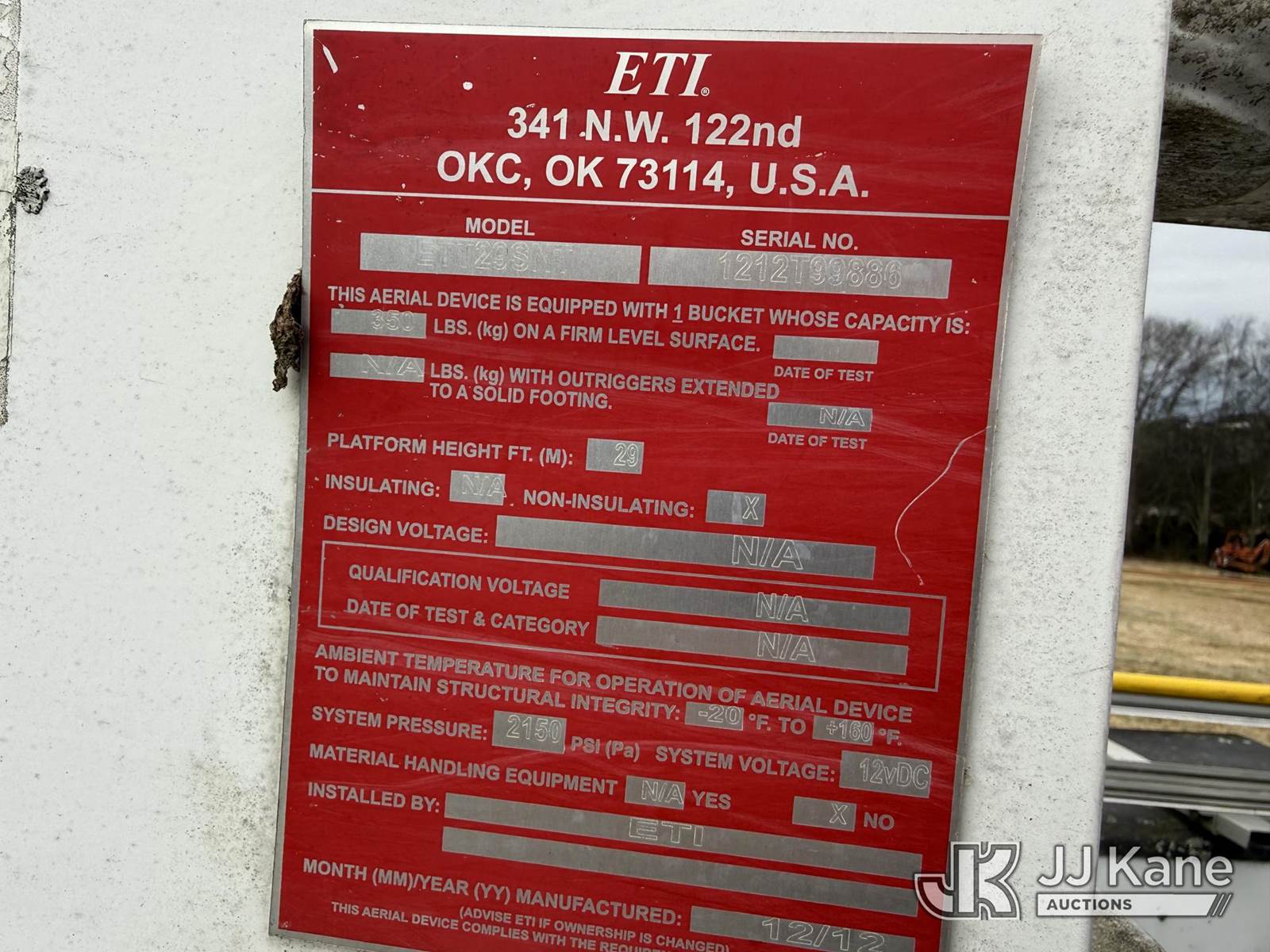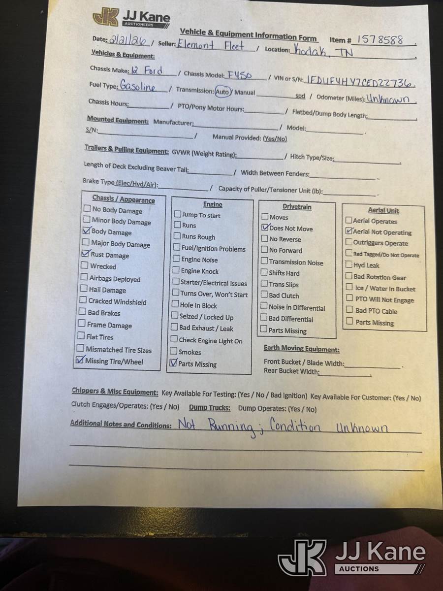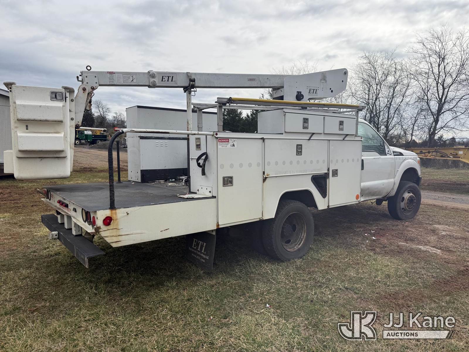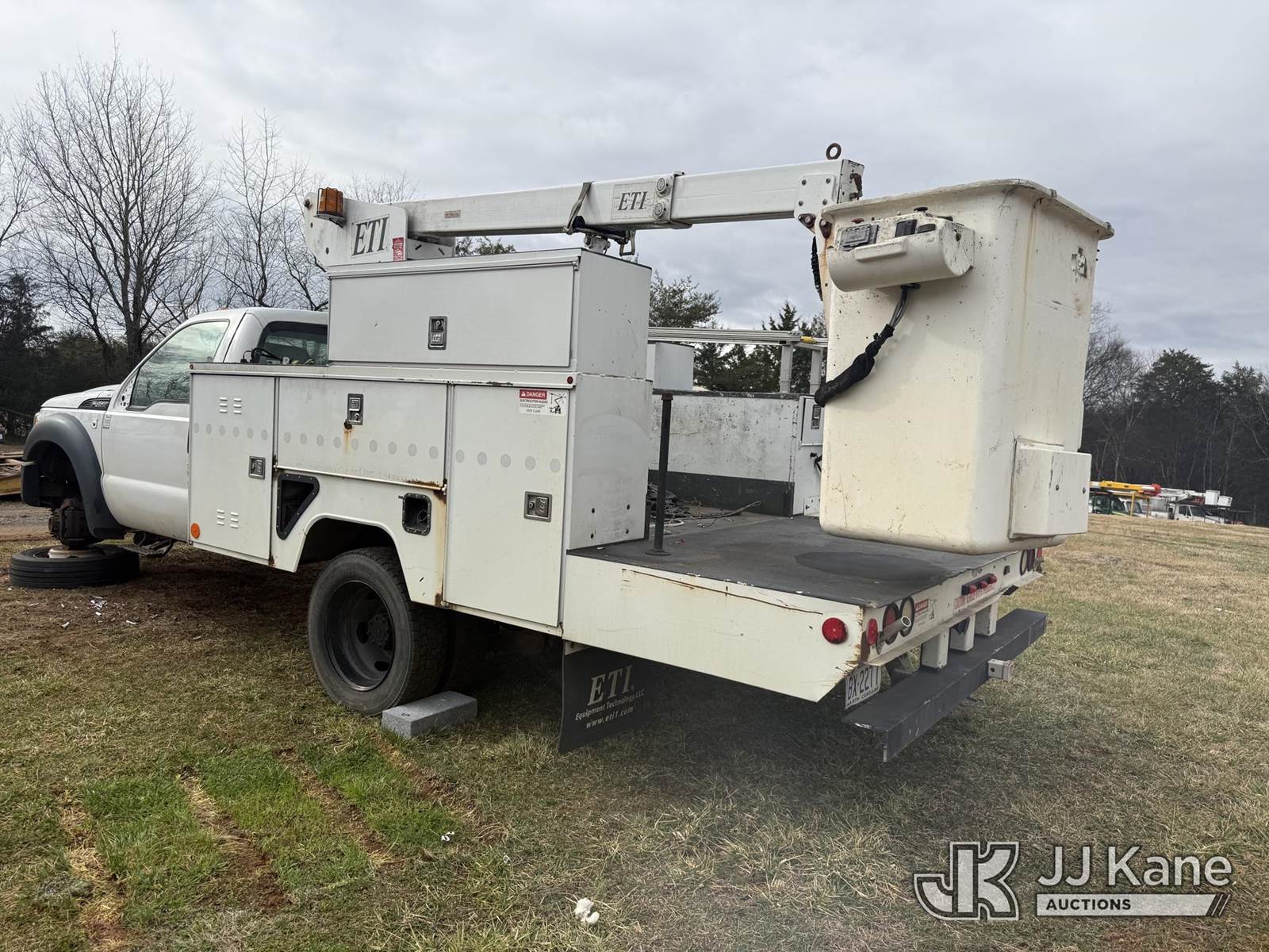 ETI ETT29-SNT, 34 ft, Telescopic Insulated Bucket Truck s/n 1212T99886, with single-man bucket, mounted behind cab on 2012 Ford F450 4x4 Service Truck, 10-cyl gas, Auto, True Mileage Unknown (Not Running, Missing Parts, Missing Tire, Condition Unknown, Upper Condition Unknown) This is a Titled Item NOTE: This unit is being sold AS IS/WHERE IS via Timed Auction and is located in Kodak, TN. Inspection & preview days for this unit are by appointment only; please contact us at contact@jjkane.com or 84-Go-JJKane for more details. (Missing manuals, See Auction Company for Manufacturers Information to obtain manuals) (Buyer is responsible for removal. Assistance by consignor or JJ Kane Auctions is not assured.)