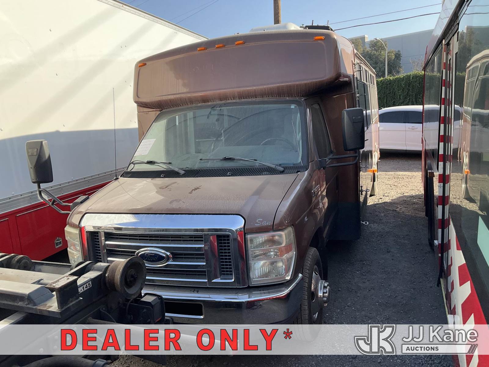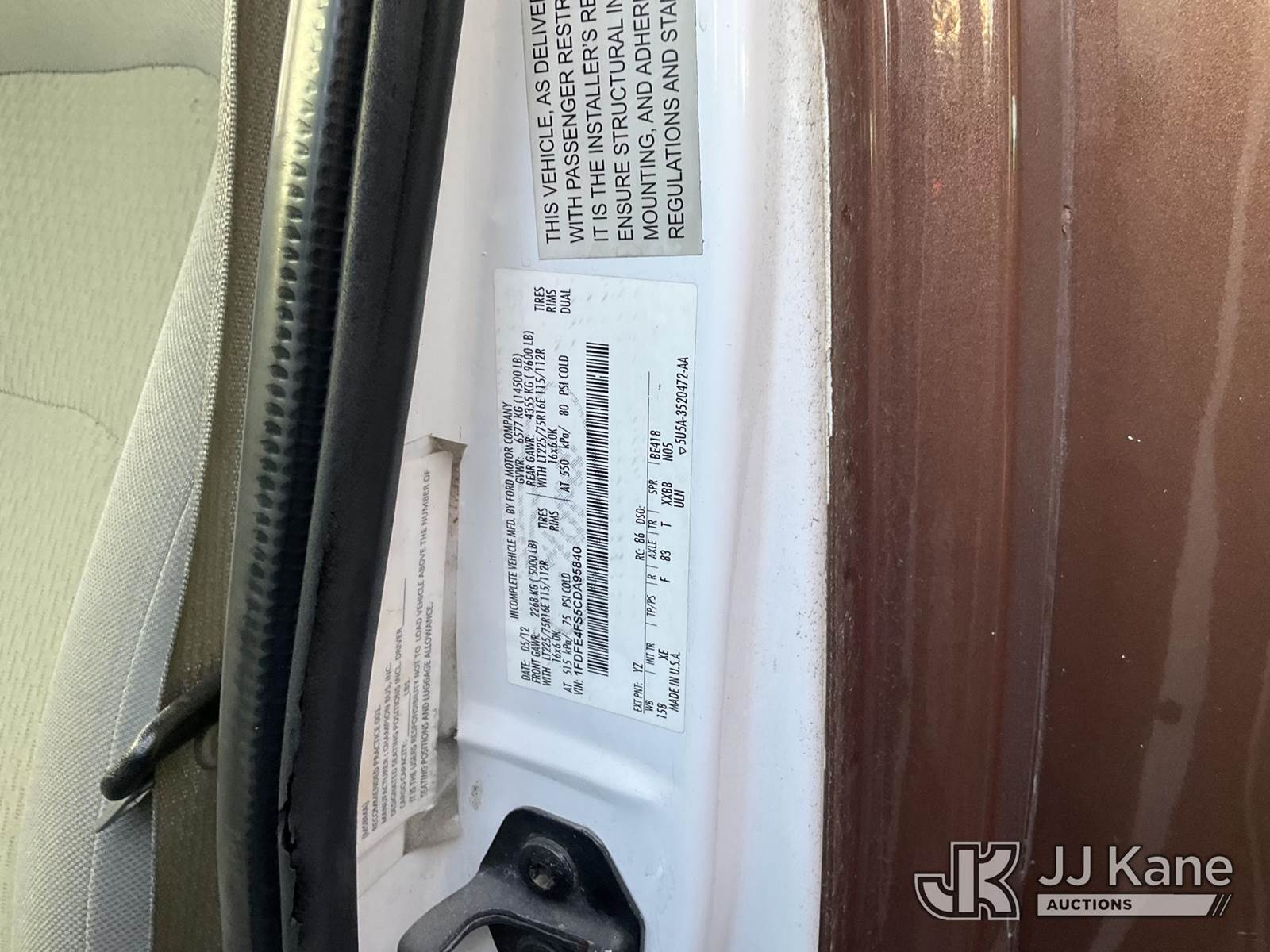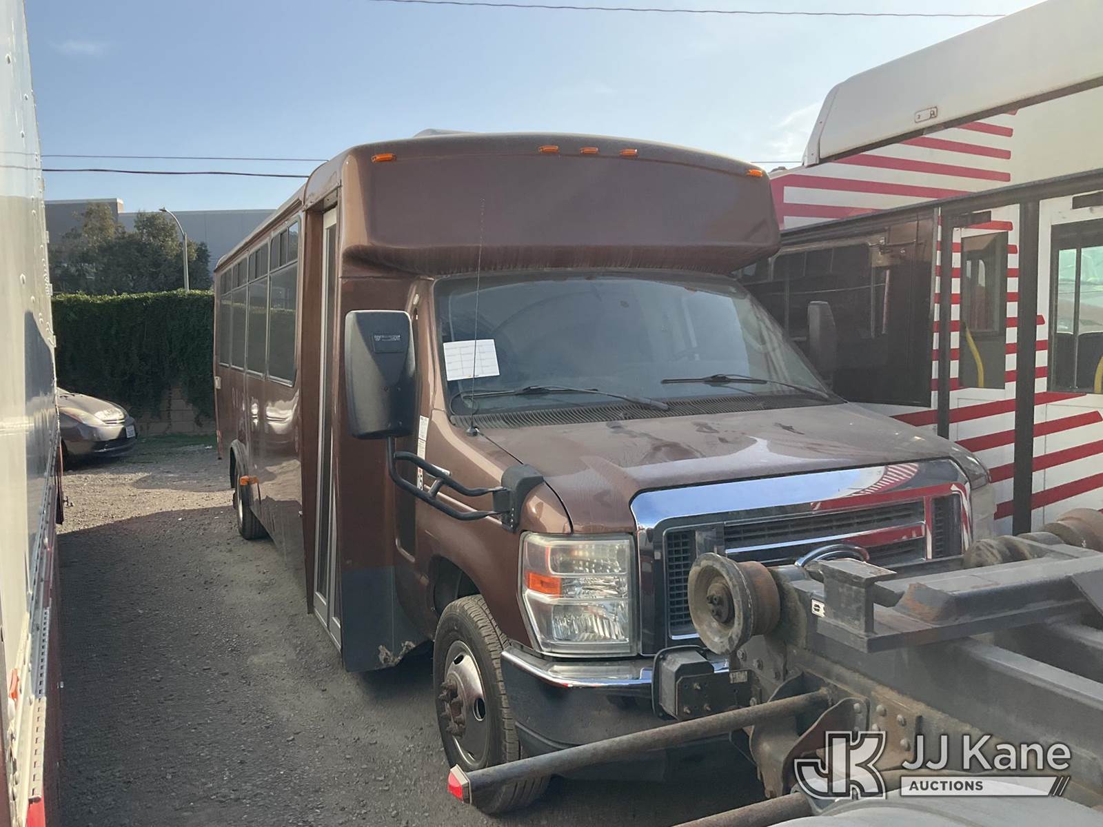 2012 Ford Econoline E-450 Passenger Bus, s/n 1FDFE4FS5CDA95840, 10-cyl gas, Auto, A/C, with 16 Passenger Seating, Bath room , (179,011 miles) (Runs & Moves) (Needs New Battery) (Passed Smog) (Bidding Restricted to Licensed Vehicle Dealers Only), This is a Titled Item NOTE: This unit is being sold AS IS/WHERE IS via Timed Auction and is located in Jurupa Valley, CA. Inspection & preview days for this unit are the 2 business days prior to the first day of items closing for this auction, item is located at 4510 Muth Way Jurupa Valley, CA 92509 and hours of operations are 8a-4p. For pre-sale questions, please contact please contact Office Staff @ (310) 353-7140. Dealer License Number 45696. (Buyer is responsible for removal. Assistance by consignor or JJ Kane Auctions is not assured.)