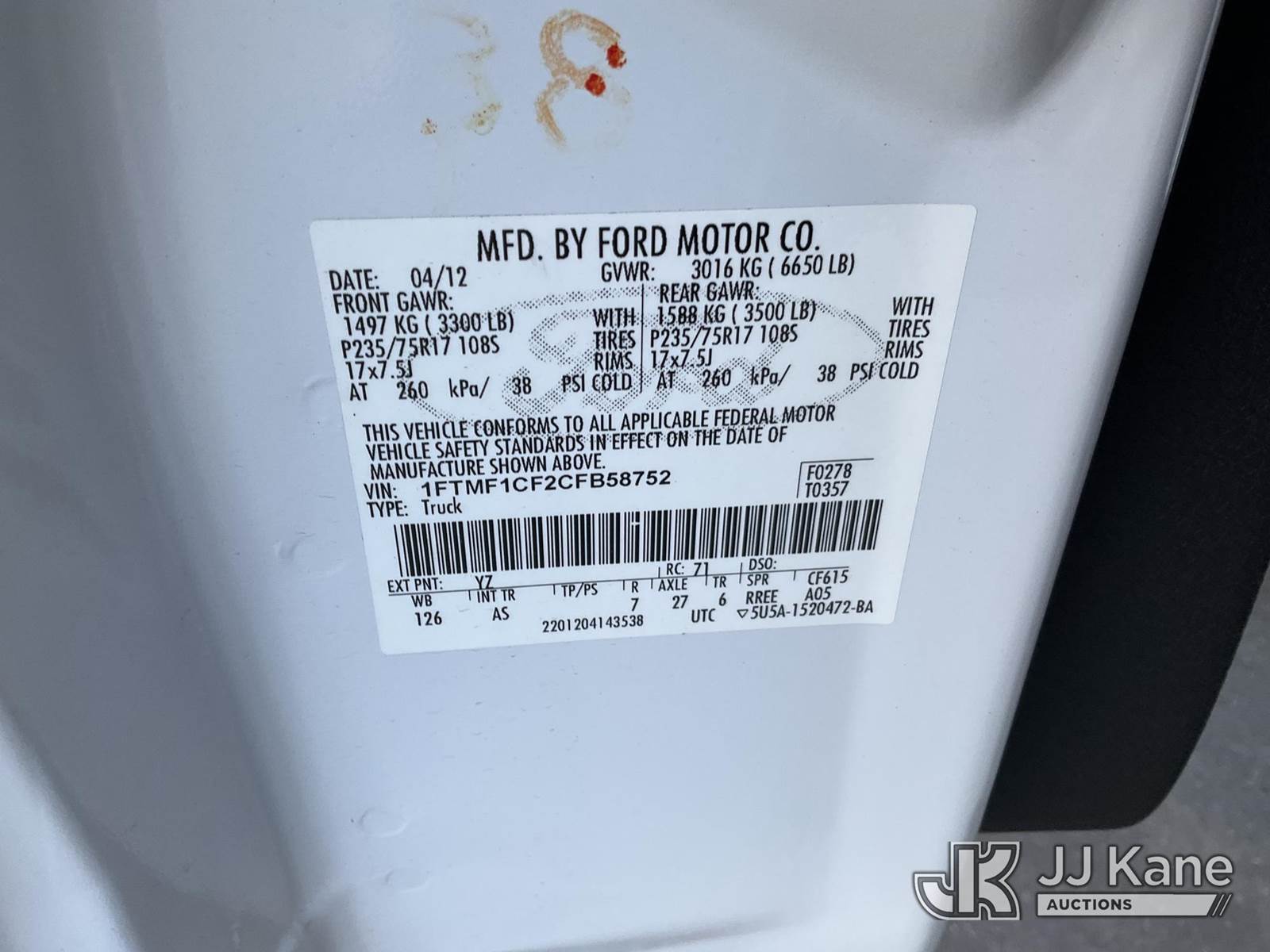 2012 Ford F-150 Pickup Truck, 8-cyl gas, 6-Speed Automatic, A/C, with Tow package, (148,483 miles) (Runs & Moves) This is a Titled Item NOTE: This unit is being sold AS IS/WHERE IS via Timed Auction and is located in Jurupa Valley, CA. Inspection & preview days for this unit are the 2 business days prior to the first day of items closing for this auction, item is located at 4510 Muth Way Jurupa Valley, CA 92509 and hours of operations are 8a-4p. For pre-sale questions, please contact please contact Office Staff @ (310) 353-7140. Dealer License Number 45696. (Buyer is responsible for removal. Assistance by consignor or JJ Kane Auctioneers is not assured.)