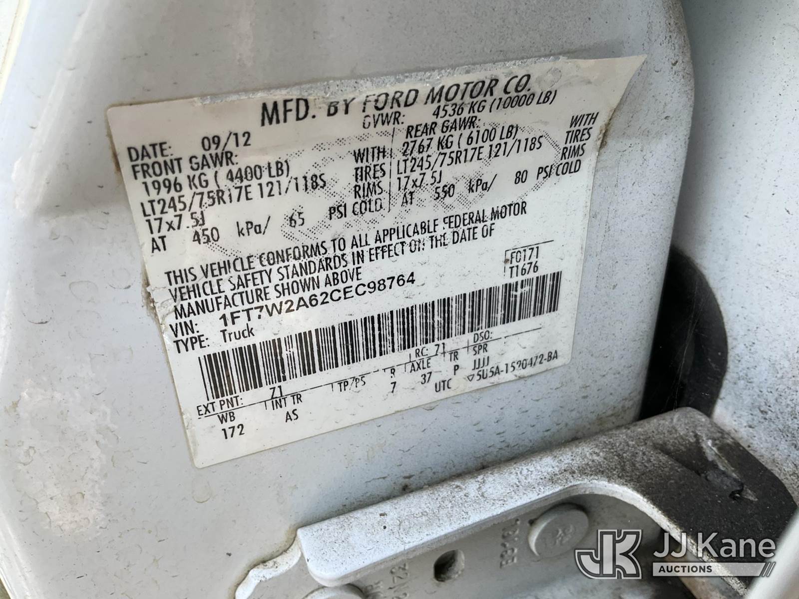 2012 Ford F-250 SD Crew-Cab Pickup Truck, 8-cyl, 6-Speed Automatic, CNG Only, A/C, with Tow package, Liftgate, (091,694 miles) (Runs & Moves) (CNG Tanks Expires In 08-2032, Lift Gate Operates) This is a Titled Item NOTE: This unit is being sold AS IS/WHERE IS via Timed Auction and is located in Jurupa Valley, CA. Inspection & preview days for this unit are the 2 business days prior to the first day of items closing for this auction, item is located at 4510 Muth Way Jurupa Valley, CA 92509 and hours of operations are 8a-4p. For pre-sale questions, please contact please contact Office Staff @ (310) 353-7140. Dealer License Number 45696. (Buyer is responsible for removal. Assistance by consignor or JJ Kane Auctioneers is not assured.)