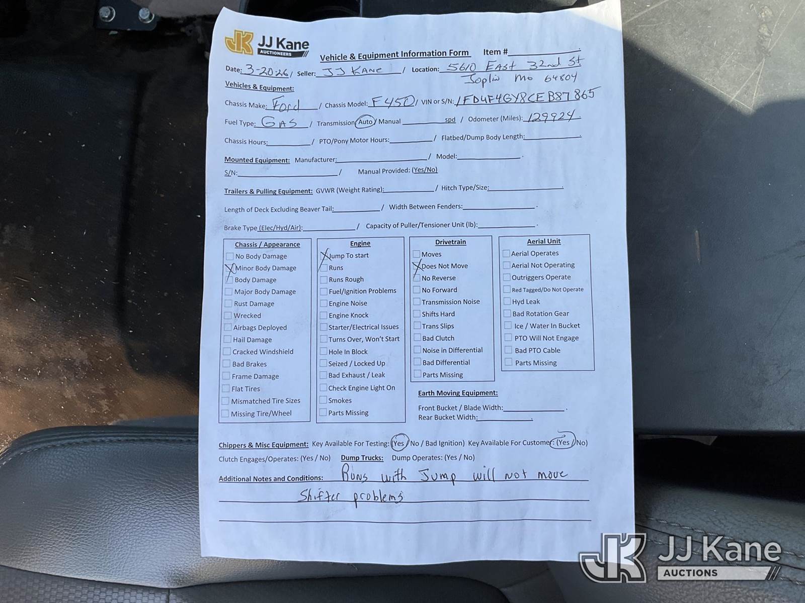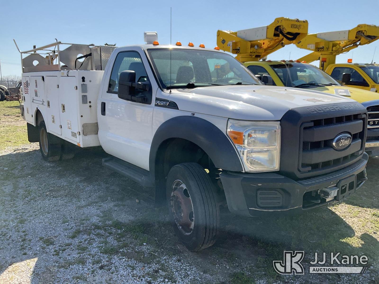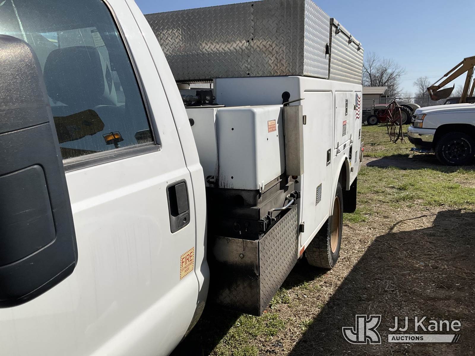 2012 Ford F-450 SD Service Truck, 10-cyl gas, RWD, Auto, A/C, with Cummins Onan Generator (Not Running, Condition Unknown), (129,924 miles (unverified)) FORMER BUCKET TRUCK (Runs) (Jump to Start, Does Not Move, Has Shifter Problems, Aerial Unit Removed) This is a Titled Item NOTE: This unit is being sold AS IS/WHERE IS via Timed Auction and is located in Joplin, MO. Inspection & preview days for this unit are by appointment only; please contact us at contact@jjkane.com or 84-Go-JJKane for more details. (Buyer is responsible for removal. Assistance by consignor or JJ Kane Auctions is not assured.)