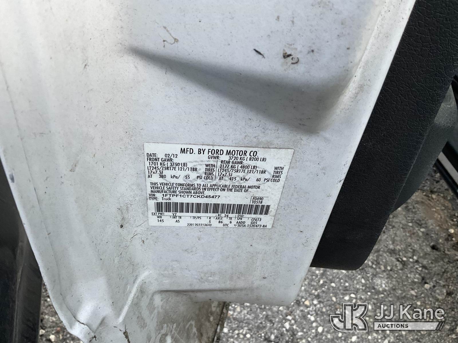 2012 Ford F150 Pickup Truck, 3.5L V6 TURBO gas, 6-Speed Automatic, RWD, A/C, True Mileage Unknown (Not Running, Condition Unknown) (Motor Missing Parts, No Battery, Paint Damage, Tailgate Stuck, Cracked Windshield) (FL Residents Purchasing Titled Items - tax, title & registration fees will be collected at the maximum rate of $400.00 under 25,999 and $800.00 for Over 26,000 and $250.00 trailers - Proof of insurance is mandatory; Out of State Residents Purchasing Title Items - tax will be collected based upon your state rate.) This is a Titled Item NOTE: This unit is being sold AS IS/WHERE IS via Timed Auction and is located in Thonotosassa, FL. Inspection & preview days for this unit are the 2 business days prior to the first day of items closing for this auction, item is located at 11720 N US 301 Thonotosassa, Fl 33592 and hours of operations are 8a-4p. For pre-sale questions, please contact Office Staff @ (813) 986-2485. (Buyer is responsible for removal. Assistance by consignor or JJ Kane Auctions is not assured.)