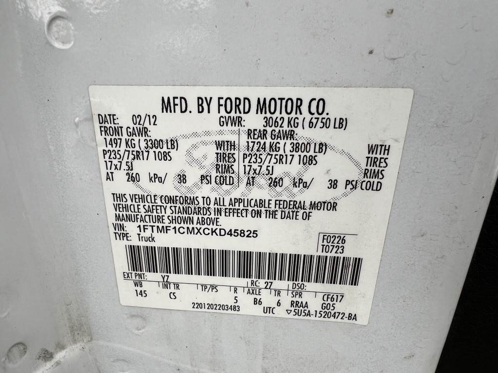 Location: Washougal WA ***End-User Consignment*** VIN: 1FTMF1CMXCKD45825 Engine: 3.7L 6cyl Gas Transmission: Automatic 8' 2" Bed, tow package, ladder rack, power windows, power mirrors, power locks, cruise control, A/C, AM/FM/CD, spring suspension, 245/70R17 tires. Miles: 314,874