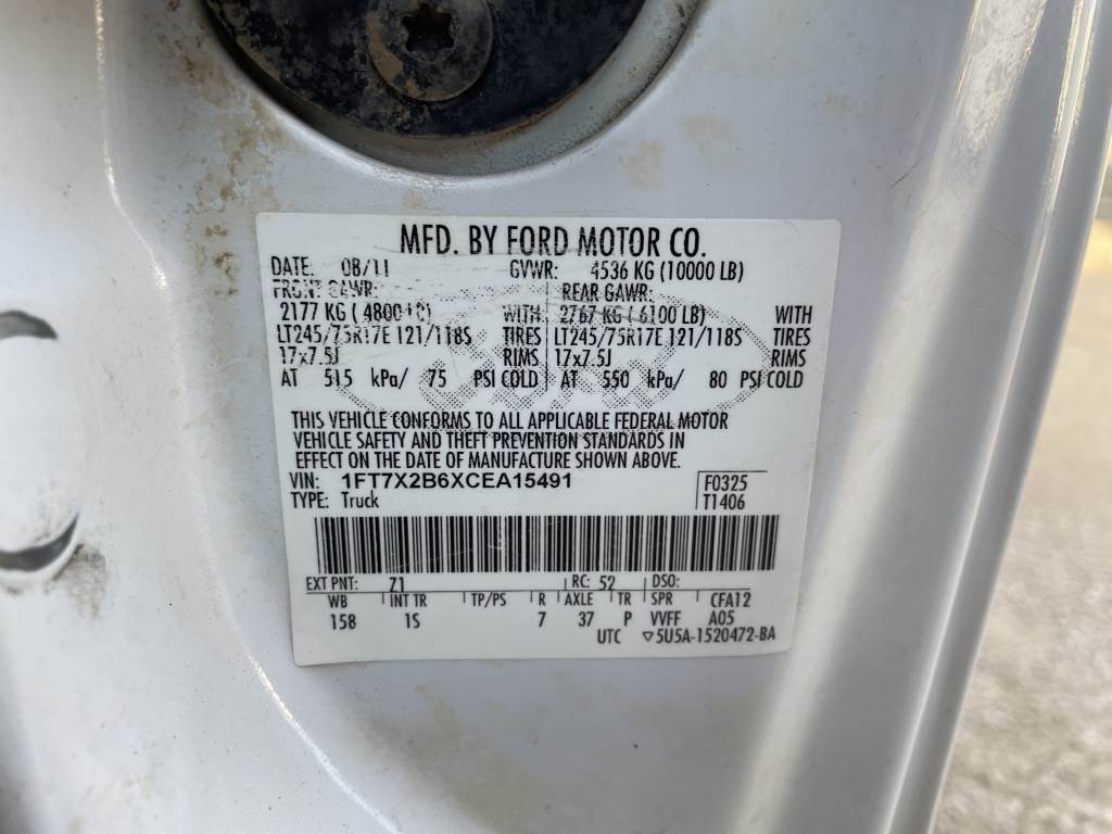 Location: Pocatello ID ***End-User Consignment*** VIN: 1FT7X2B6XCEA15491 Engine: 6.2L 8cyl Gas Transmission: Automatic *Body damage, no gas cap* Tow package, headache rack, Protech tool box, power windows, power mirrors, power locks, cruise control, A/C, AM/FM, spring suspension, 245/75R17 tires.*This item is located in Pocatello, Idaho and can be viewed by appointment only. To schedule a preview or to ask questions about this item call 888-230-8840* Miles: 193,202