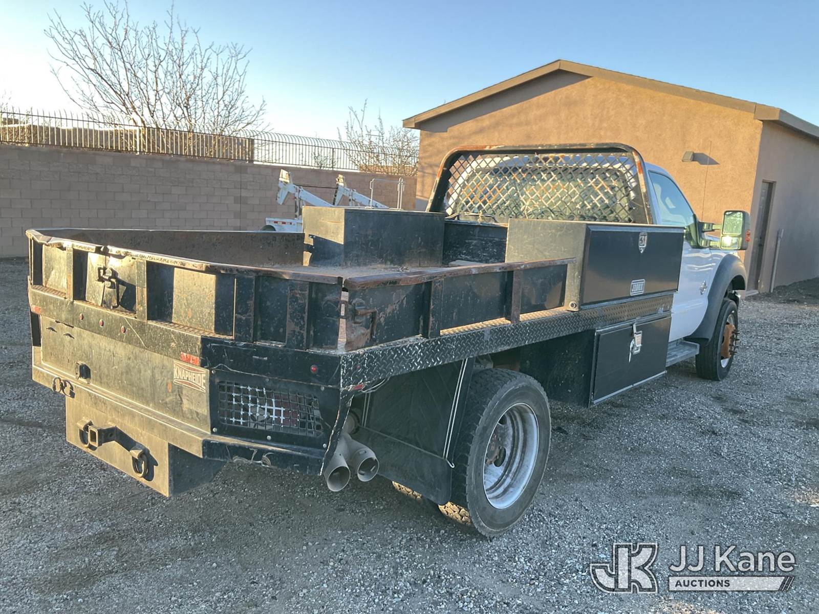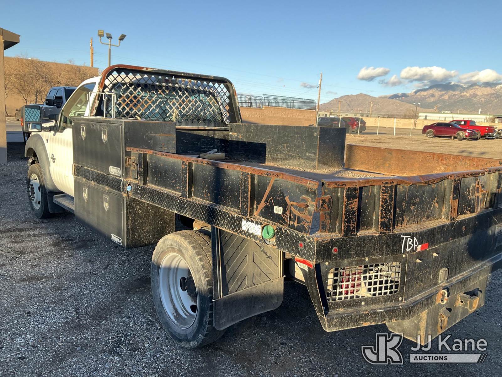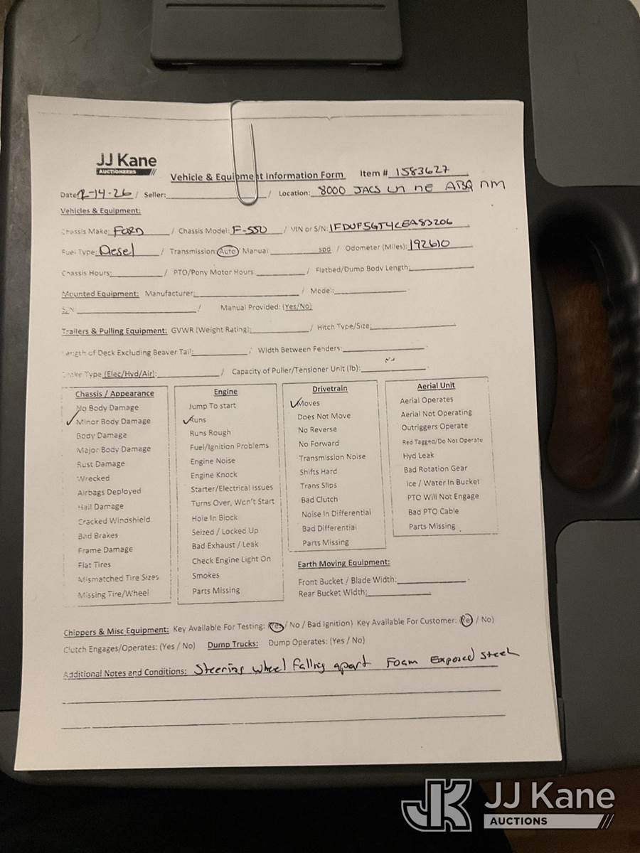 2012 Ford F550 Flatbed Truck, 6.7L V8 OHV 16V diesel, RWD, Auto, A/C, (192,610 miles) (Runs & Moves) (Steering Wheel Wrap Falling Apart, Body Damage) This is a Titled Item NOTE: This unit is being sold AS IS/WHERE IS via Timed Auction and is located in Albuquerque, NM. Inspection & preview days for this unit are by appointment only; please contact us at contact@jjkane.com or 84-Go-JJKane for more details. (Buyer is responsible for removal. Assistance by consignor or JJ Kane Auctions is not assured.)