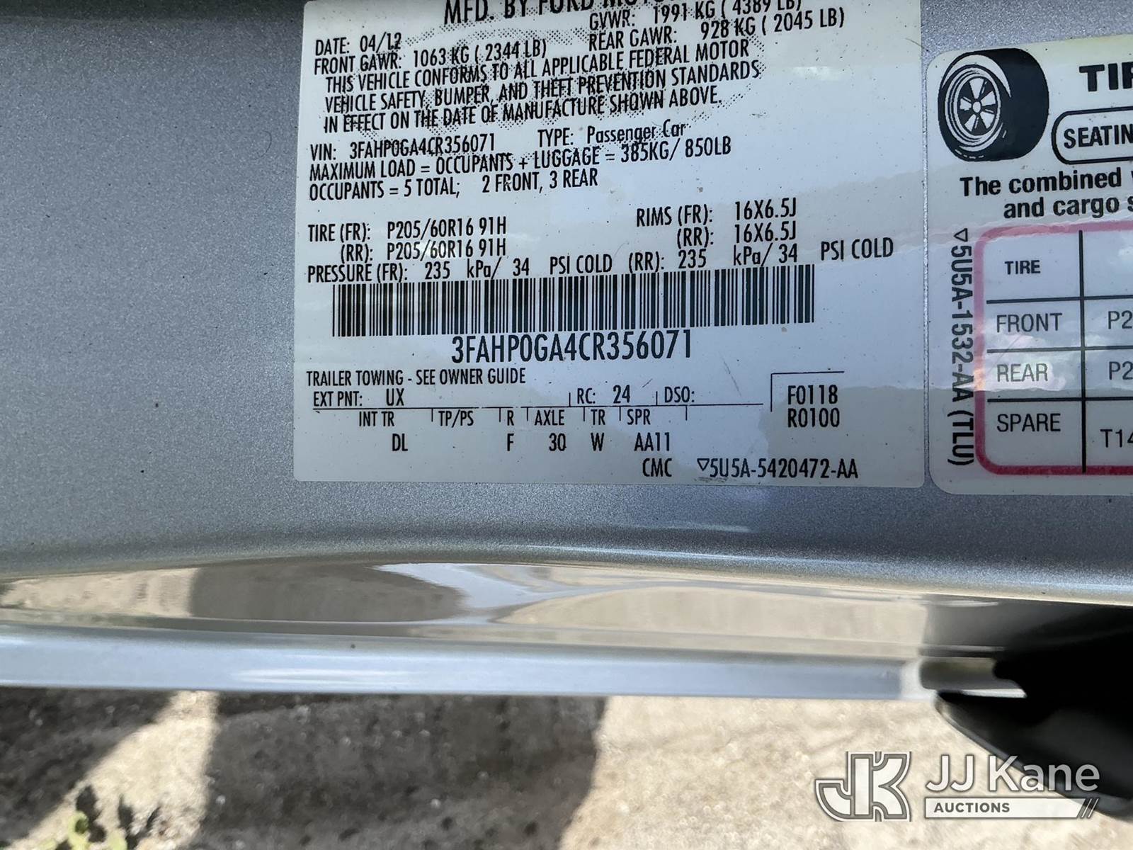 2012 Ford Fusion S 4-Door Sedan, 2.5L L4 DOHC 16V Auto, FWD, Gas, A/C, (84,786 miles) State of FL Unit (Runs & Moves)(FL Residents Purchasing Titled Items - tax, title & registration fees will be collected at the maximum rate of $400.00 under 25,999 and $800.00 for Over 26,000 and $250.00 trailers - Proof of insurance is mandatory; Out of State Residents Purchasing Title Items - tax will be collected based upon your state rate.) (Branded Title - Police Vehicle) This is a Titled Item NOTE: This unit is being sold AS IS/WHERE IS via Timed Auction and is located in Thonotosassa, FL. Inspection & preview days for this unit are the 2 business days prior to the first day of items closing for this auction, item is located at 11720 N US 301 Thonotosassa, Fl 33592 and hours of operations are 8a-4p. For pre-sale questions, please contact Office Staff @ (813) 986-2485. (Buyer is responsible for removal. Assistance by consignor or JJ Kane Auctioneers is not assured.)