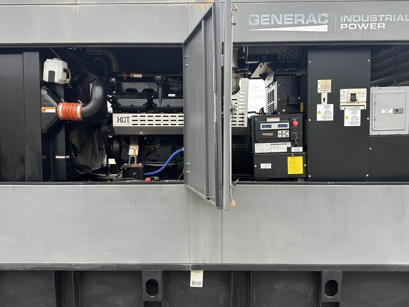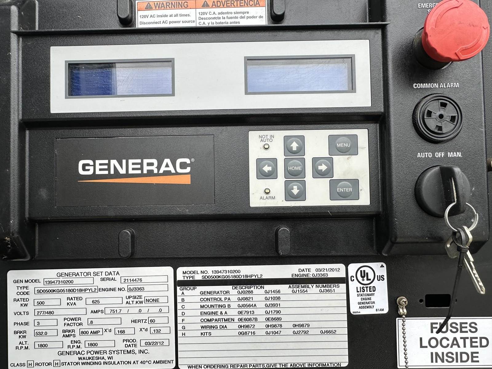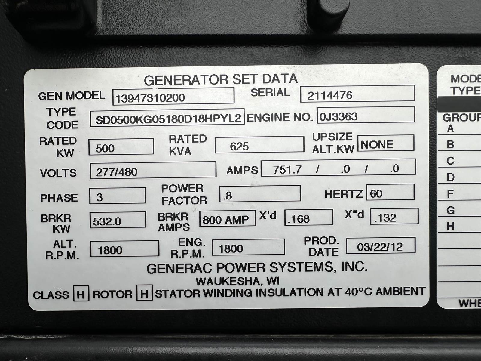 Generac 500 kW standby (450 kW prime) diesel generator set model SD0500, SN-2114476. Doosan P180FE engine rated 679 HP at 1800RPM, SN-101372 EUSOB, EPA Tier 2 emissions. 3/60/277/480V, 12 lead reconnectable to other voltages. 800 Amp main-line circuit breaker. PMG - permanent magnet generator. Generac H-100 digital control panel. Battery charger. Coolant heater. Weather enclosure. 500 gallon sub-base fuel tank. 164 Hrs. Year 2012. Passed load test 1/9/2026. Overall dimensions 64W x 152L x 118H on 6H blocks, 12,000 lbs, mufflers ship loose 48W x 75L x 31H, 750 lbs. FOB Waukesha, WI