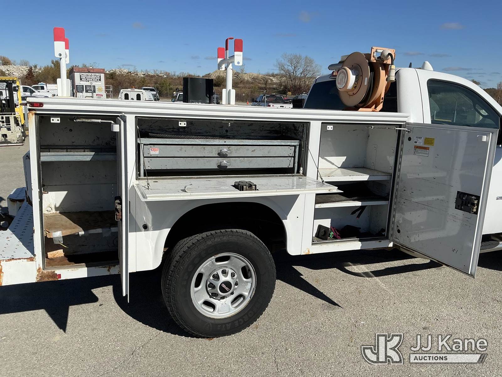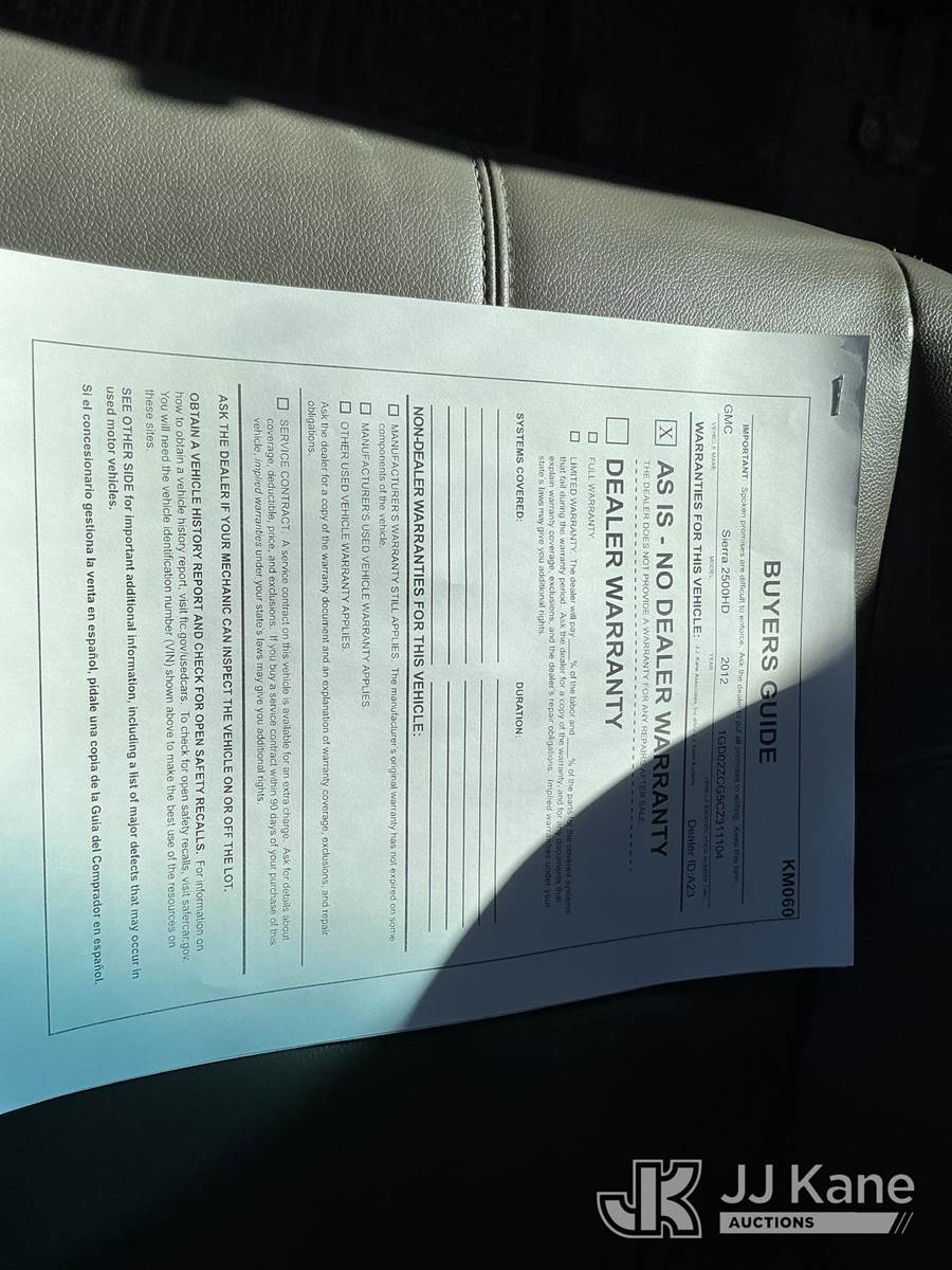 2012 GMC Sierra 2500HD Service Truck, 8-cyl gas, 6-Speed Automatic, 4wd, A/C, with Ladder Rack, Cord Reel,Roll Out Bed Storage Box, (238,765 miles) (Runs & Moves) (Cracked Windshield, TPS Light On) This is a Titled Item NOTE: This unit is being sold AS IS/WHERE IS via Timed Auction and is located in Kansas City, MO. Inspection & preview days for this unit are the 2 business days prior to the first day of items closing for this auction, item is located at 962 Tel Aviv Ave Kansas City, MO 64153 and hours of operations are 8a-4p. For pre-sale questions, please contact Ricky McPherson @ (816) 610-2250. (Buyer is responsible for removal. Assistance by consignor or JJ Kane Auctioneers is not assured.)