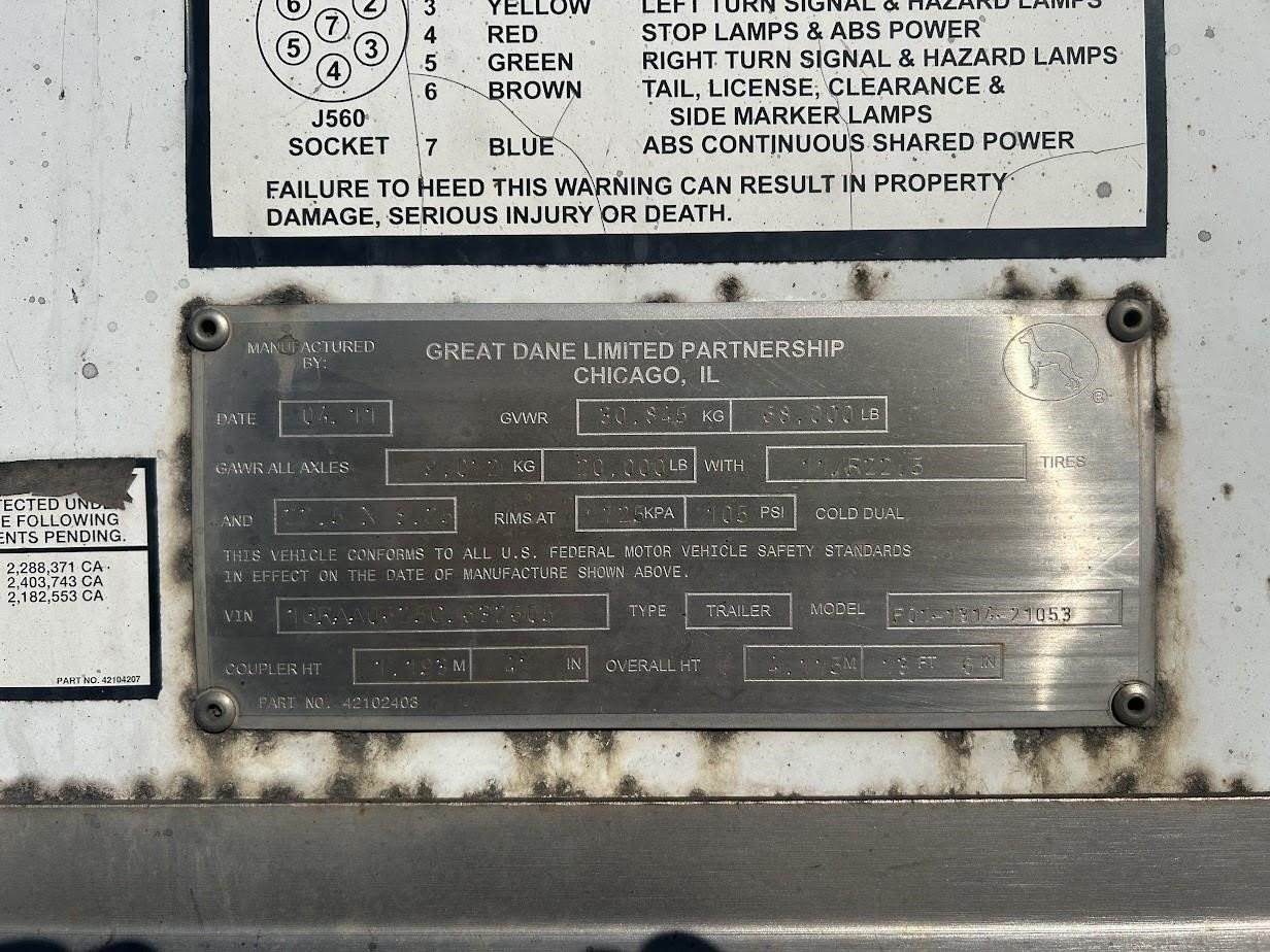 2012 Great Dane 53'x102" Aluminum Sliding Tandem Dry Van Trailer, 168" Side Height, 80,000 GVW, Air Ride Suspension, Air Brakes 50%, 11R22.5 Tires (9/32), Steel Wheels, Swing Door, Solid Roof, Wood Floor, E-Track, 12 Winches