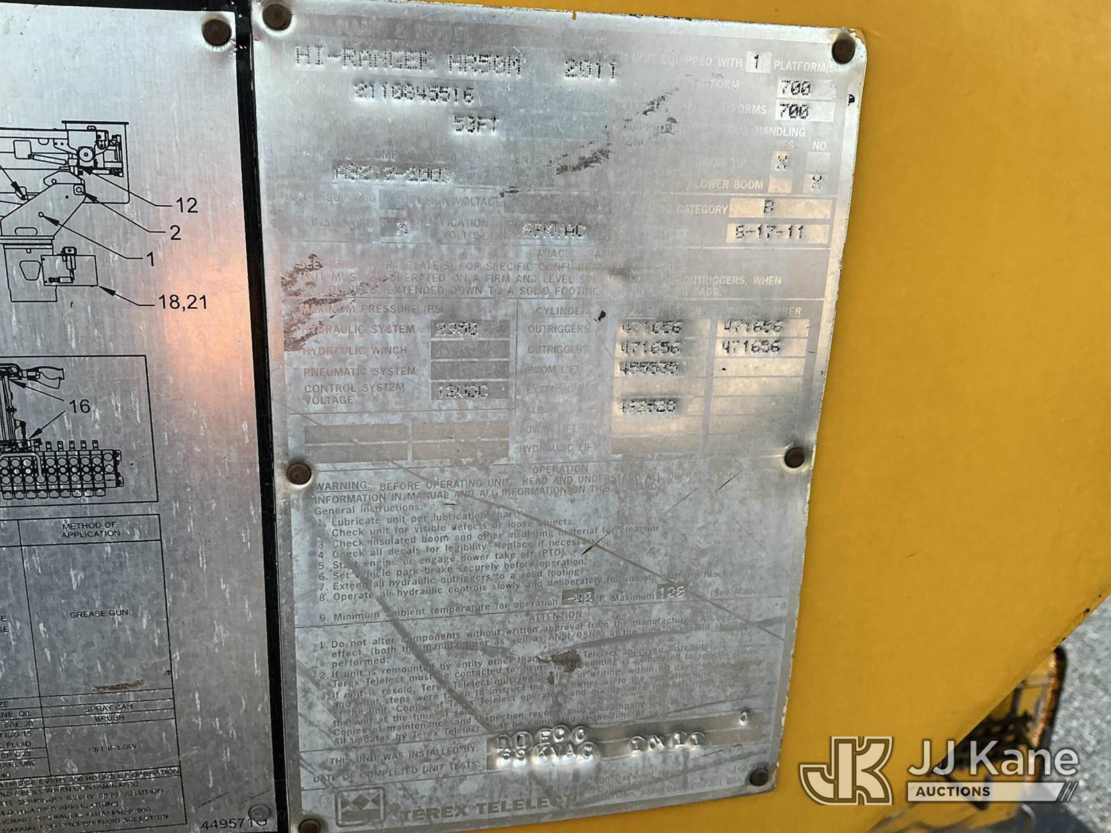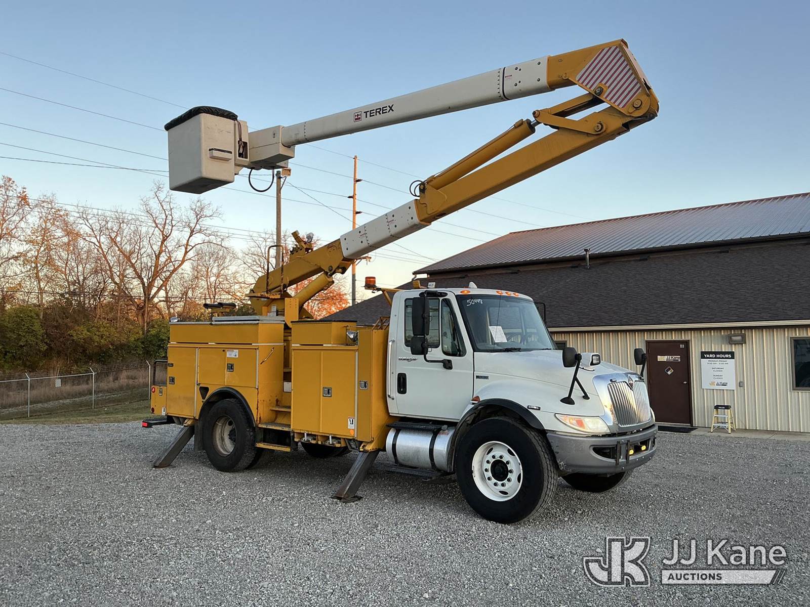 Hi-Ranger HR-50M, 55 ft, Articulating & Telescopic Material Handling Bucket Truck s/n 2110045516, with two-man bucket & 4 hyd outriggers, rear mounted on 2012 International 4300 Utility Truck, 7.6L L6 Auto, diesel, A/C, with Inverter , (161,140 miles) (Runs, Moves & Upper Operates) (Body/Paint Damage) (Reads 15,771 hours) This is a Titled Item NOTE: This unit is being sold AS IS/WHERE IS via Timed Auction and is located in Fort Wayne, IN. For more information & removal arrangements please contact Office Staff @ (260) 450-9822. Load out by appointment only, Buyer/Hauler must present copy of paid invoice upon arrival. Purchaser acknowledges ALL lots must be removed within (10) business days of Auction, or a storage fee may be incurred. For load out and pick up information, please reference the hauler sheet sent out after purchase. (Manuals provided in cab) (Buyer is responsible for removal. Assistance by consignor or JJ Kane Auctioneers is not assured.)