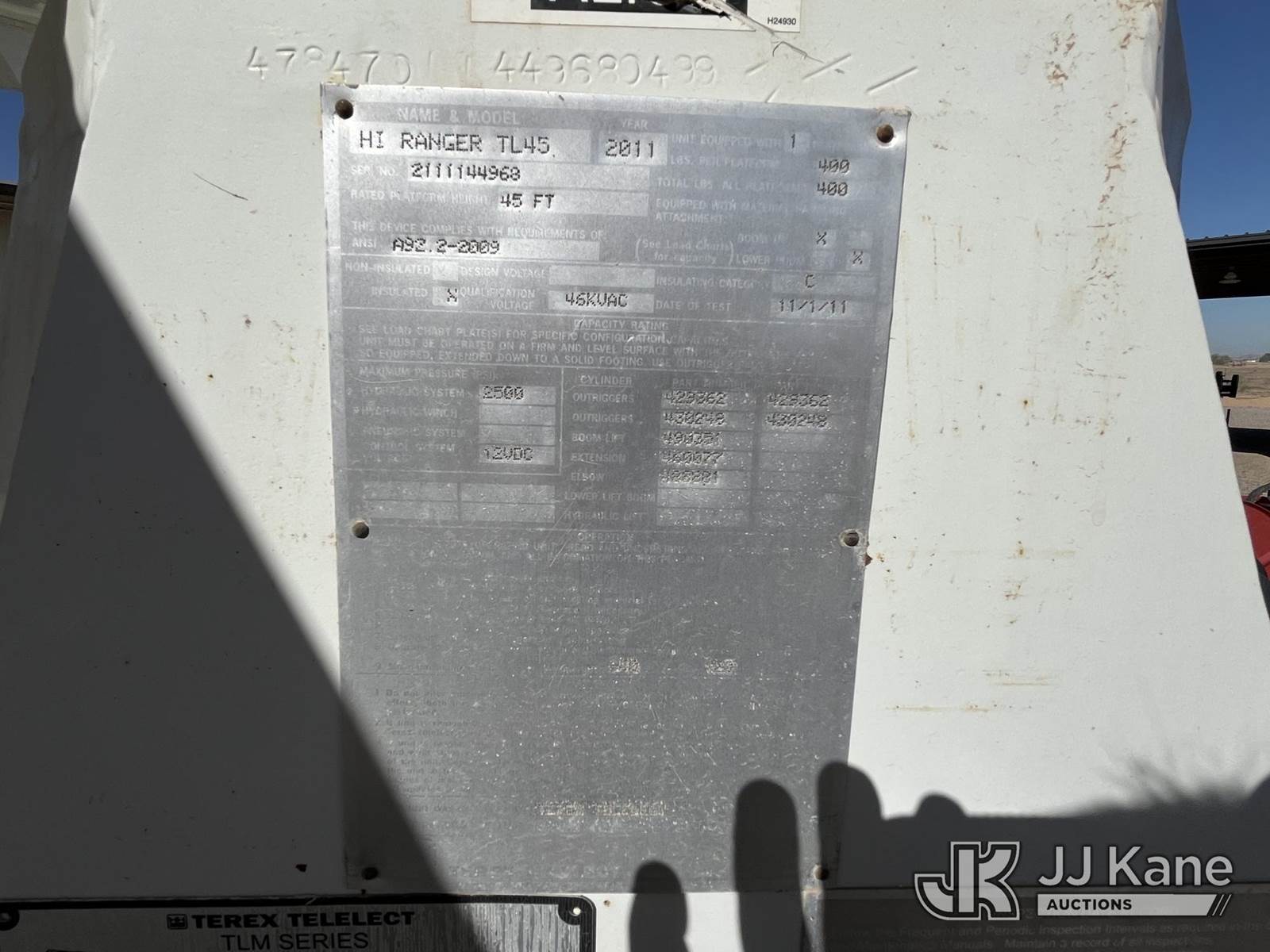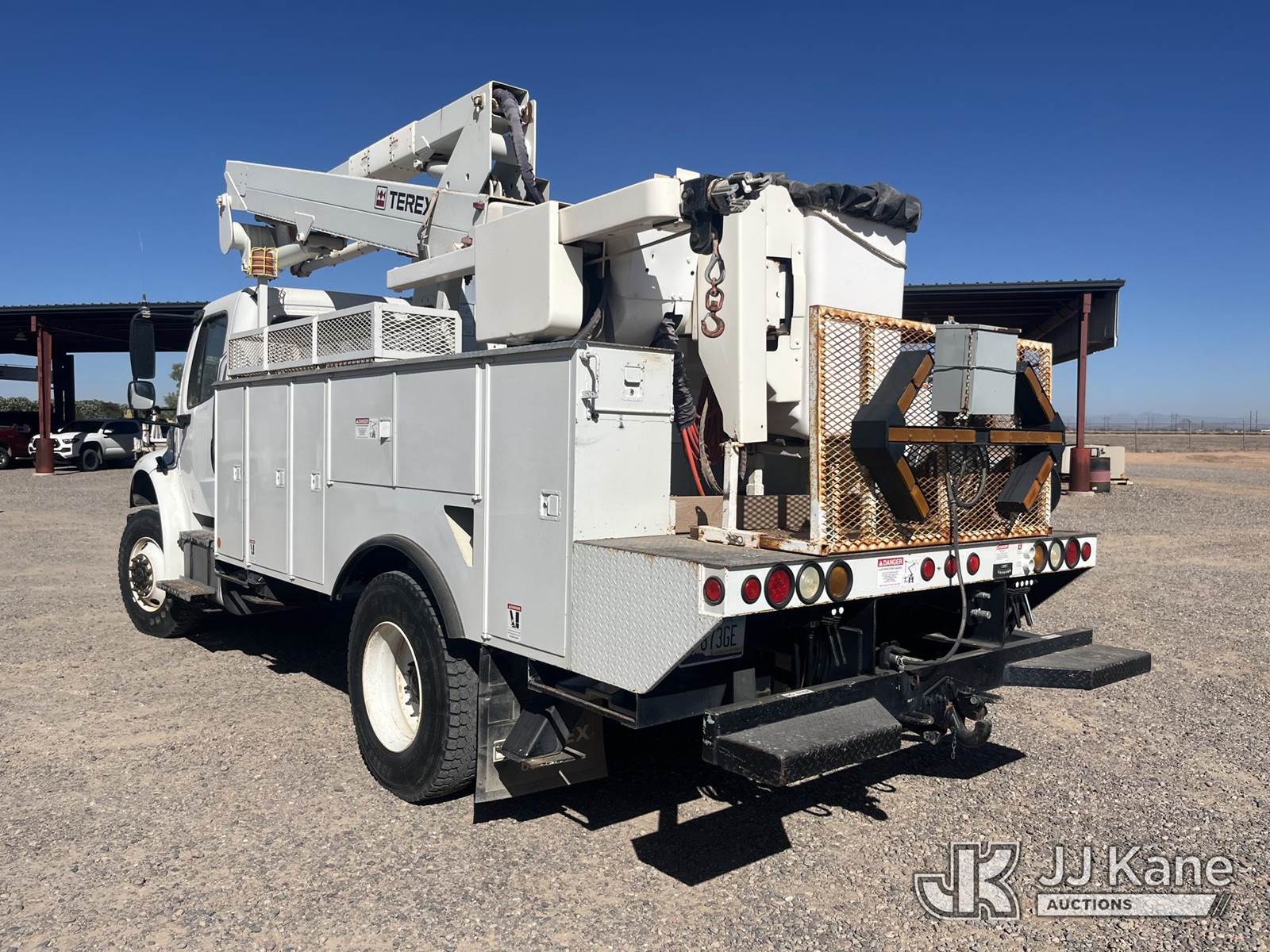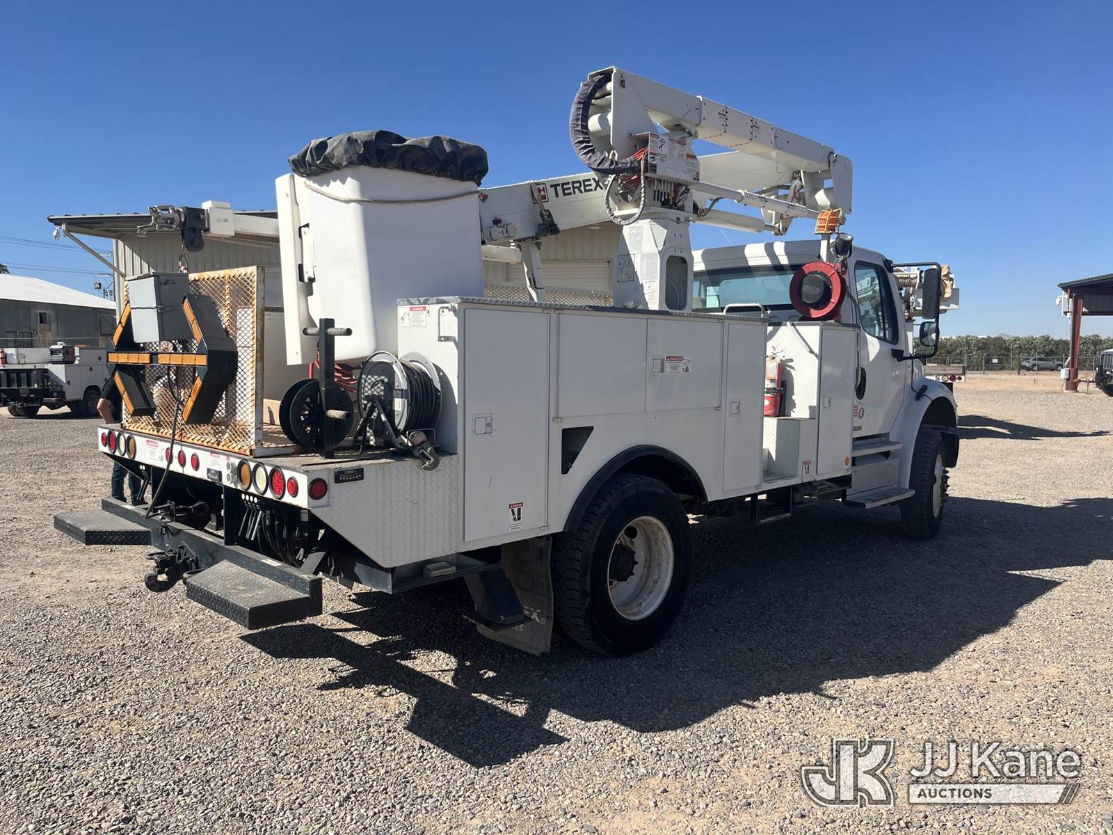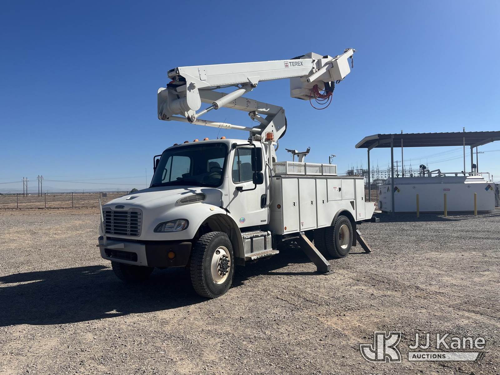 HiRanger TL45-M, 50 ft, Articulating & Telescopic Material Handling Bucket Truck s/n 2111144968, with Single-Man Bucket, 4 Hydraulic Outriggers, rear mounted on 2012 Freightliner M2 106 4x4 Utility Truck, 6.7L diesel, Auto, A/C, (49,368 miles) (Runs, Moves & Upper Operates) This is a Titled Item NOTE: This unit is being sold AS IS/WHERE IS via Timed Auction and is located in Casa Grande, AZ. Contact Robbie Osmun for details. 480-606-8465. Removal by appointment only, Buyer/Hauler must present copy of paid invoice upon arrival. Purchaser acknowledges ALL lots must be removed within 7 business days of Auction, or a storage fee may be incurred. For Removal and Pick Up information, please reference the release form sent out after purchase. (Missing manuals, See Auction Company for Manufacturers Information to obtain manuals) (Buyer is responsible for removal. Assistance by consignor or JJ Kane Auctions is not assured.)