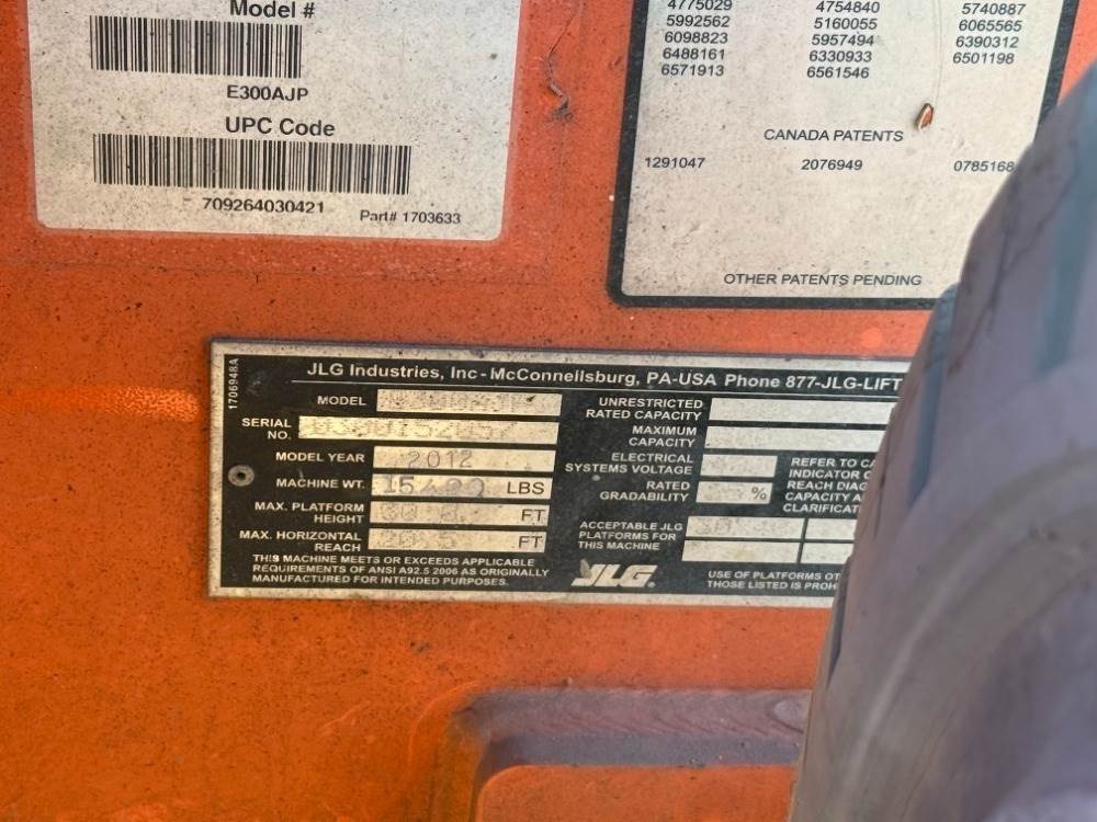 2012 JLG E300AJP BOOMLIFT, electric, 2-stage, 30' articulated boom, 5' jib, 1,139 hours indicated. s/n:0300152057