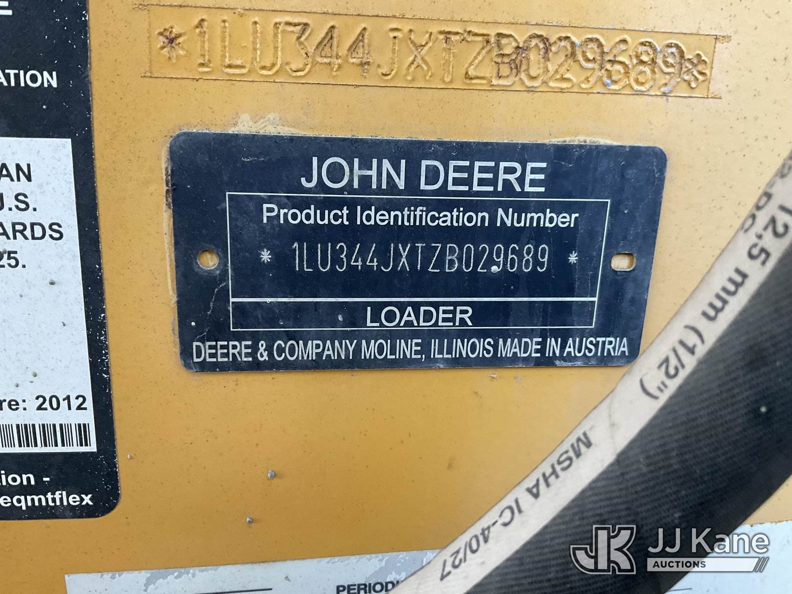 2012 John Deere 344J 4x4 Tractor Loader, s/n 1LU344JXTZB029689, John Deere powershift, diesel, A/C, with 4 in 1 bucket, EROPS, (Runs, Moves & Operates) (Rear End Body Damaged) (Reads 2,091 hours) NOTE: This unit is being sold AS IS/WHERE IS via Timed Auction and is located in Dixon, CA. Inspection & preview days for this unit are the 2 business days prior to the first day of items closing for this auction, item is located at 8668 Sparling Ln Dixon, CA 95620 and hours of operations are 8a-4p. For pre-sale questions, please contact JJ Kane Staff at (707) 678-8060 (dixon@jjkane.com). Dealer License Number 45696. (Buyer is responsible for removal. Assistance by consignor or JJ Kane Auctioneers is not assured.)