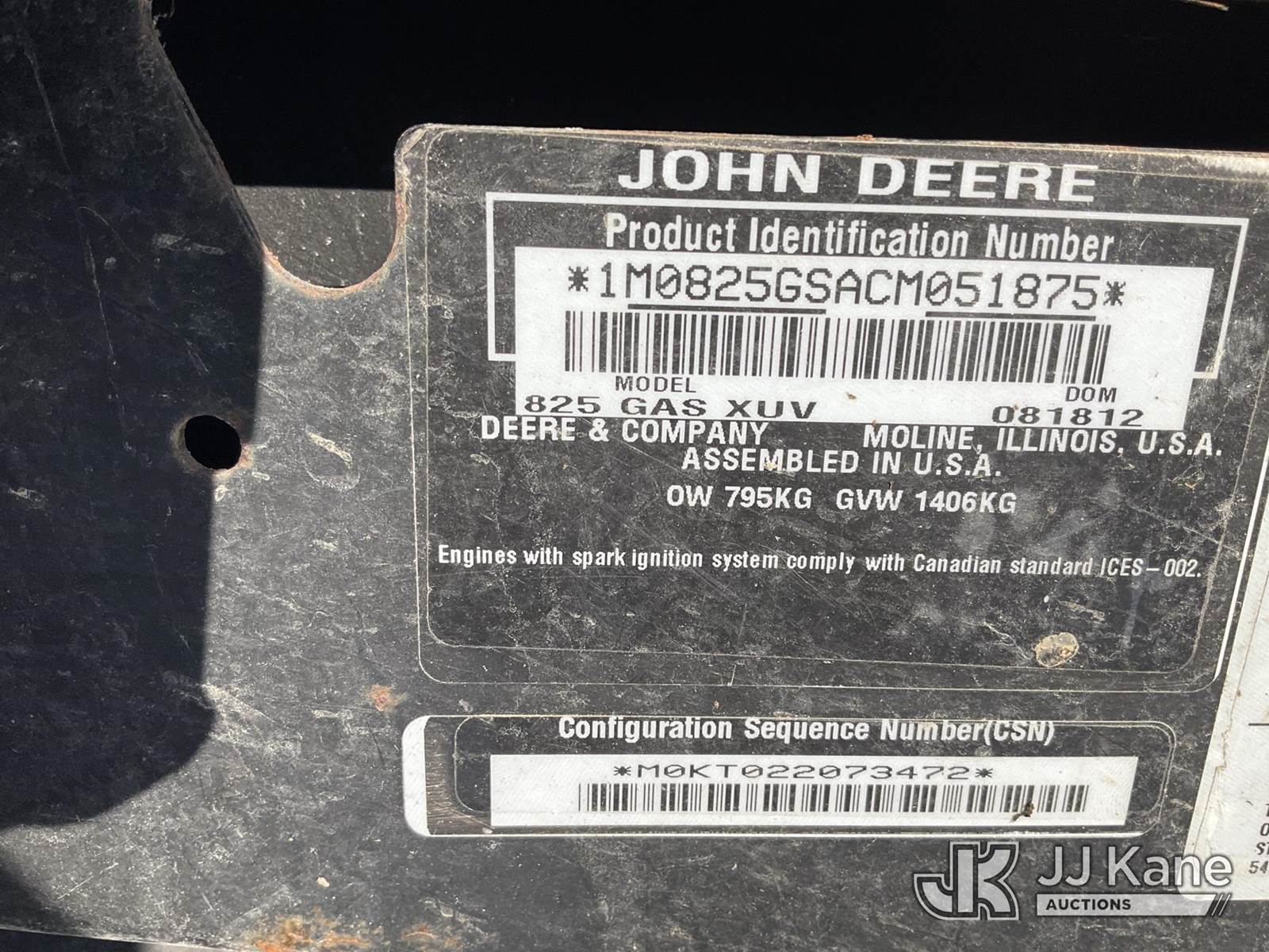 2012 John Deere Gator XUV 825i 4x4 Utility Vehicle, s/n 1M0825GSTCM051875, gas, with enclosed cab, (1,391 miles) (No Title) (Runs, Moves & Dump Operates) NOTE: This unit is being sold AS IS/WHERE IS via Timed Auction and is located in Shrewsbury, MA. Inspection & preview days for this unit are the 2 business days prior to the first day of items closing for this auction, item is located at 11 Fortune Blvd Shrewsbury, MA 01545 and hours of operations are 8a-4p. For pre-sale questions, please contact Rob Gifford @ (508) 864-4126. (Buyer is responsible for removal. Assistance by consignor or JJ Kane Auctions is not assured.)