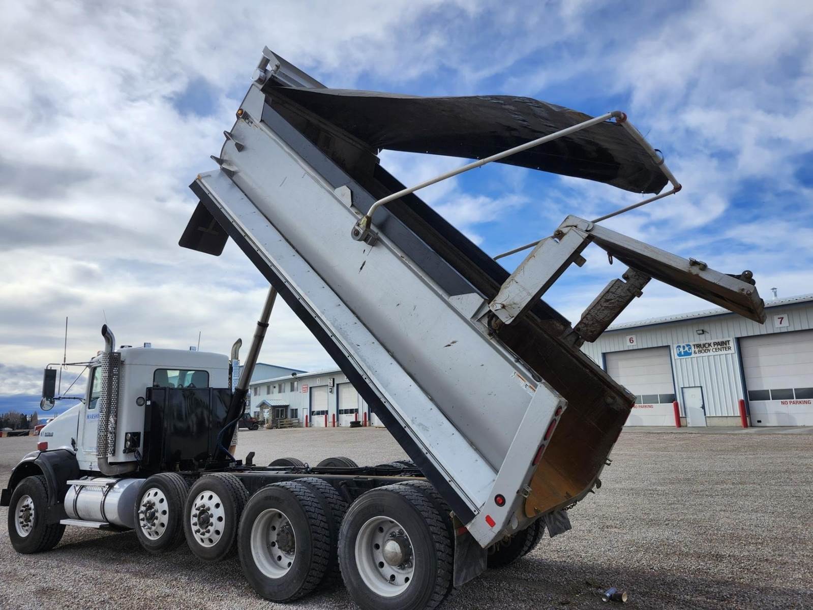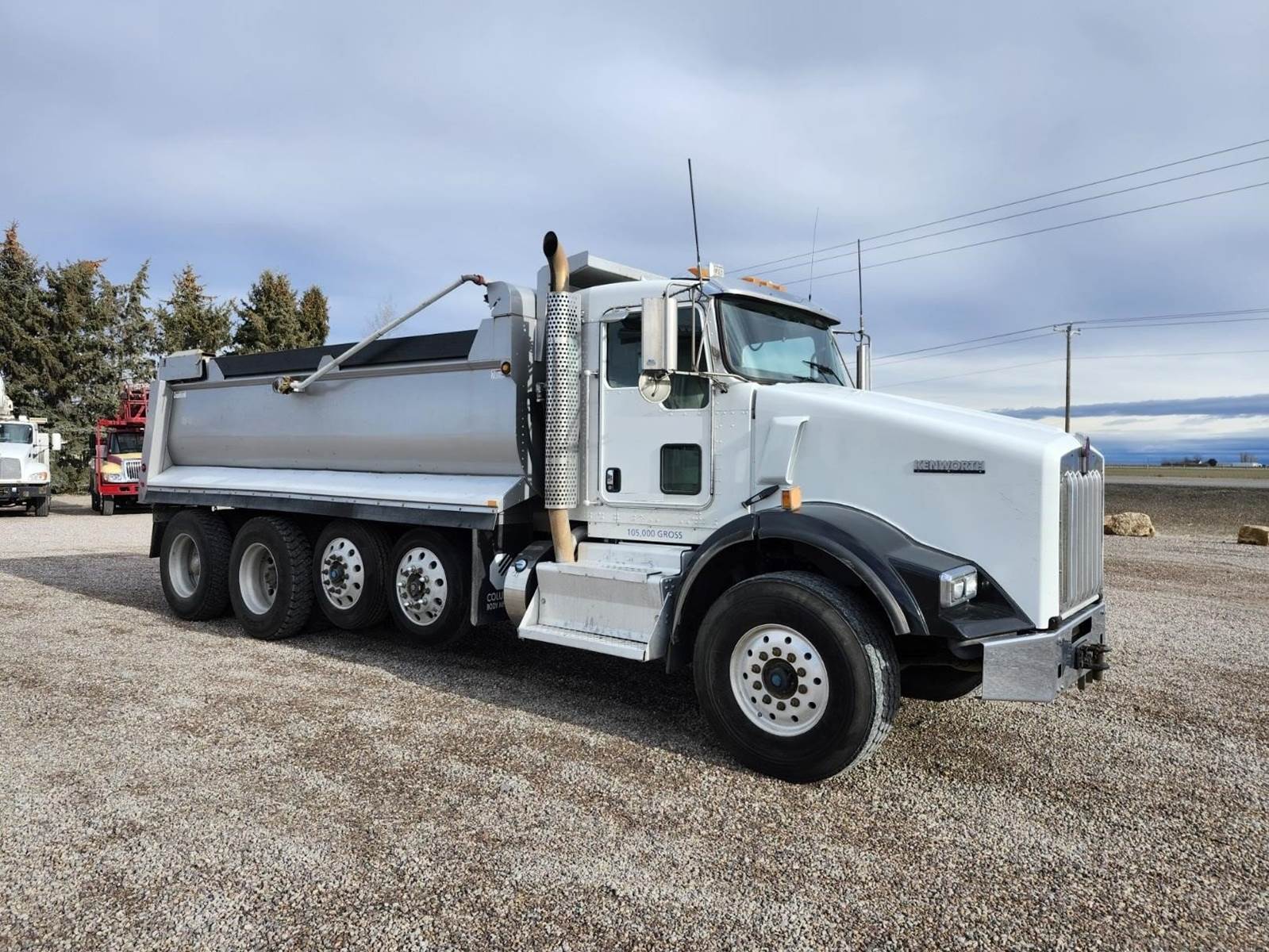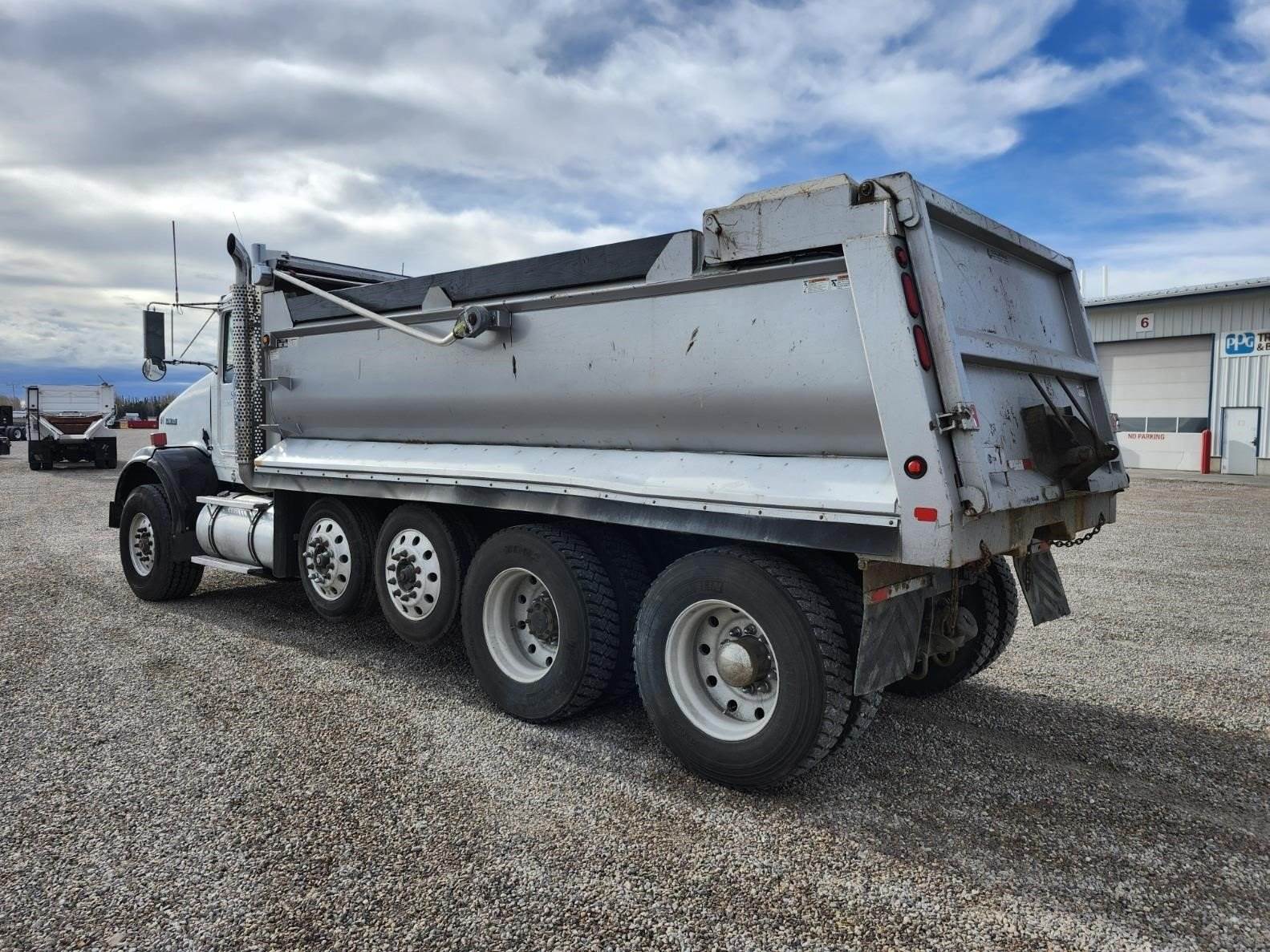 Columbia 18' semi-elliptical bed, 18 yard, Hi-lift gate, Electric tarp, Air gate release, Pintle hitch with rear hydraulics for pup, 3 way lockers, Double frame, 2 steerable lift axles- 13,200 each, 20K FA- 46K RA, Paccar MX13 485HP, Jake brake, 18 speed transmission, 4.10 ratio, Chalmers suspension, 160" Cab/trunnion, A/C, Cruise, Tilt wheel, Power passenger window, Power passenger mirror, Heated mirrors, Engine block heater, Clean truck!! 2012 Kenworth T800