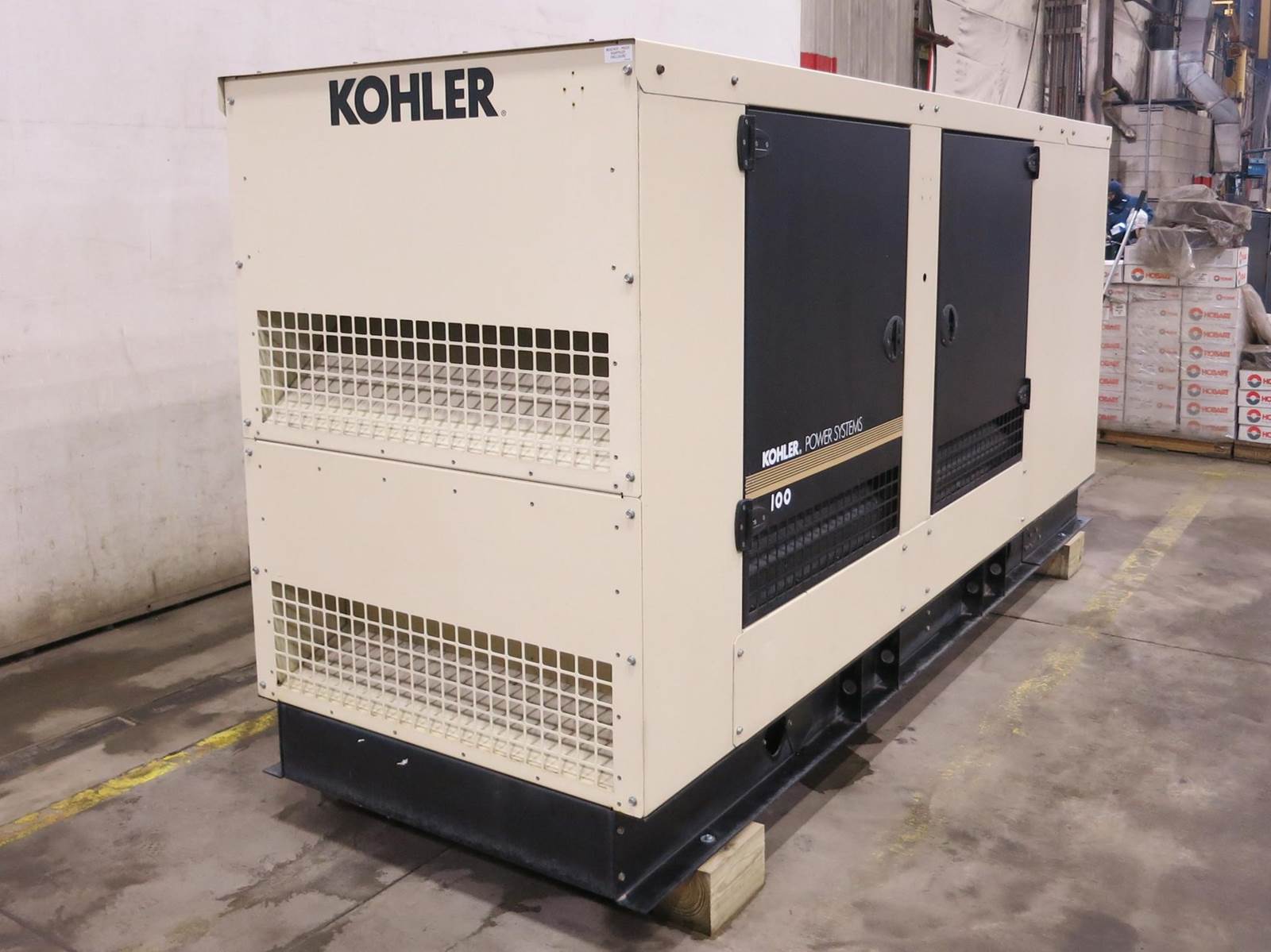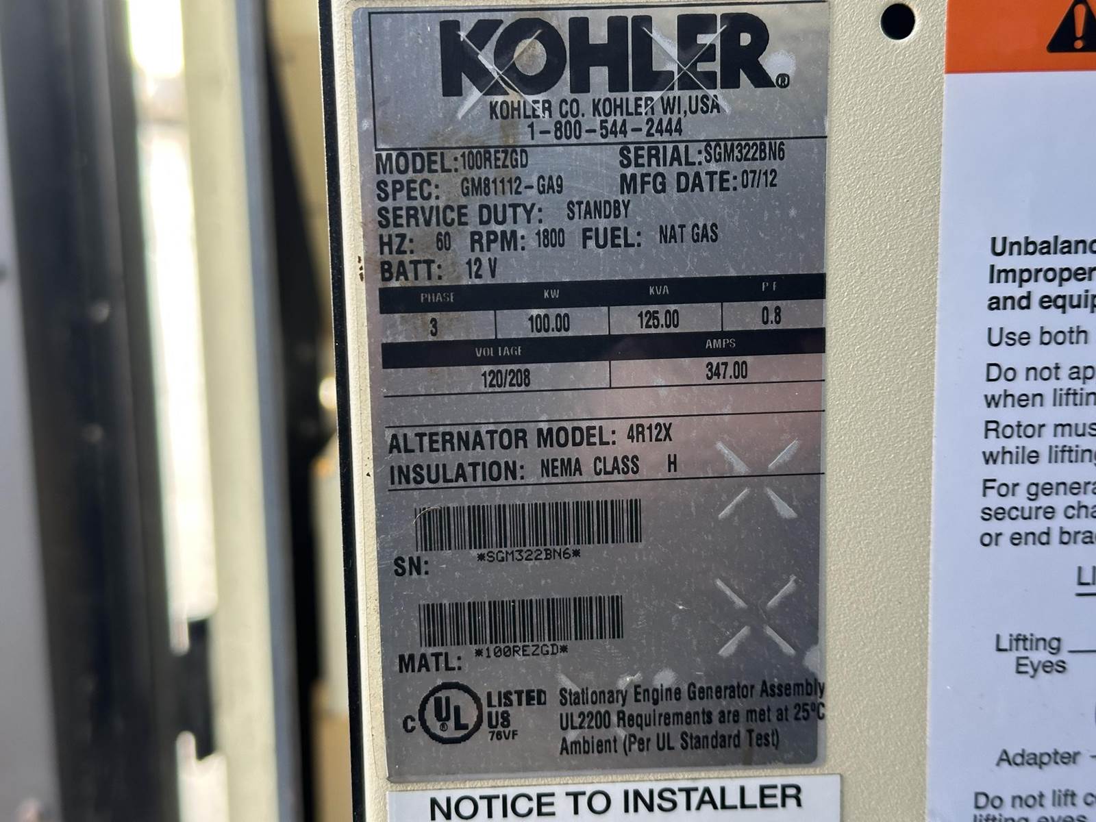 Kohler 100 kW standby natural gas / propane generator set model 100REZGD, SN-SGM32JT5Z. GM 5.7L engine rated 155 HP at 1800 RPM, SN-57L24667, EPA certified. 3/60/120/208V, 12 lead reconnectable to other voltages (rated 91 kW if reconnected to single phase) 800 Amp main-line circuit breaker. PMG permanent magnet generator. UL2200 listed stationary engine generator assembly. Decision-Maker 550 digital control panel. Battery charger. Coolant heater. Sound attenuated enclosure. 405 Hrs. Year 2012. Load test pending. Overall dimensions 45W x 139L x 74H on 6H blocks, 3450 lbs. FOB Waukesha, WI