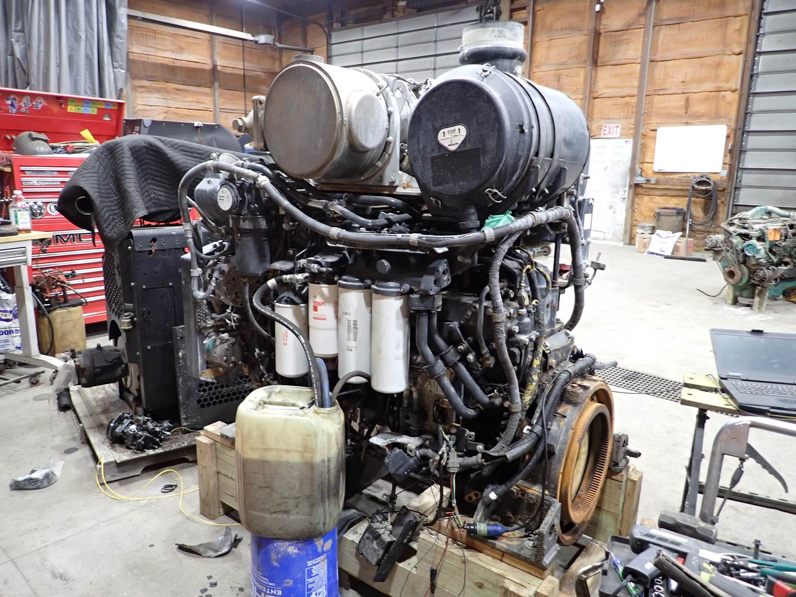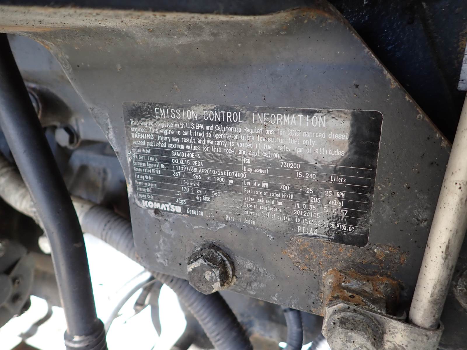 2012 Komatsu SAA6D140E-6 diesel engine, turbocharged, air to air aftercooled, common rail electronic fuel system, tier 4 interim emissions rating, serial # 730200, EPA family # CKLXL15.2EDA, 357 HP at 1900 RPM rating, complete as pictured. TEST RAN CLEAN, SHOWING 92 PSI OIL PRESSURE AT IDLE. NO SMOKE OR EXCESSIVE BLOWBY OBSERVED DURING COLD TEST RUN. ENGINE WAS REMOVED FROM A WA500-7 WHEEL LOADER AND COMES AS PICTURED. LONG BLOCK/EXTENDED LONG BLOCK SHOULD BE USEABLE IN D155AX-7 DOZERS AND OTHER CONSTRUCTION APPLICATIONS. HARD TO FIND ENGINE -- DON'T MISS IT !