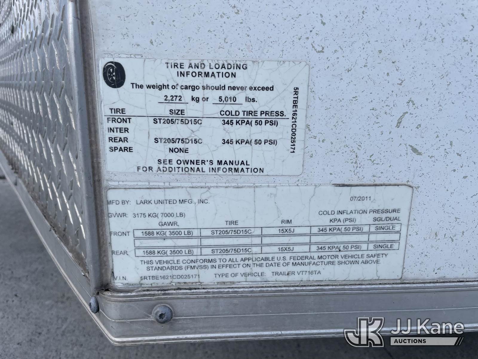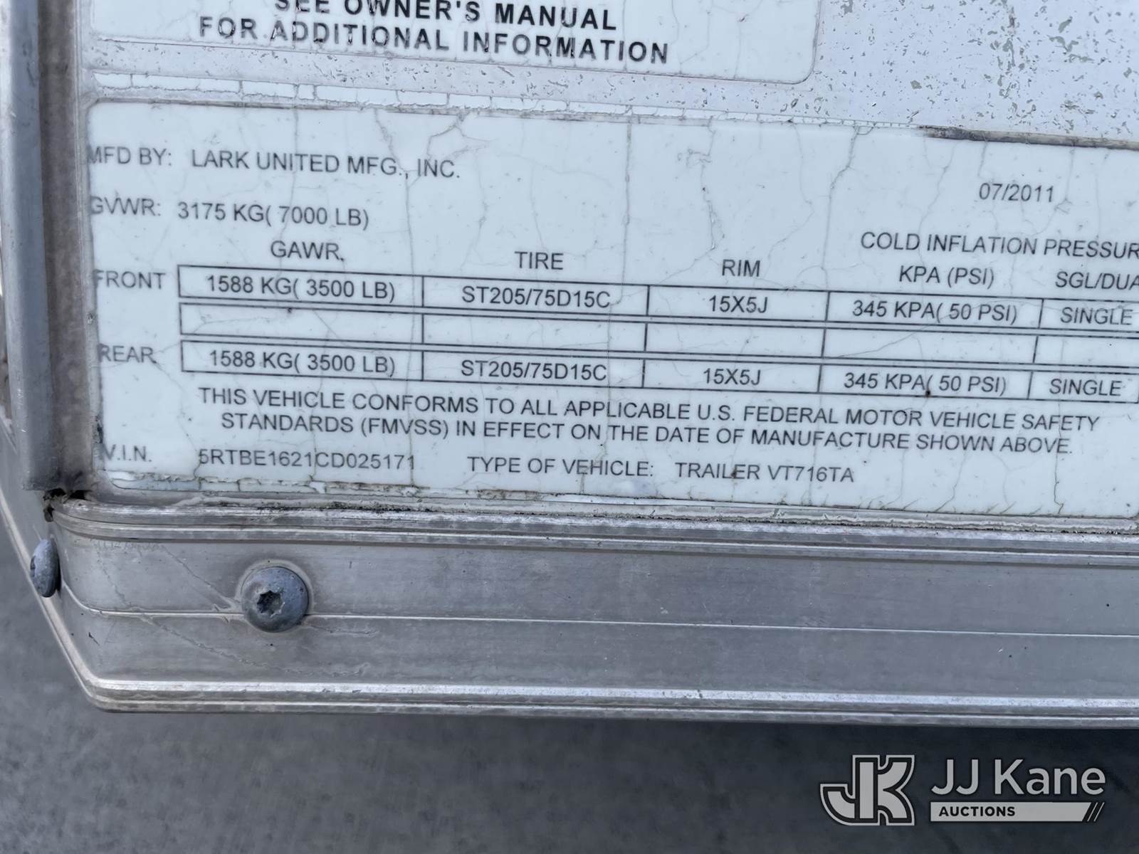 2012 Lark United Manufacturing Enclosed Trailer, s/n 5RTBE1621CD025171, (Non-Titled, Body Damage) NOTE: This unit is being sold AS IS/WHERE IS via Timed Auction and is located in Riviera Beach, FL. For pre-sale questions or to schedule an inspection, please call Gregg Martini @ 561-519-5775. Removals require 24-hr Notice by Appointment Only, Buyer/Hauler must present copy of Paid-in-Full JJ Kane Release Form upon arrival. Purchaser acknowledges ALL lots must be removed within 10 business days of Auction, or a towing & storage fee may be incurred. (Buyer is responsible for removal. Assistance by consignor or JJ Kane Auctions is not assured.)