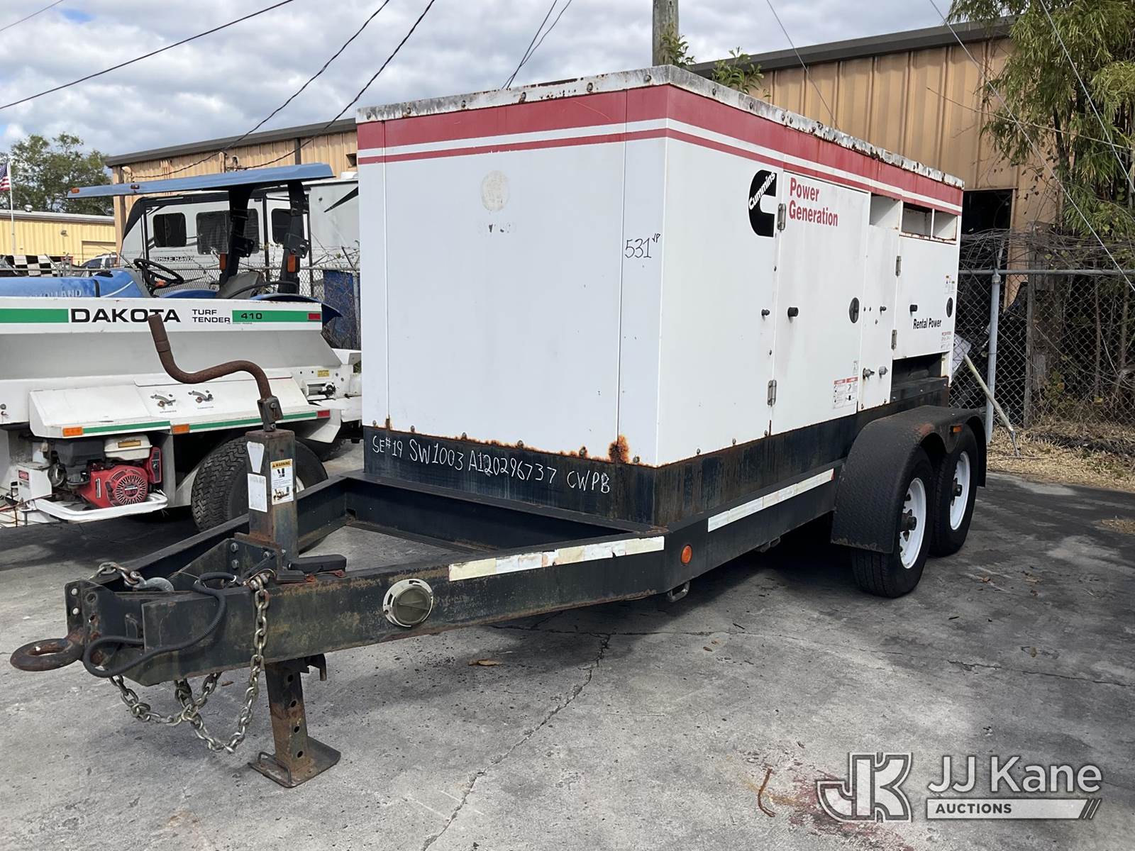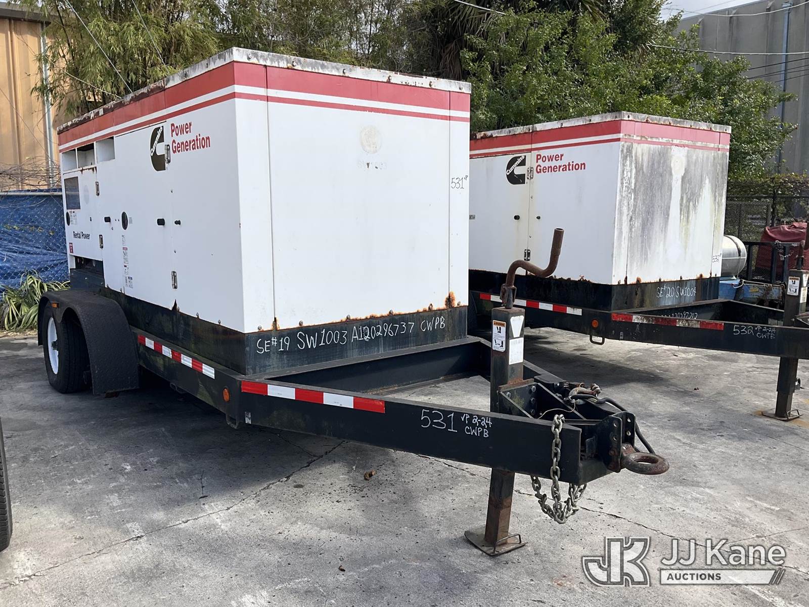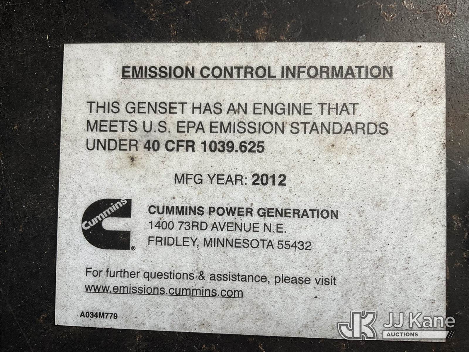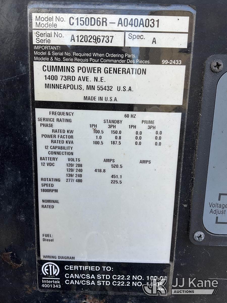 2012 Metro C150D6R-A040A031 Generator 150KW, s/n A120296737, Cummins diesel, t/a trailer mtd. VIN: 1M9DA19B2CM646059 (No Title) (Towable, Operating Condition Unknown, Body Damage & Frame Rust, One Front Tire Missing) (Reads 3,617 hours) NOTE: This unit is being sold AS IS/WHERE IS via Timed Auction and is located in West Palm Beach, FL. For Pick Up & Removal information, please contact: Andy Garcia @ 561-215-0085. Removals require 24-hr Notice by Appointment Only, Buyer/Hauler must present copy of Paid-in-Full JJ Kane Release Form upon arrival. Purchaser acknowledges ALL lots must be removed within 10 business days of Auction, or a towing & storage fee may be incurred. (Buyer is responsible for removal. Assistance by consignor or JJ Kane Auctions is not assured.)
