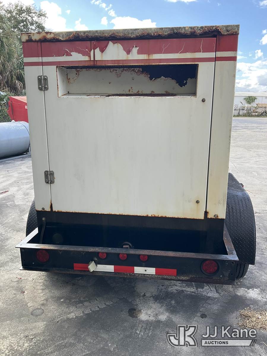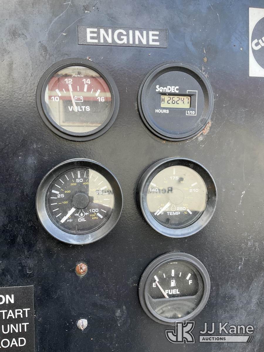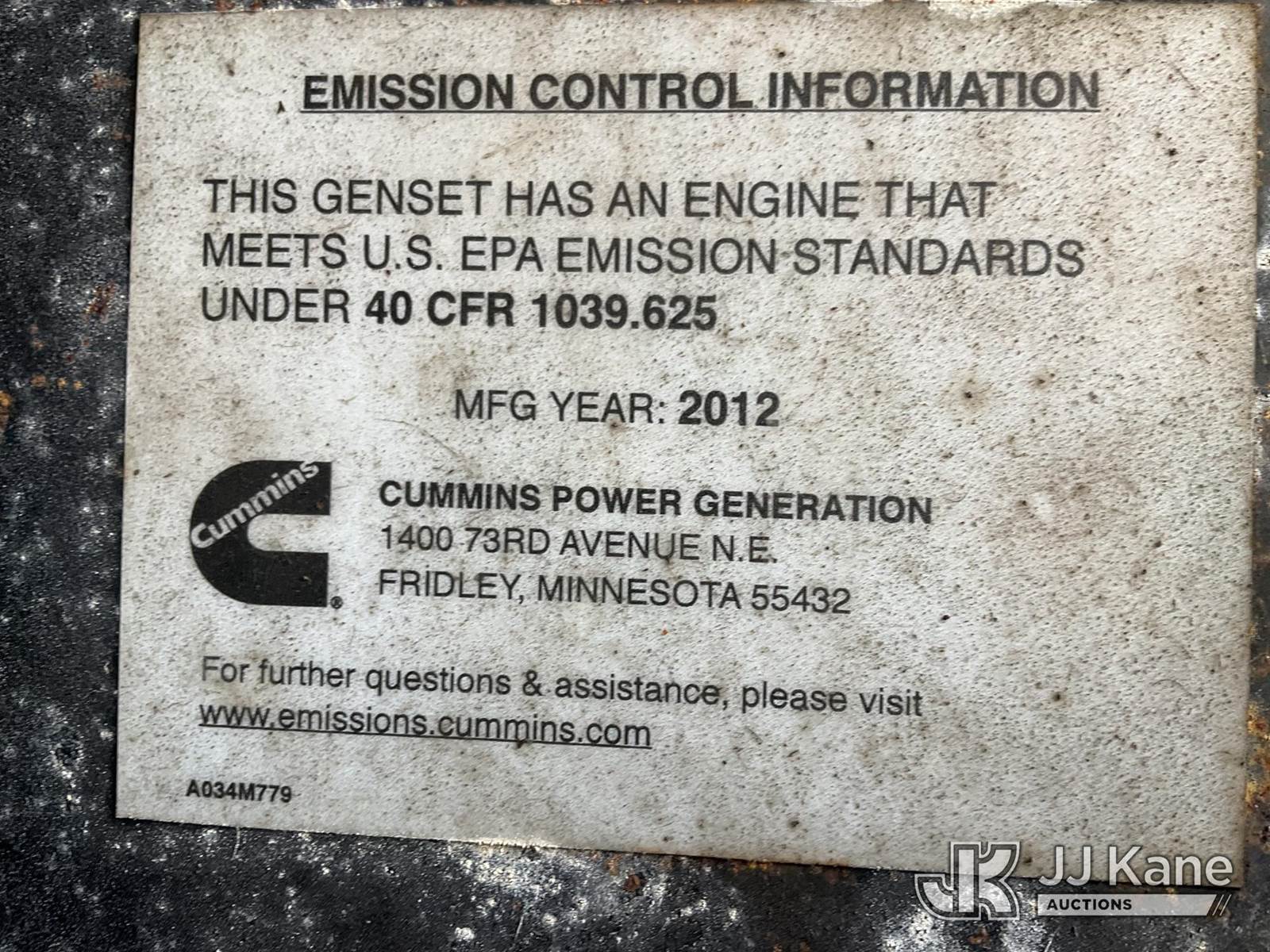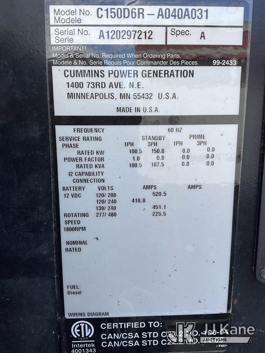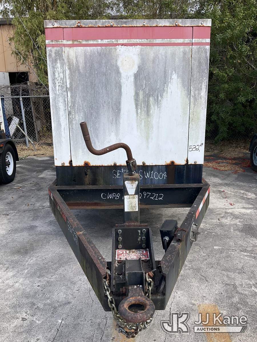2012 Metro C150D6R-A040A031 Generator 150KW, s/n A120297212, Cummins diesel, t/a trailer mtd. VIN: 1M9DA19B9CM646060 (No Title) (Towable, Electric Hitch Plug Missing, Operating Condition Unknown, Shut-Down & Warning Light On, Body Damage & Frame Rust, Two Front Tires Missing) (Reads 2,624 hours) NOTE: This unit is being sold AS IS/WHERE IS via Timed Auction and is located in West Palm Beach, FL. For Pick Up & Removal information, please contact: Andy Garcia @ 561-215-0085. Removals require 24-hr Notice by Appointment Only, Buyer/Hauler must present copy of Paid-in-Full JJ Kane Release Form upon arrival. Purchaser acknowledges ALL lots must be removed within 10 business days of Auction, or a towing & storage fee may be incurred. (Buyer is responsible for removal. Assistance by consignor or JJ Kane Auctions is not assured.)