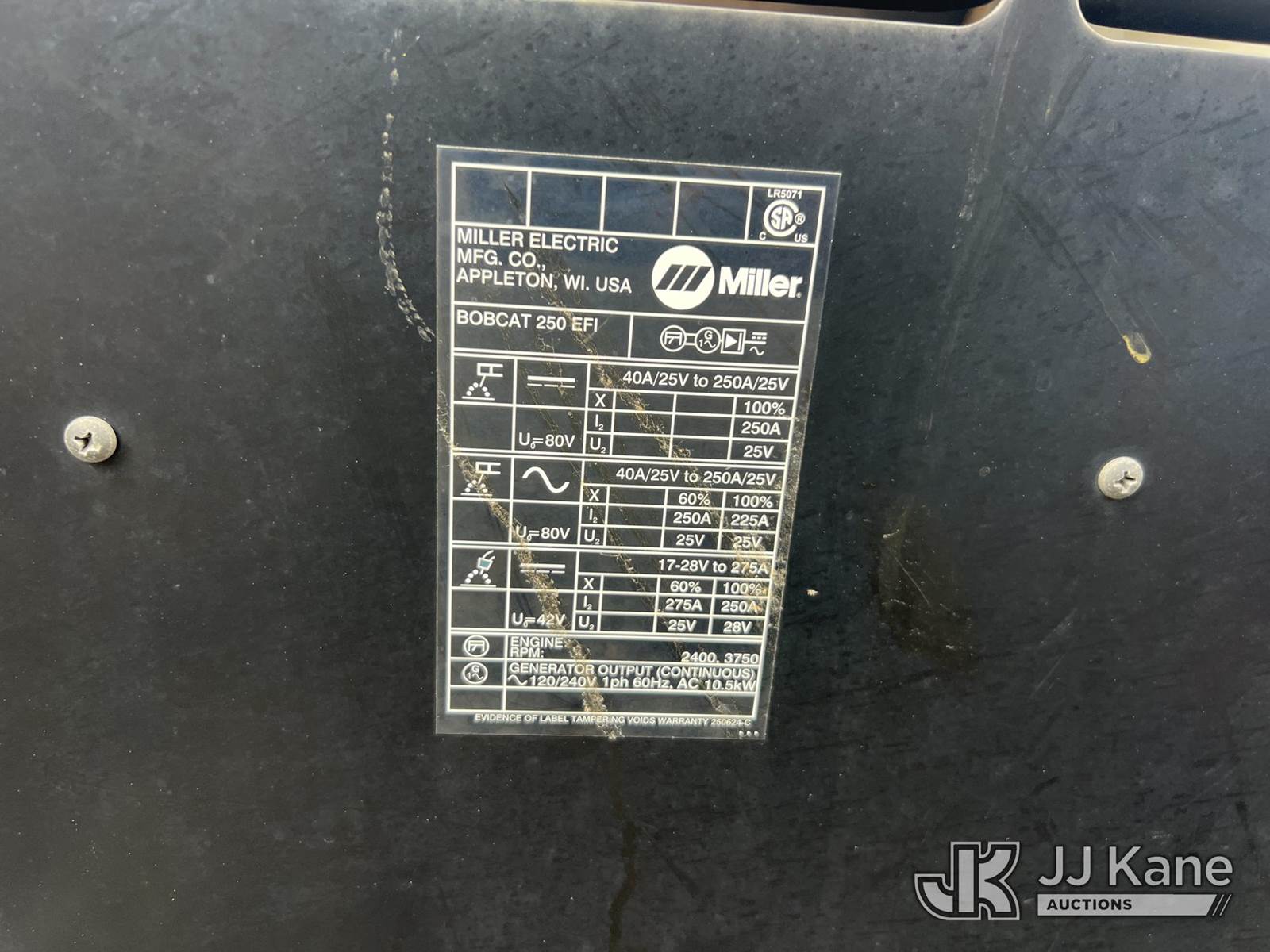 2012 Miller Bobcat 250 EFI s/n MC3311242R, Kohler Gas, (Municipality Owned) (Runs) (Reads 86 hours) NOTE: This unit is being sold AS IS/WHERE IS via Timed Auction and is located in Albertville, AL. Inspection & preview days for this unit are by appointment only; please contact us at contact@jjkane.com or 84-Go-JJKane for more details. Alabama Auctioneer Michael Whitebread - License # 5592. (Buyer is responsible for removal. Assistance by consignor or JJ Kane Auctions is not assured.)