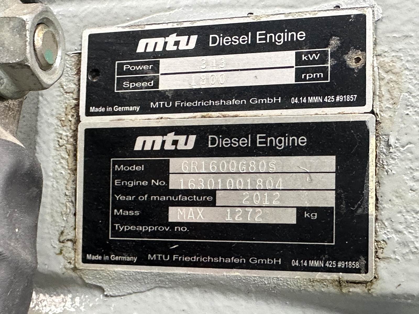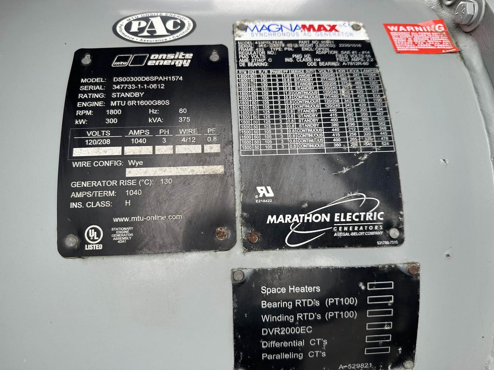 MTU 300 kW standby (275 kW prime) diesel generator set, model DS300, SN-347733-1-1-0612. MTU 6R1600G80S engine rated 460 HP at 1800 RPM, SN-16301001804, EPA Tier 3 emissions. 3/60/120/208V, 12 lead reconnectable to other voltages. 1200 Amp main-line circuit breaker. PMG - permanent magnet generator. Basler MCG- 2020 digital control panel. Battery charger. Coolant heater. UL listed stationary engine generator assembly. Sound attenuated enclosure. 525 gallon UL142 listed sub base fuel tank with secondary containment. 269 Hrs. Yr 2012. Load test pending. Overall dimensions 74W x 190L x 146H on 6H blocks, 12,250 lbs. FOB Waukesha, WI